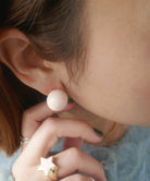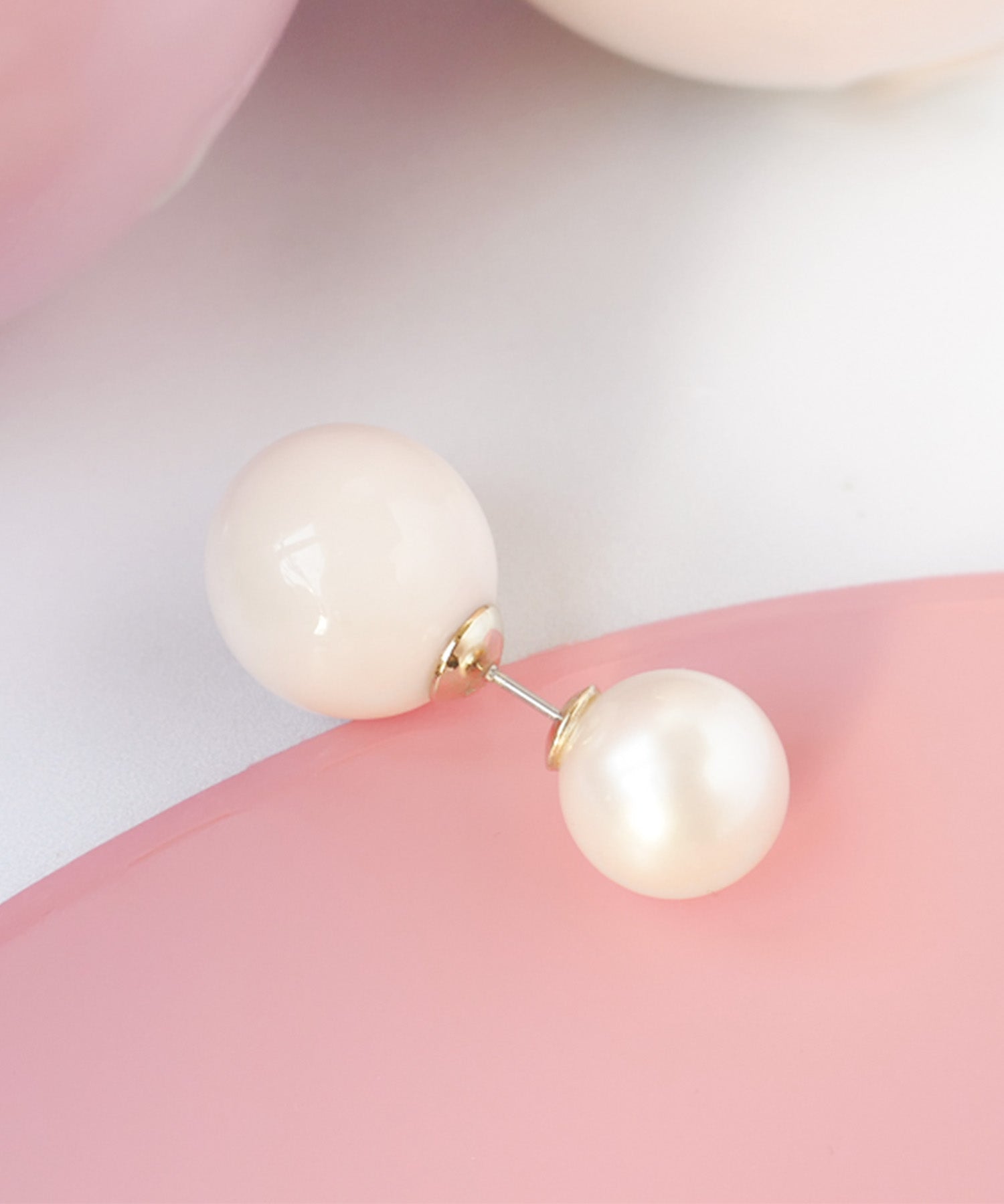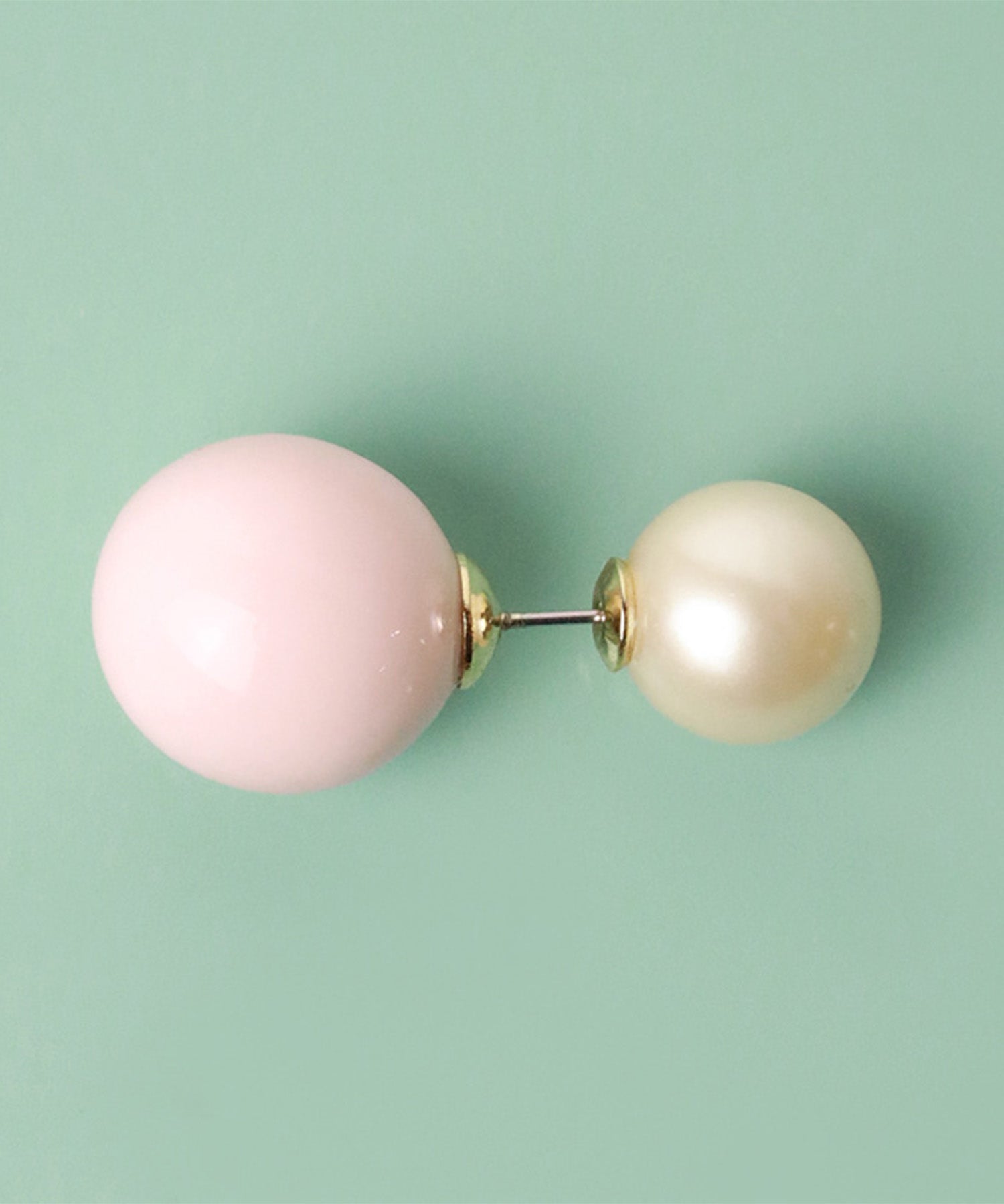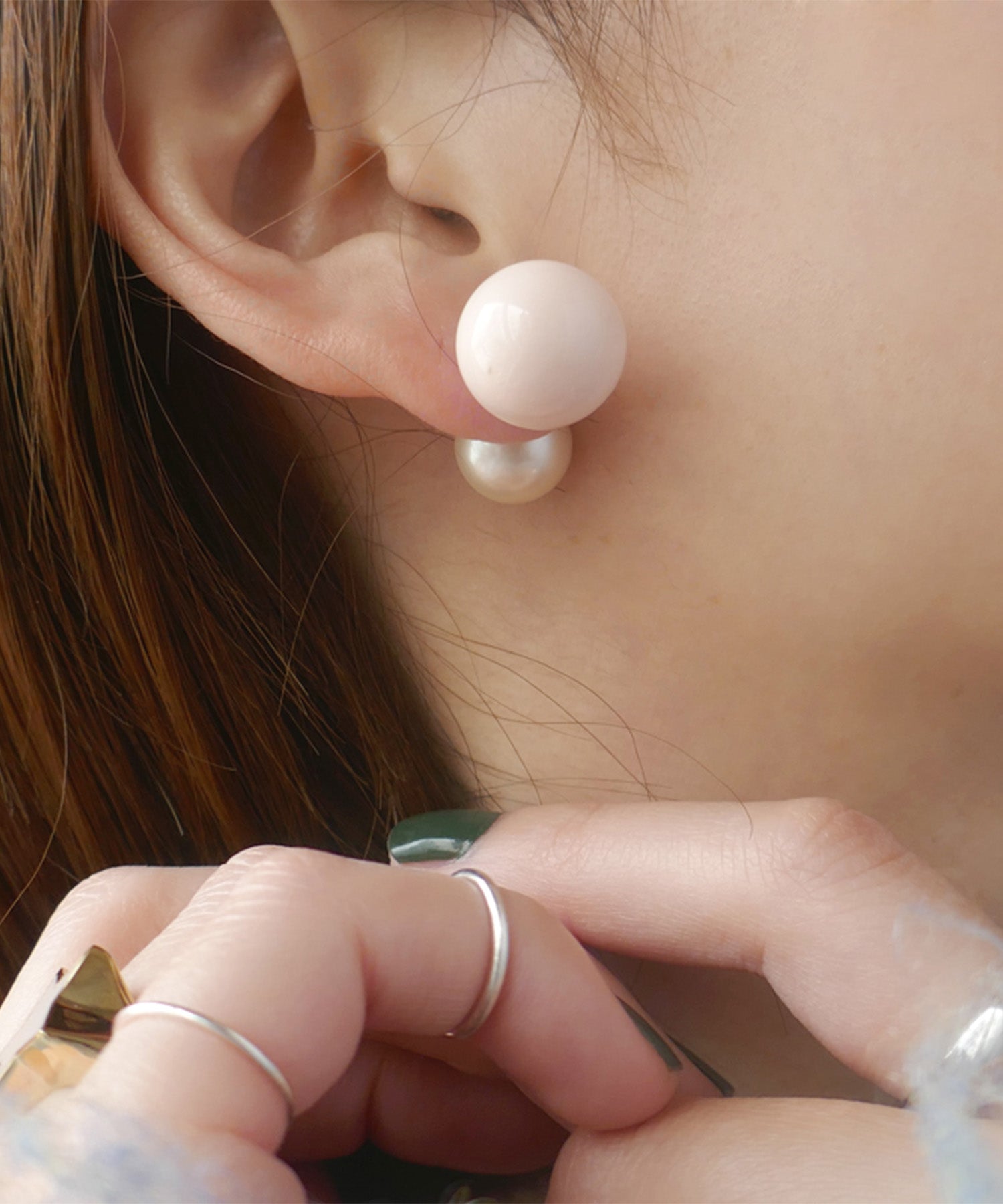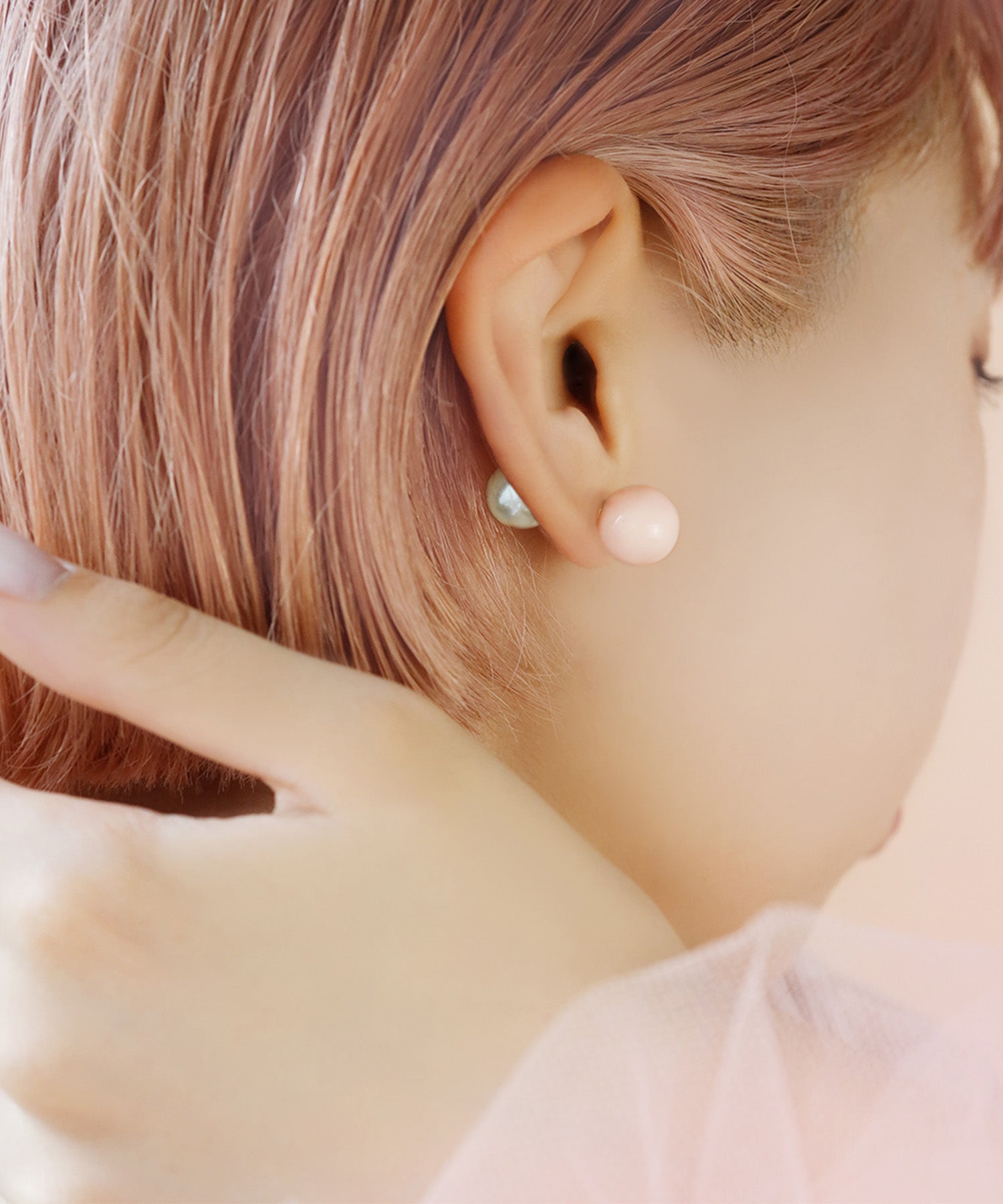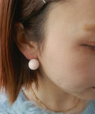 ピンクカラーの大粒の球体ピアス。デザインはシンプルなためスタイリングを選ばずに着用できます。