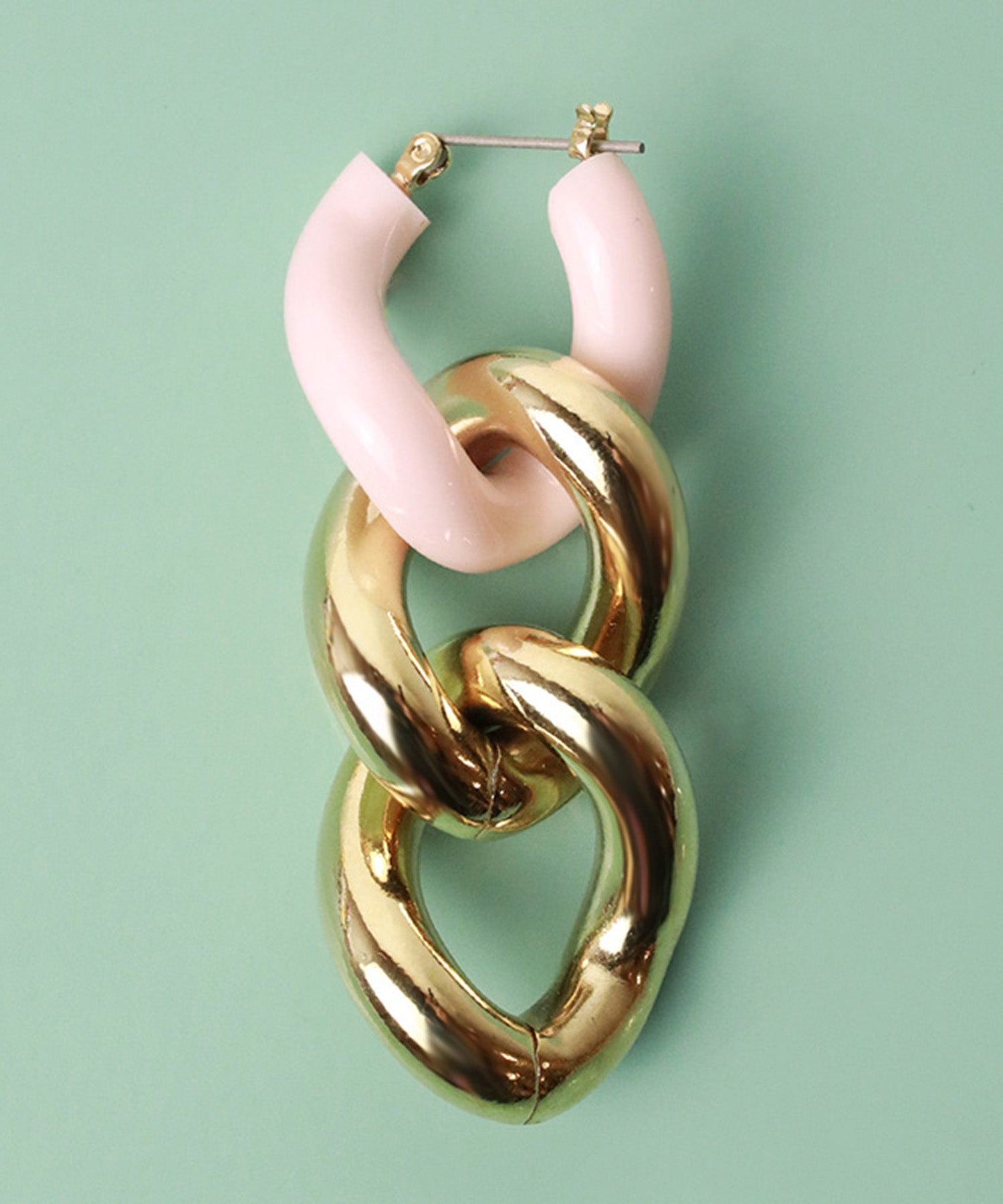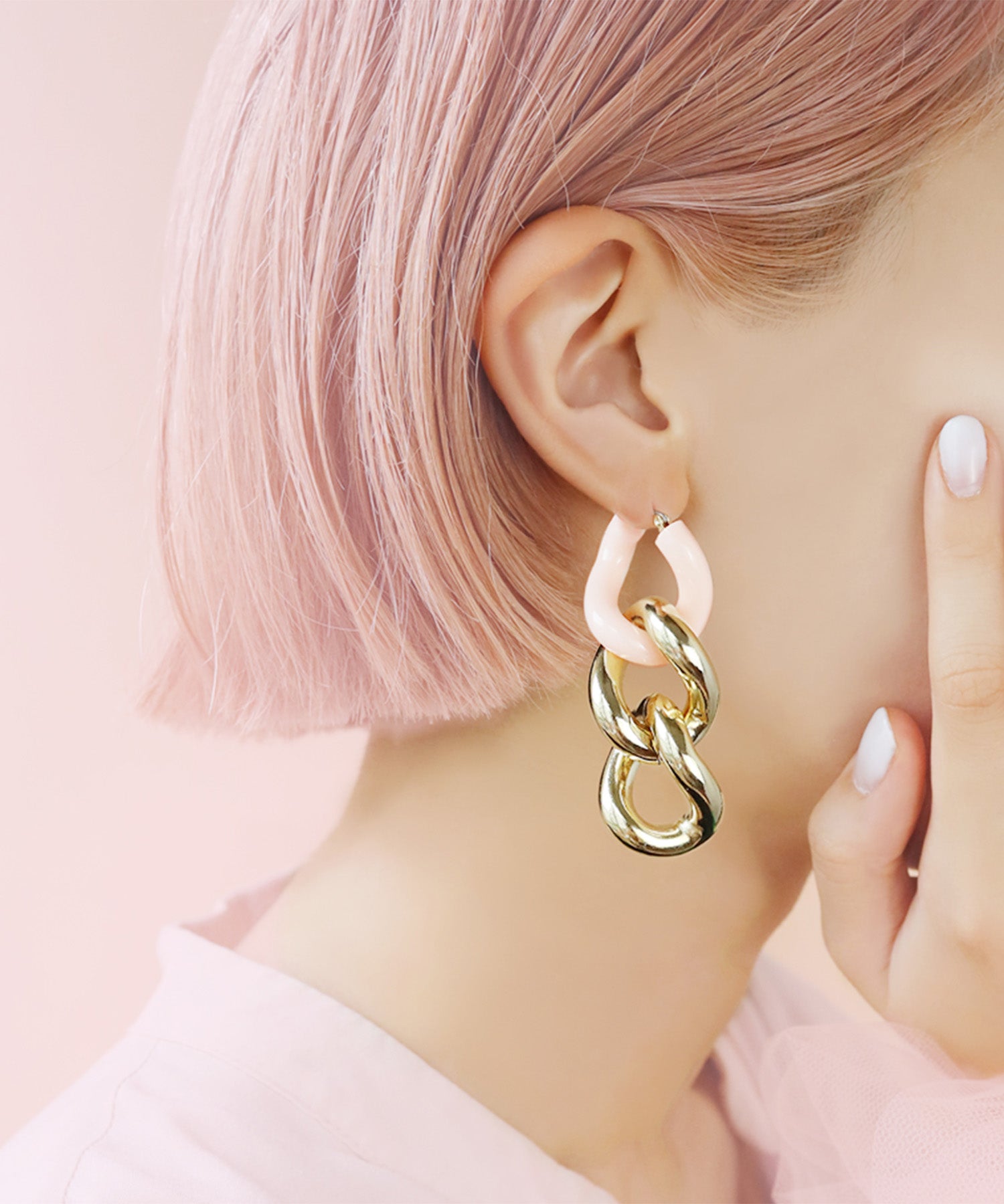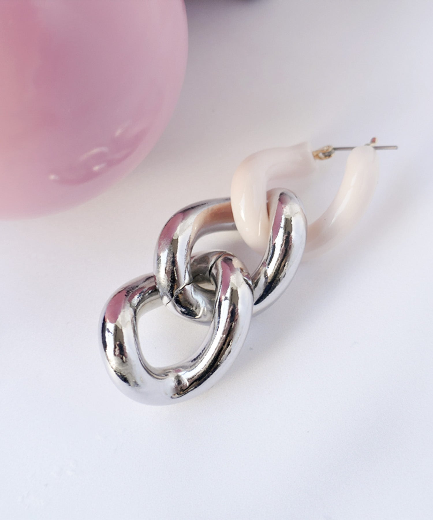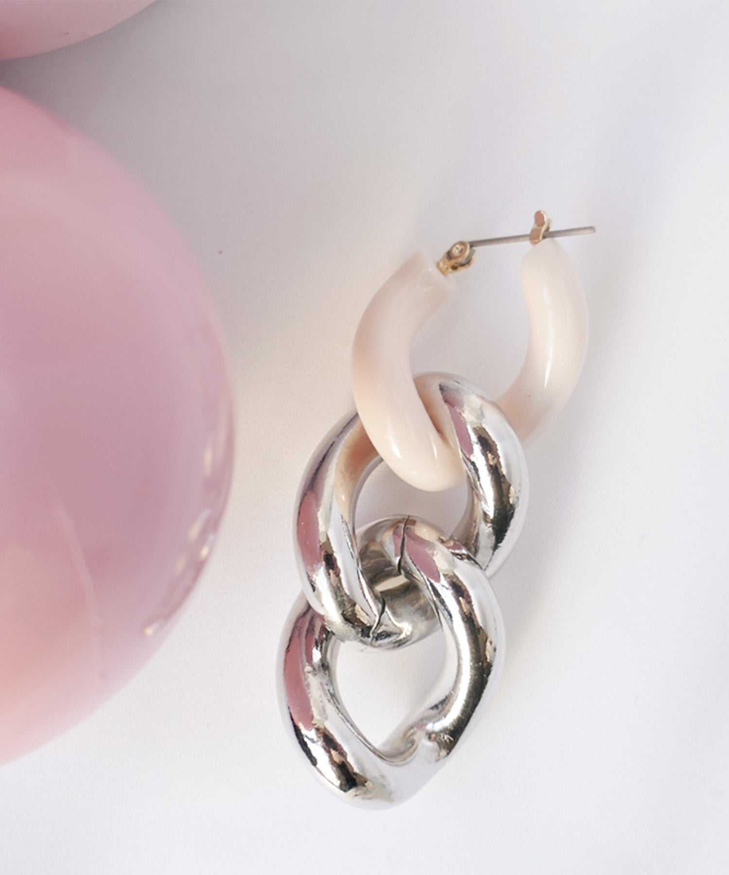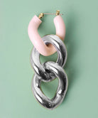 エッジィなビッグチェーンピアス。メタルにピンクカラーを入れることで