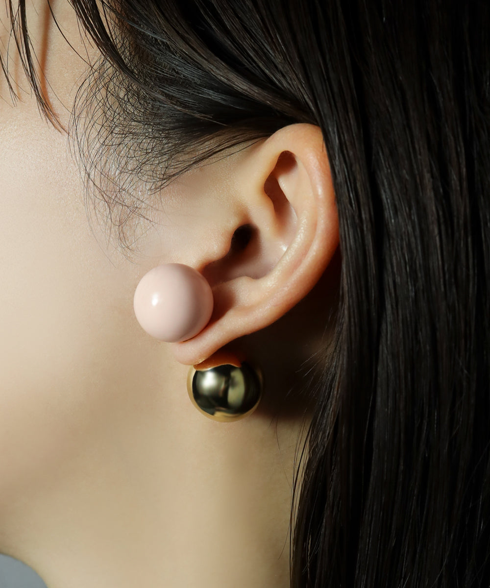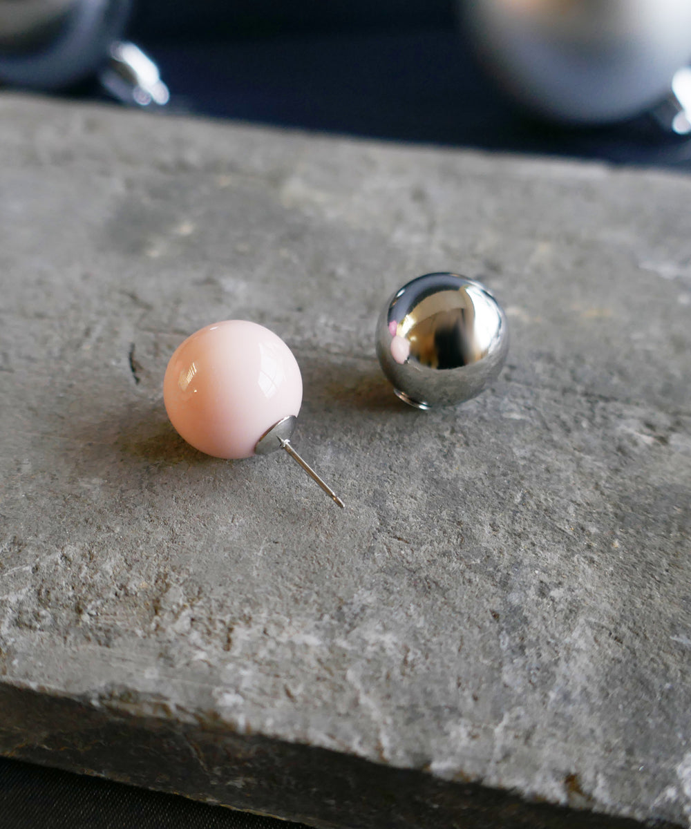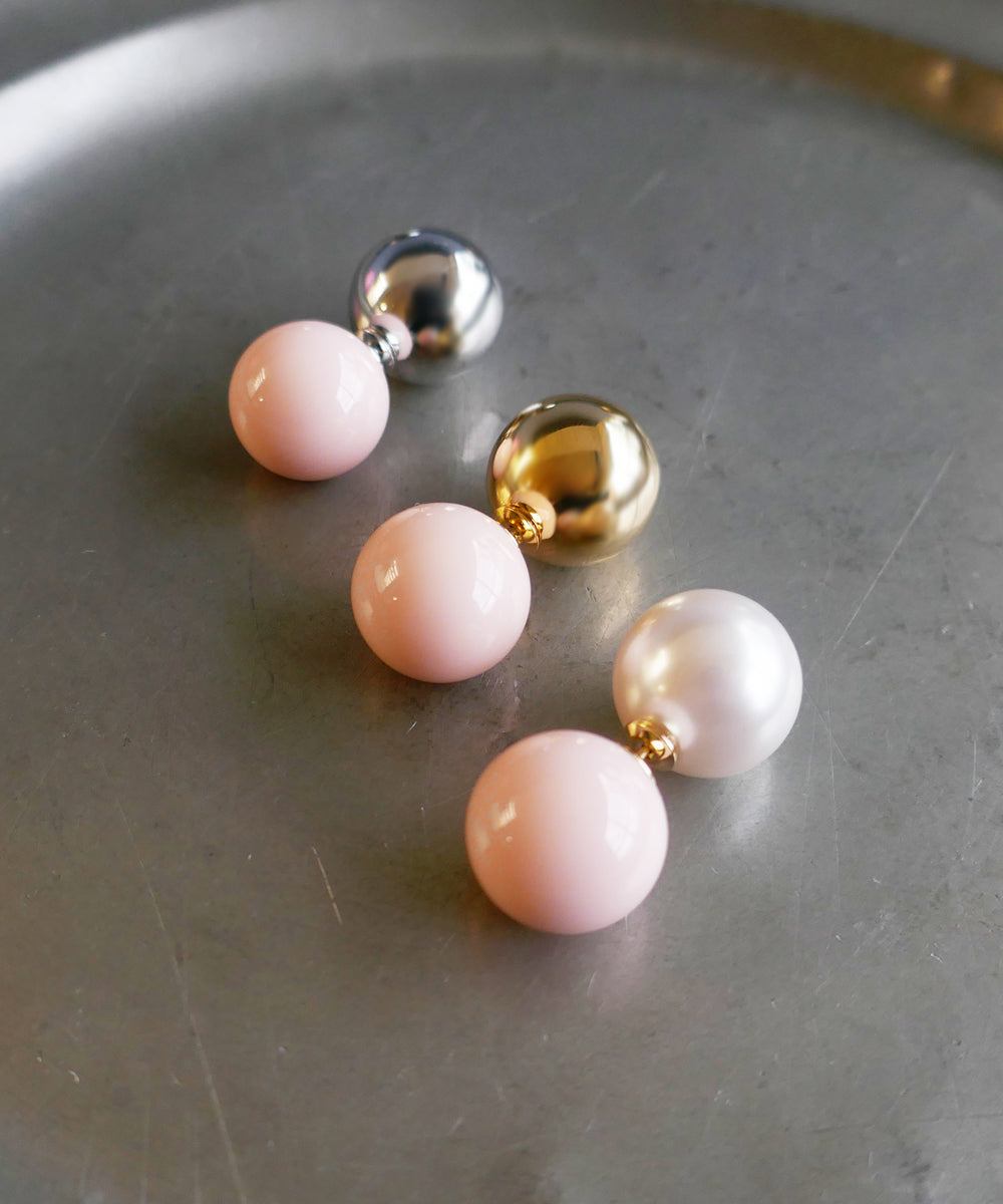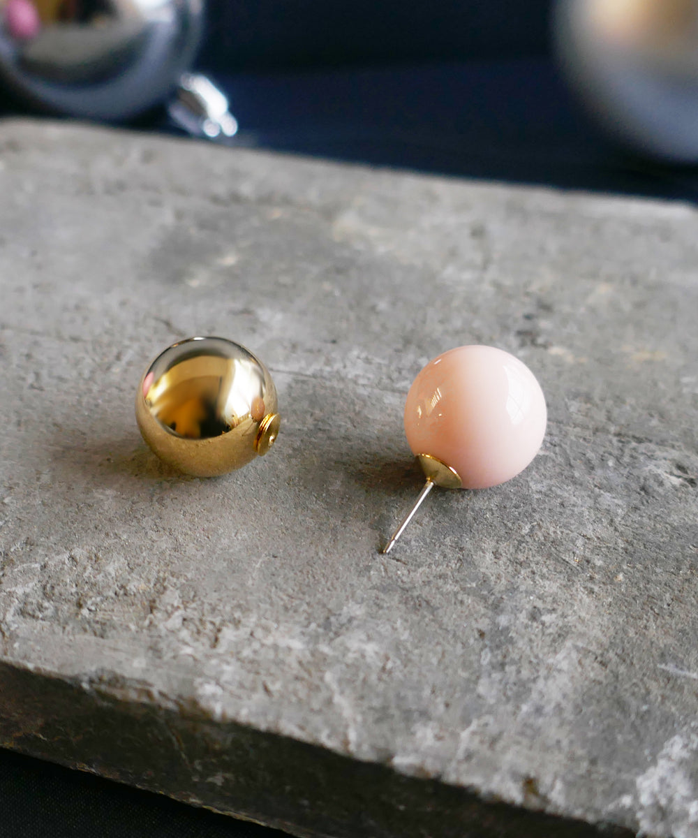 ピンクカラーの大粒ピアス。存在感のある球体もシンプルなデザインにより