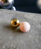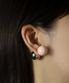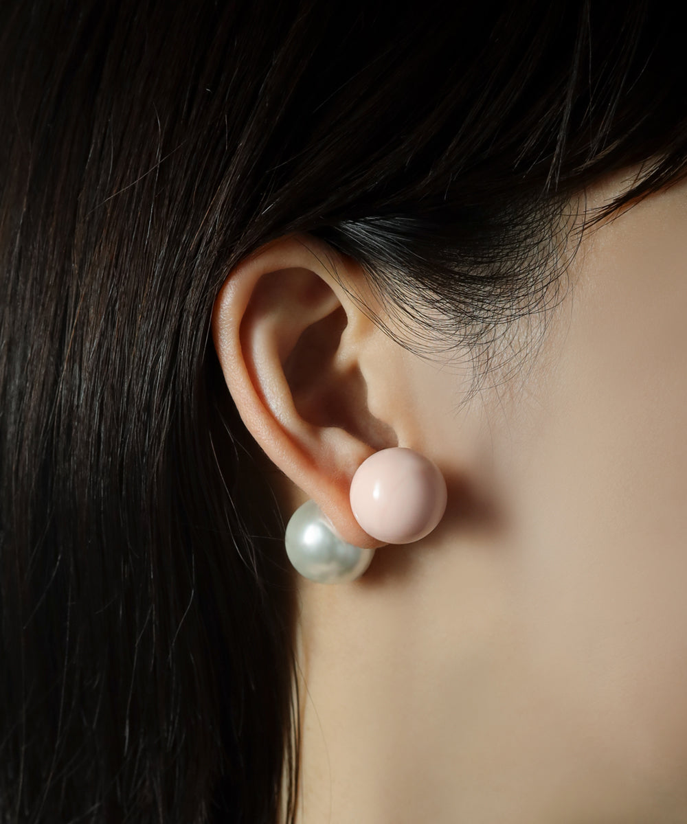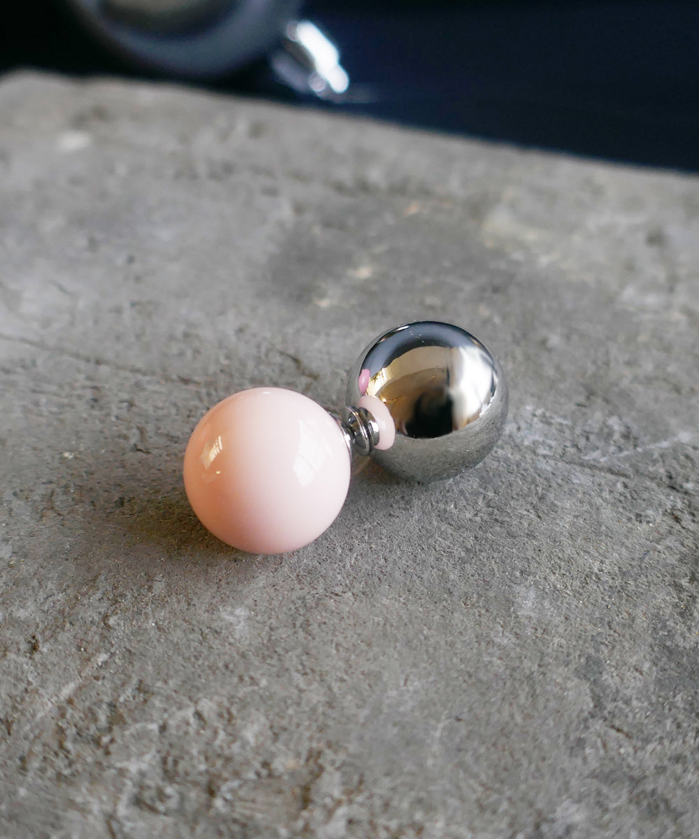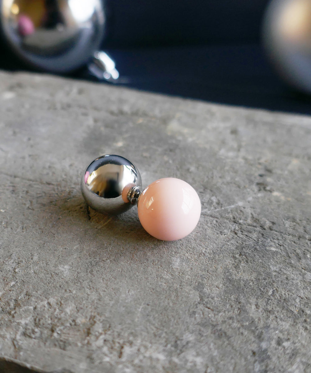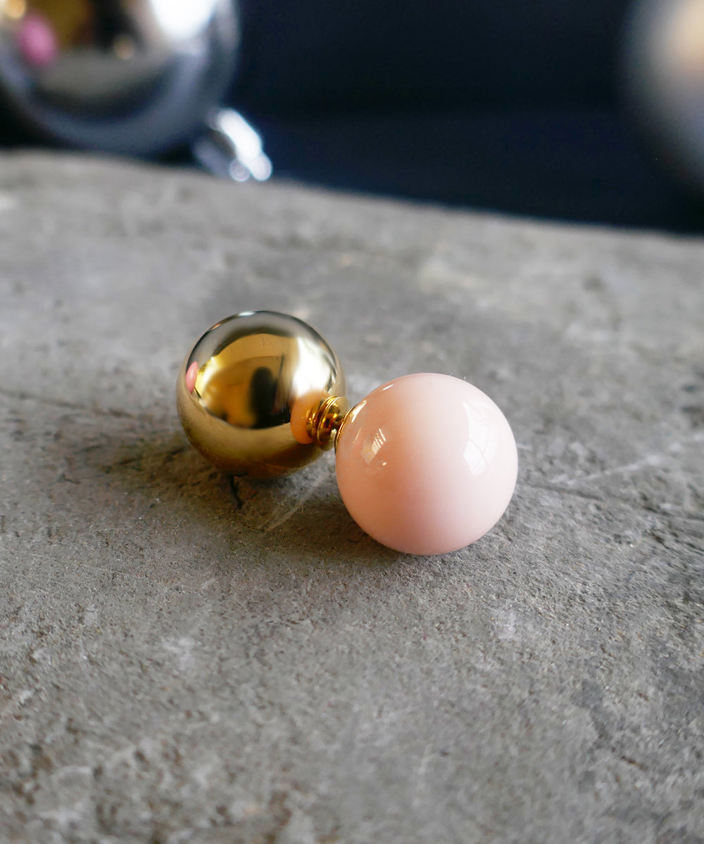 ピンクカラーの大粒ピアス。存在感のある球体もシンプルなデザインにより