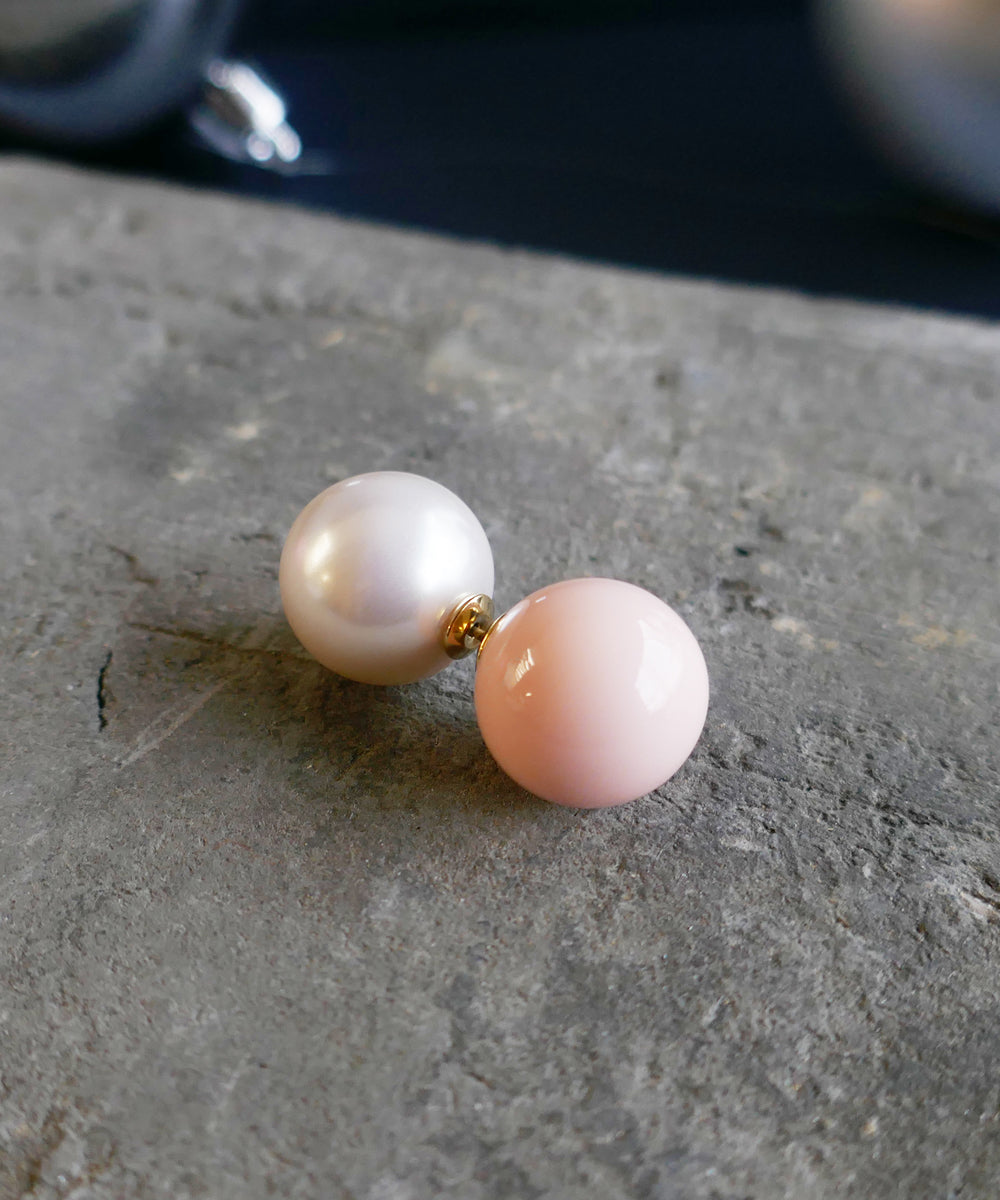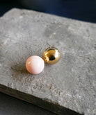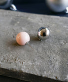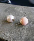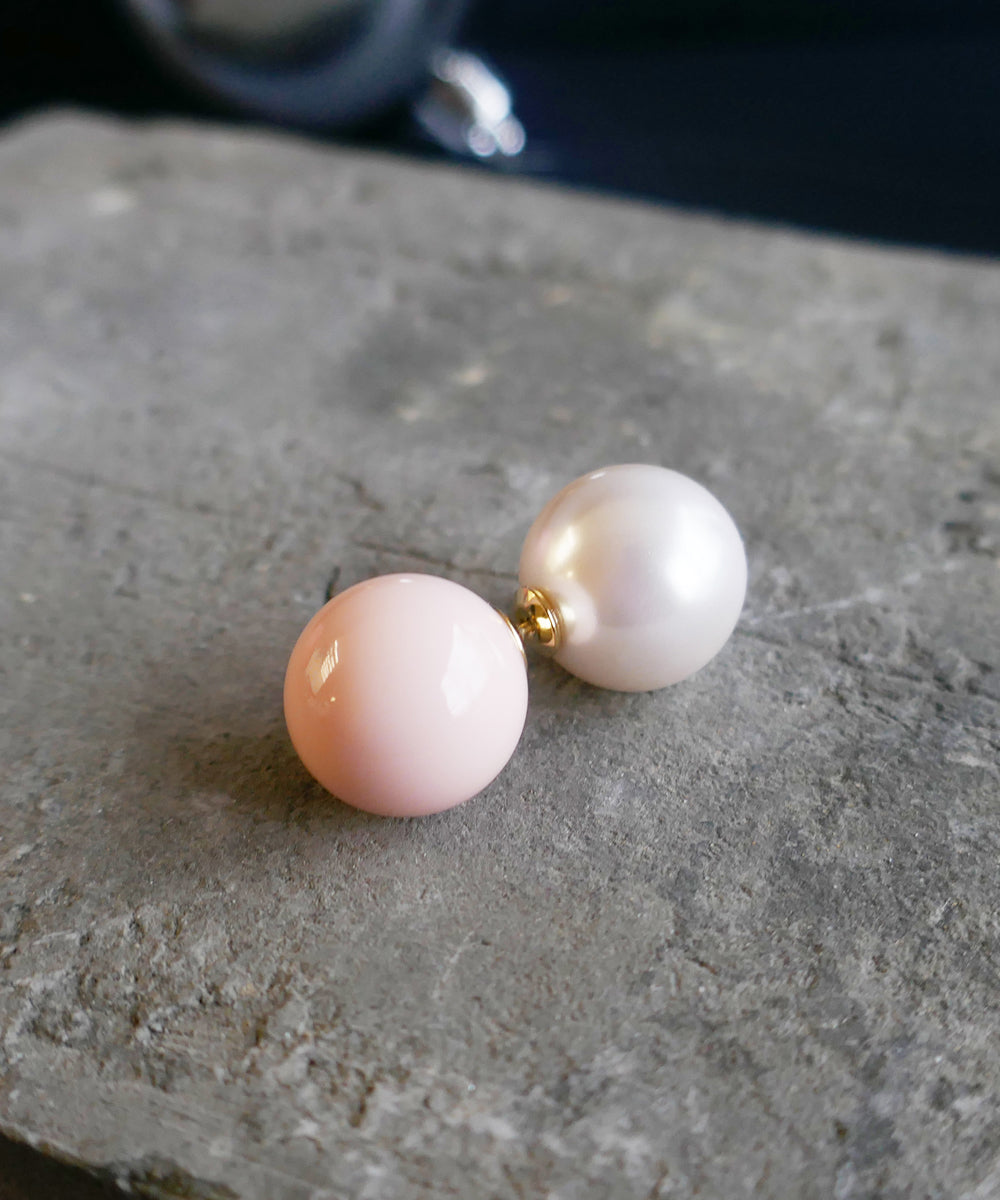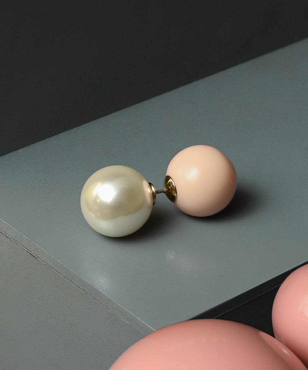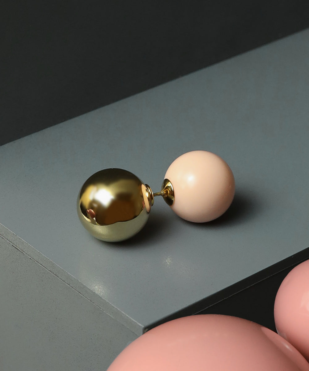 ピンクカラーの大粒ピアス。存在感のある球体もシンプルなデザインにより