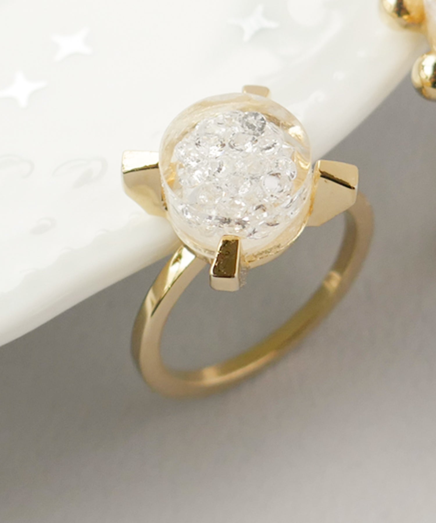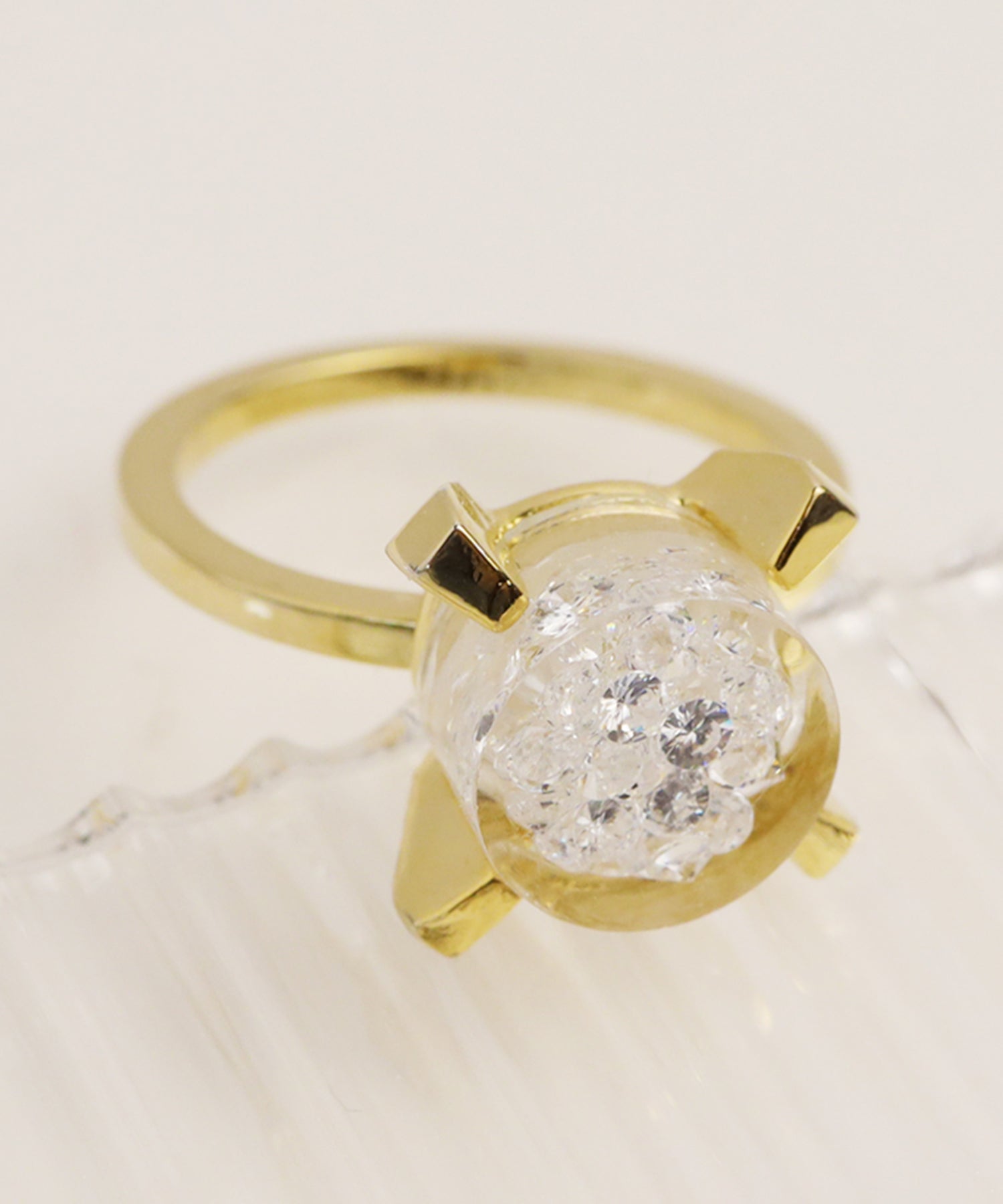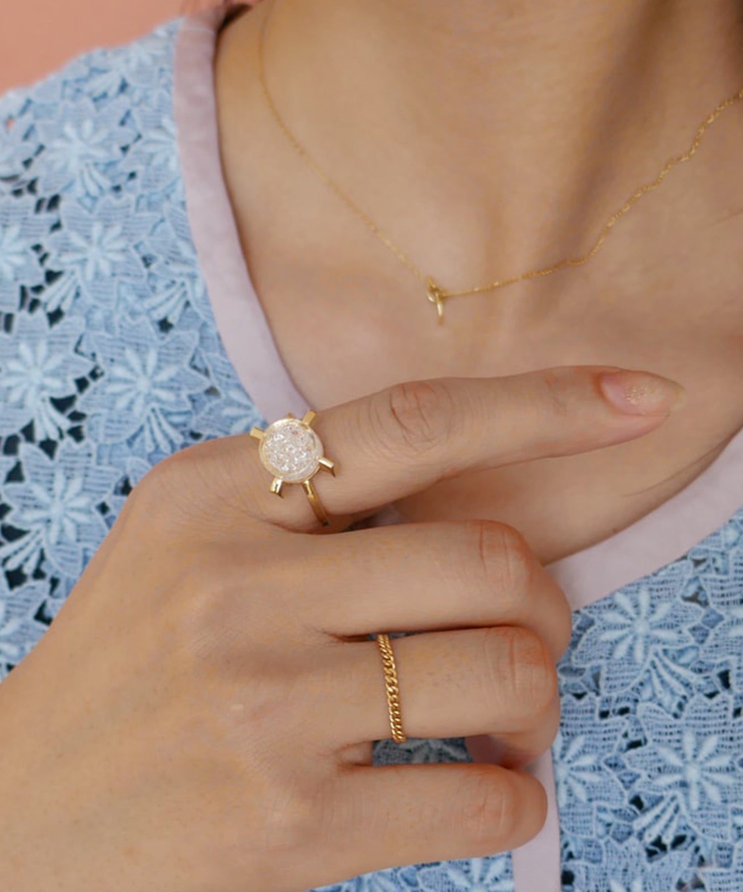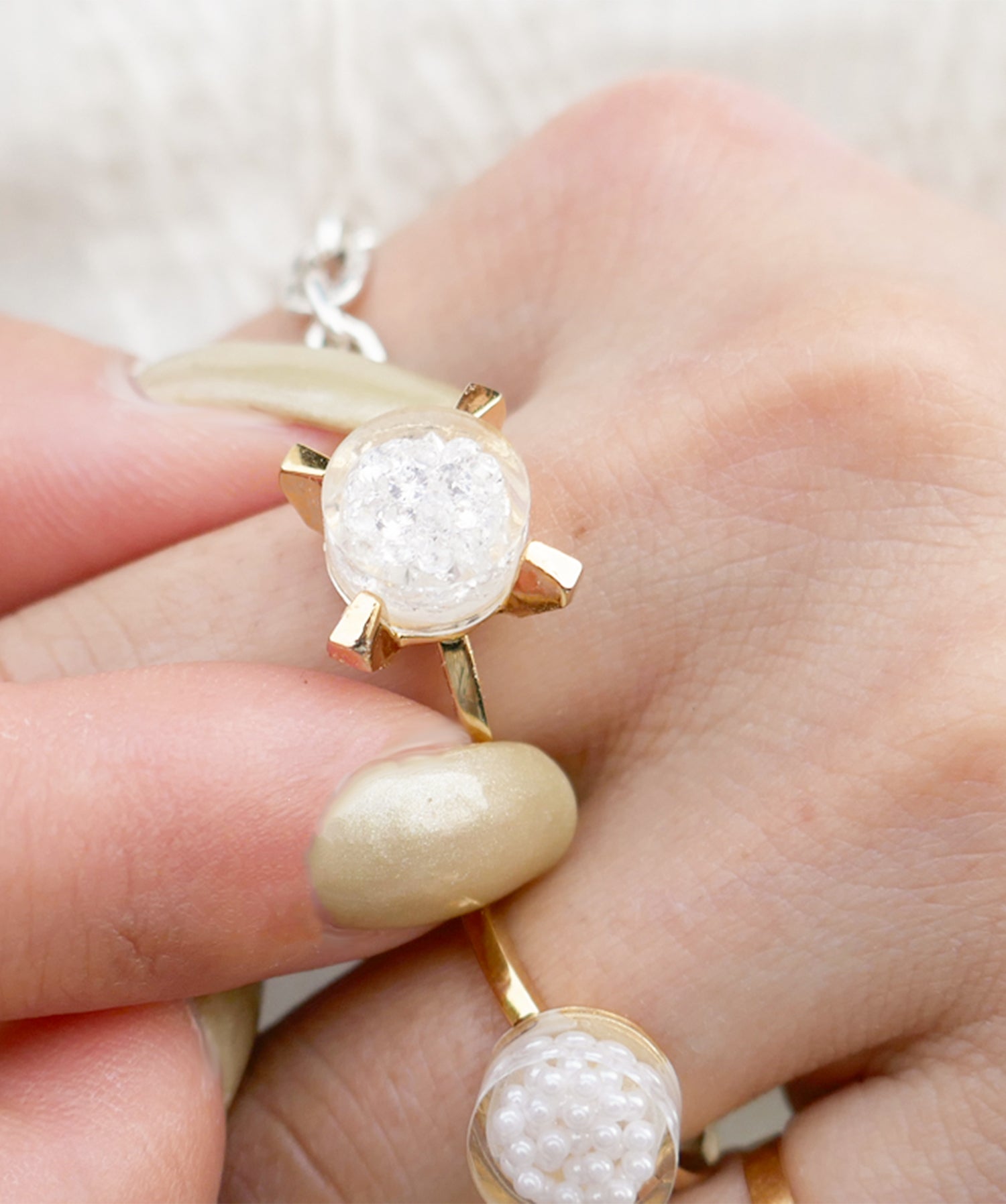 小さなパールとクリアとゴールドの指輪。大好きがたくさん詰まったご褒美みたいなアイテムです。モチーフを飾るタテ爪がより上品な印象に。すっきりさせたアームは重ね着けもしやすく重ね着けにもおすすめ。