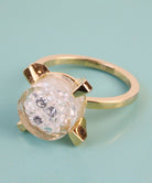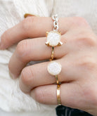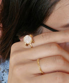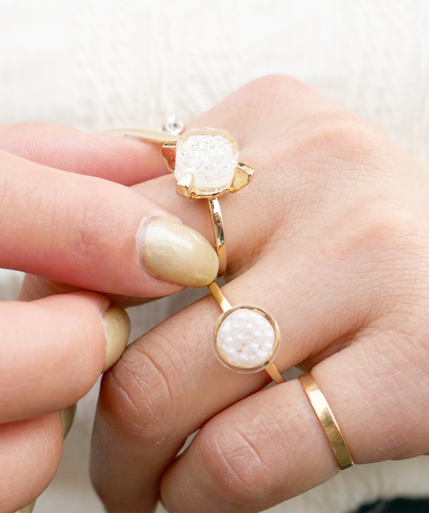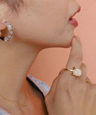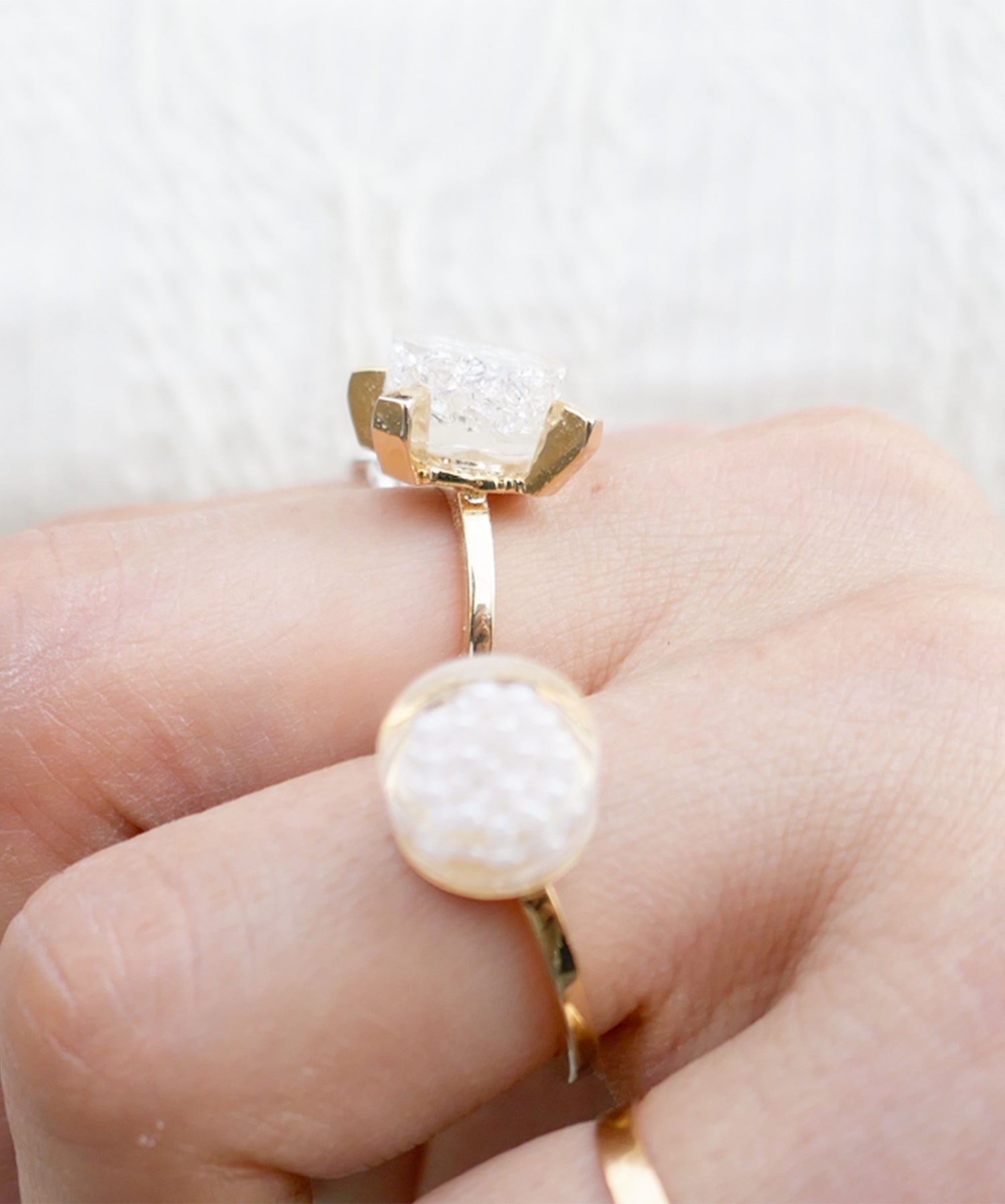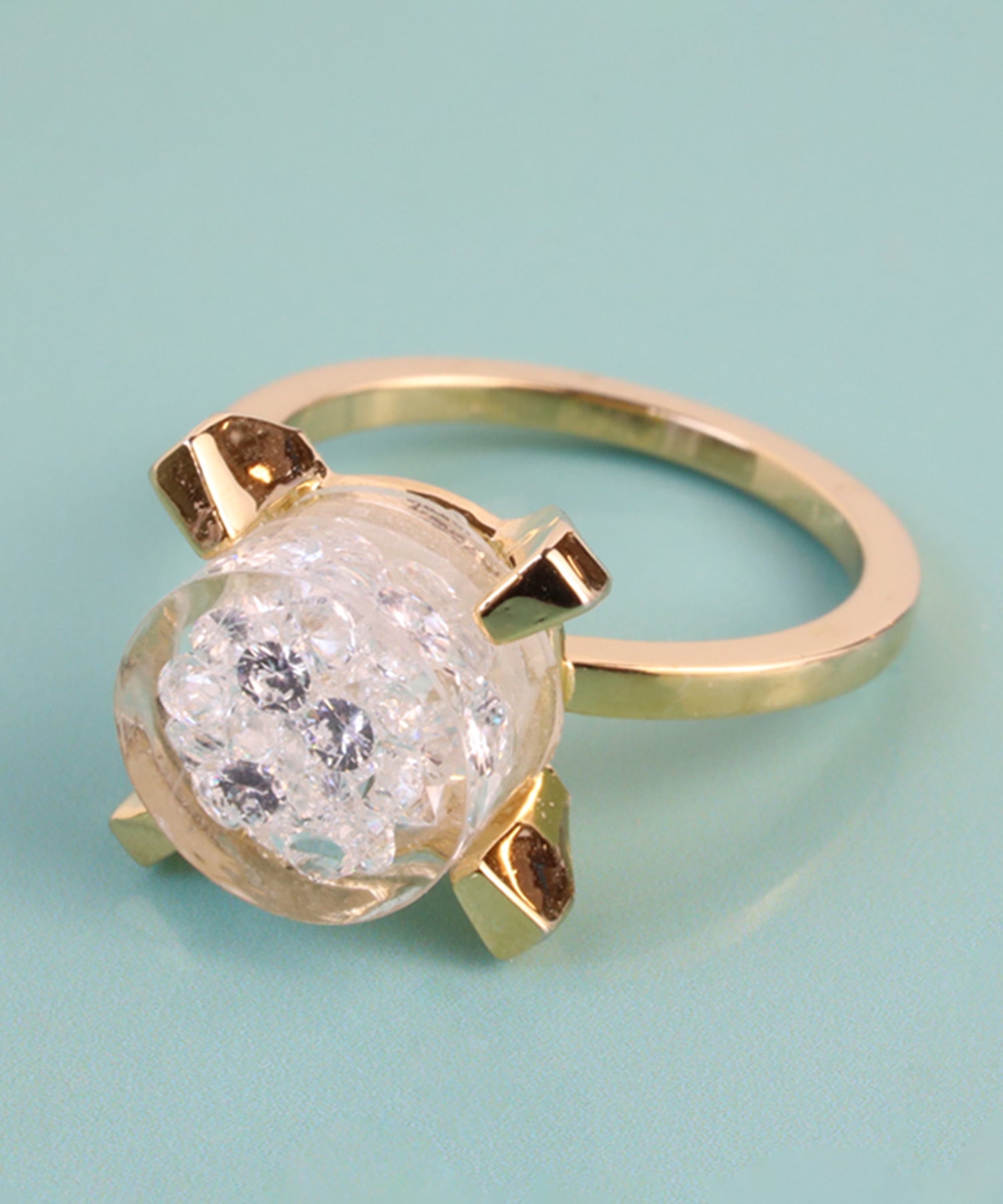 小さなパールとクリアとゴールドの指輪。大好きがたくさん詰まったご褒美みたいなアイテムです。モチーフを飾るタテ爪がより上品な印象に。すっきりさせたアームは重ね着けもしやすく重ね着けにもおすすめ。