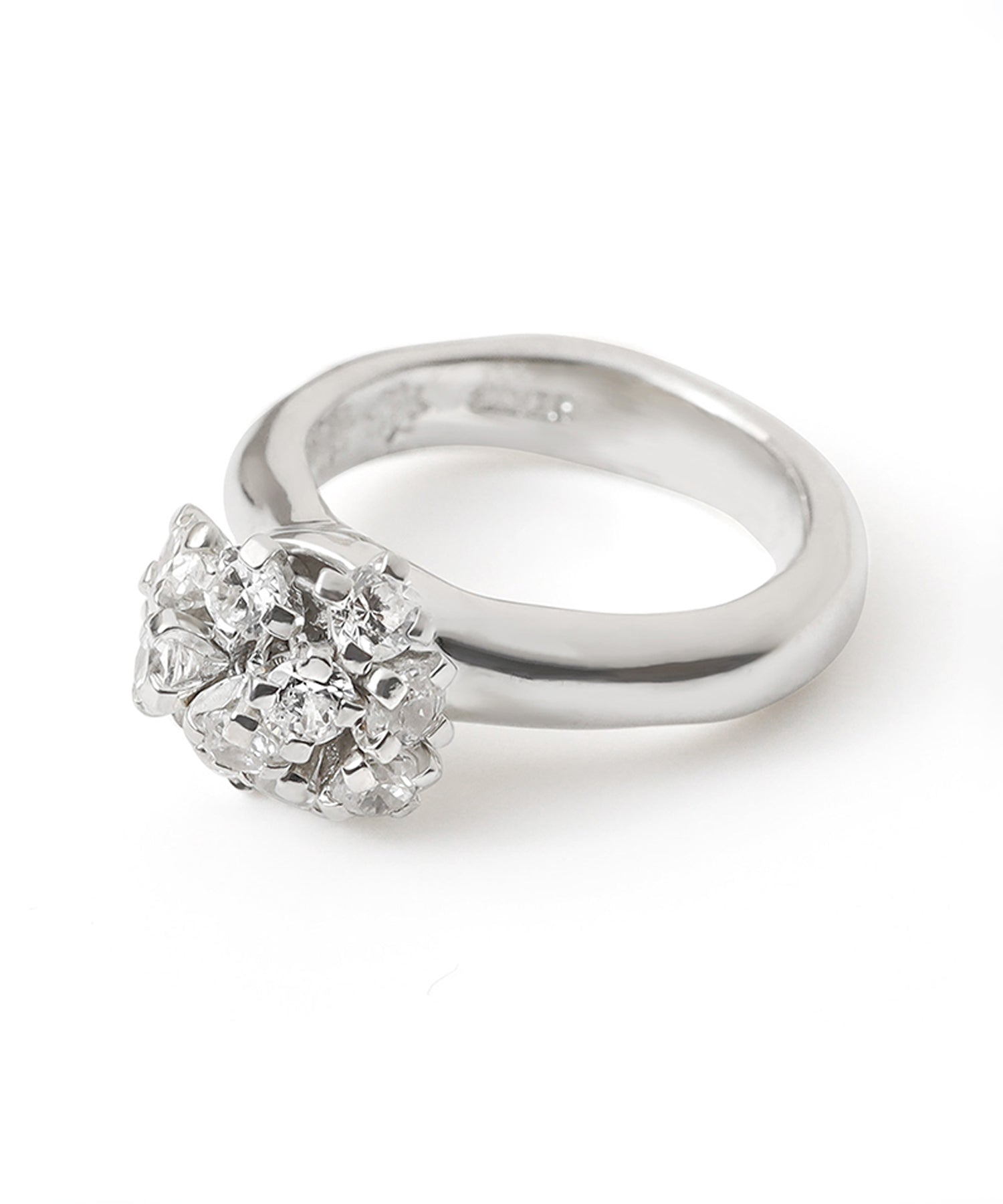 小さなキュービックジルコニアがたくさんついたリング。シャラシャラと揺れるキュービックジルコニアの輝きが魅力的。