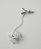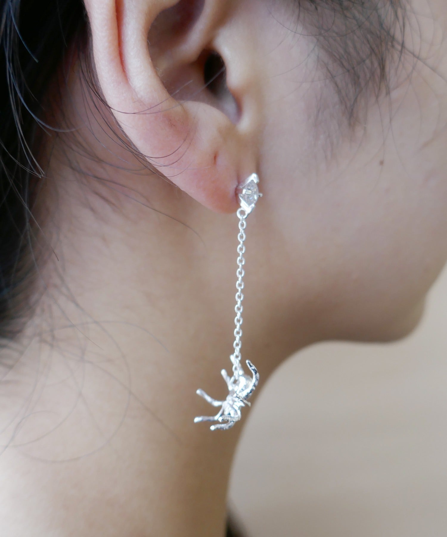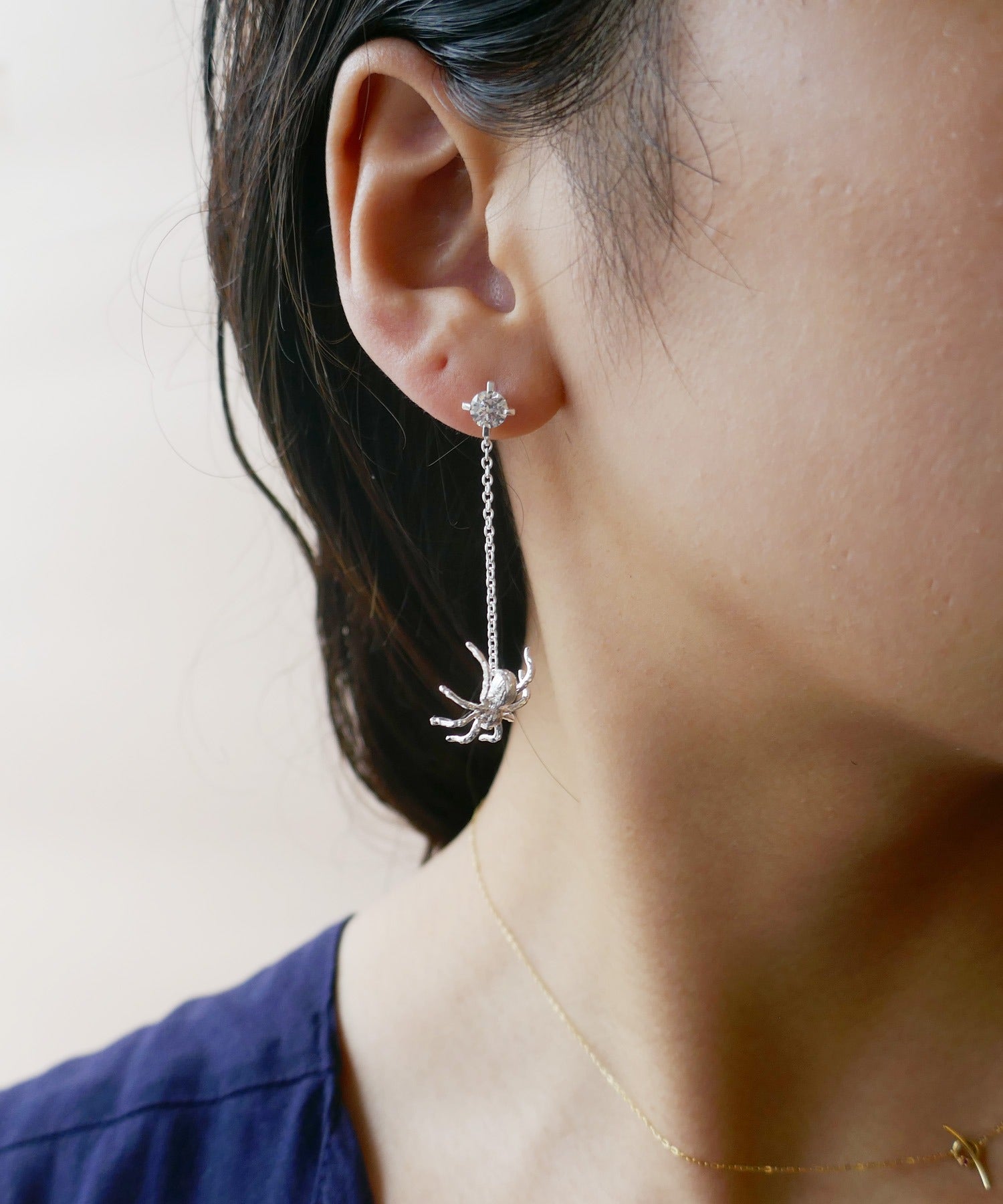 チェーンの先でクモのモチーフ揺れ動く遊び心あふれるデザインのピアス。