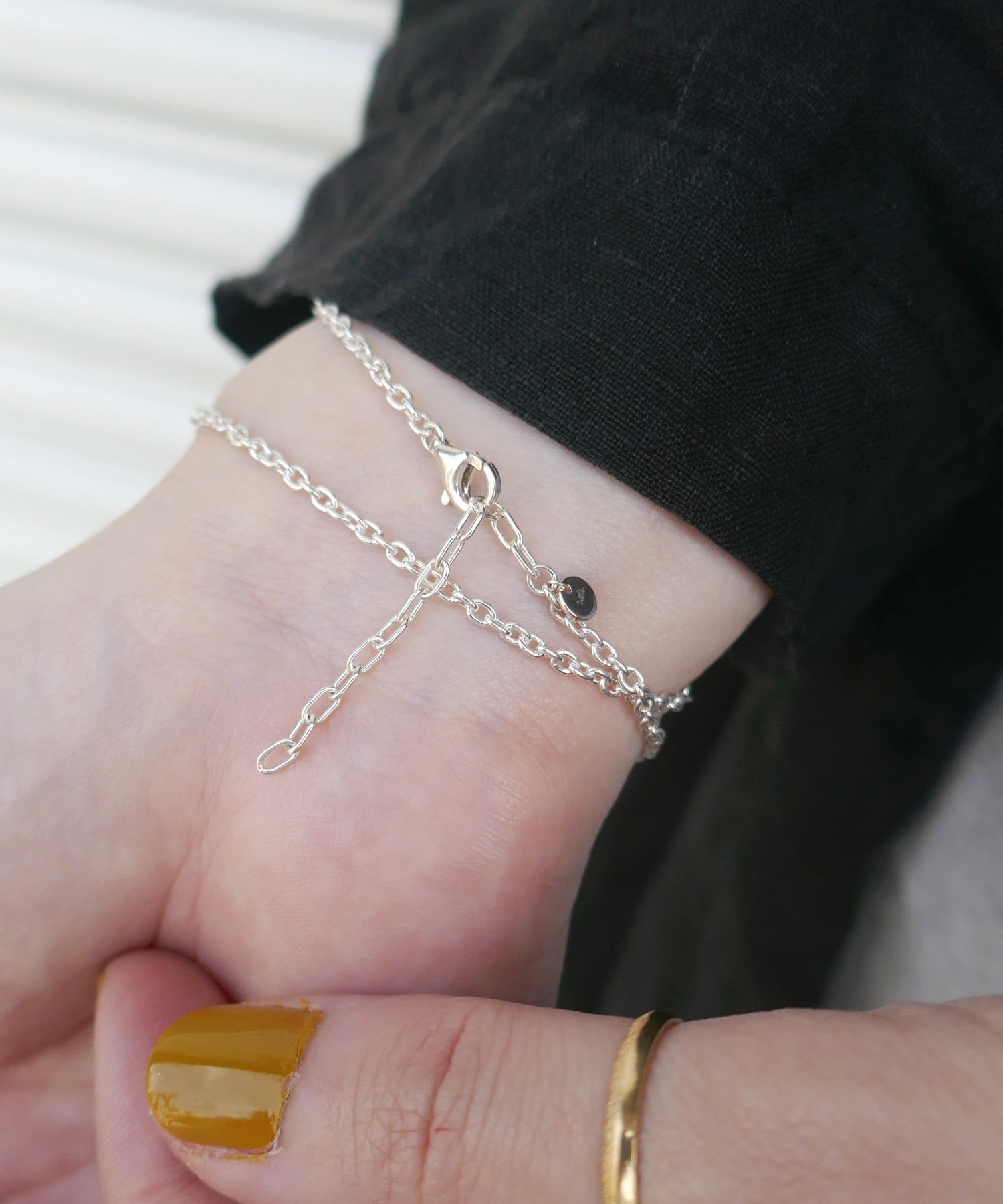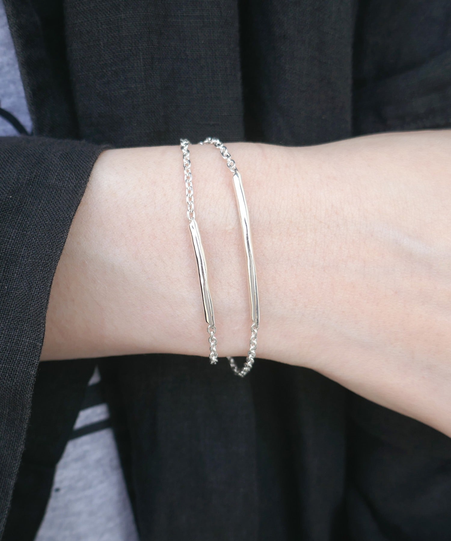 シルバーの2連ブレスレット。着用時に2本のバーが