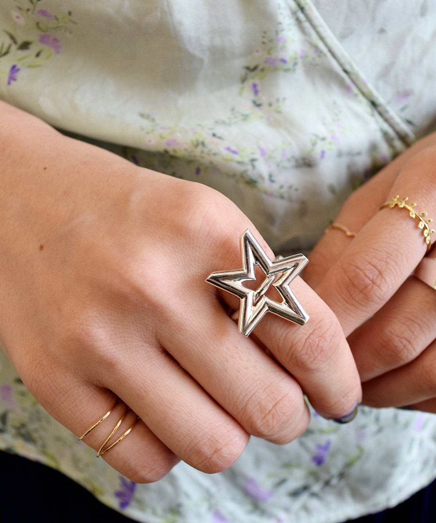 シンプルでありながらシンボリックなデザインは、エッジを効かせたシャープなフォルムとシルバーのマテリアルで仕立ることでポップなニュアンスは残しつつも甘すぎない印象に。