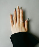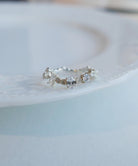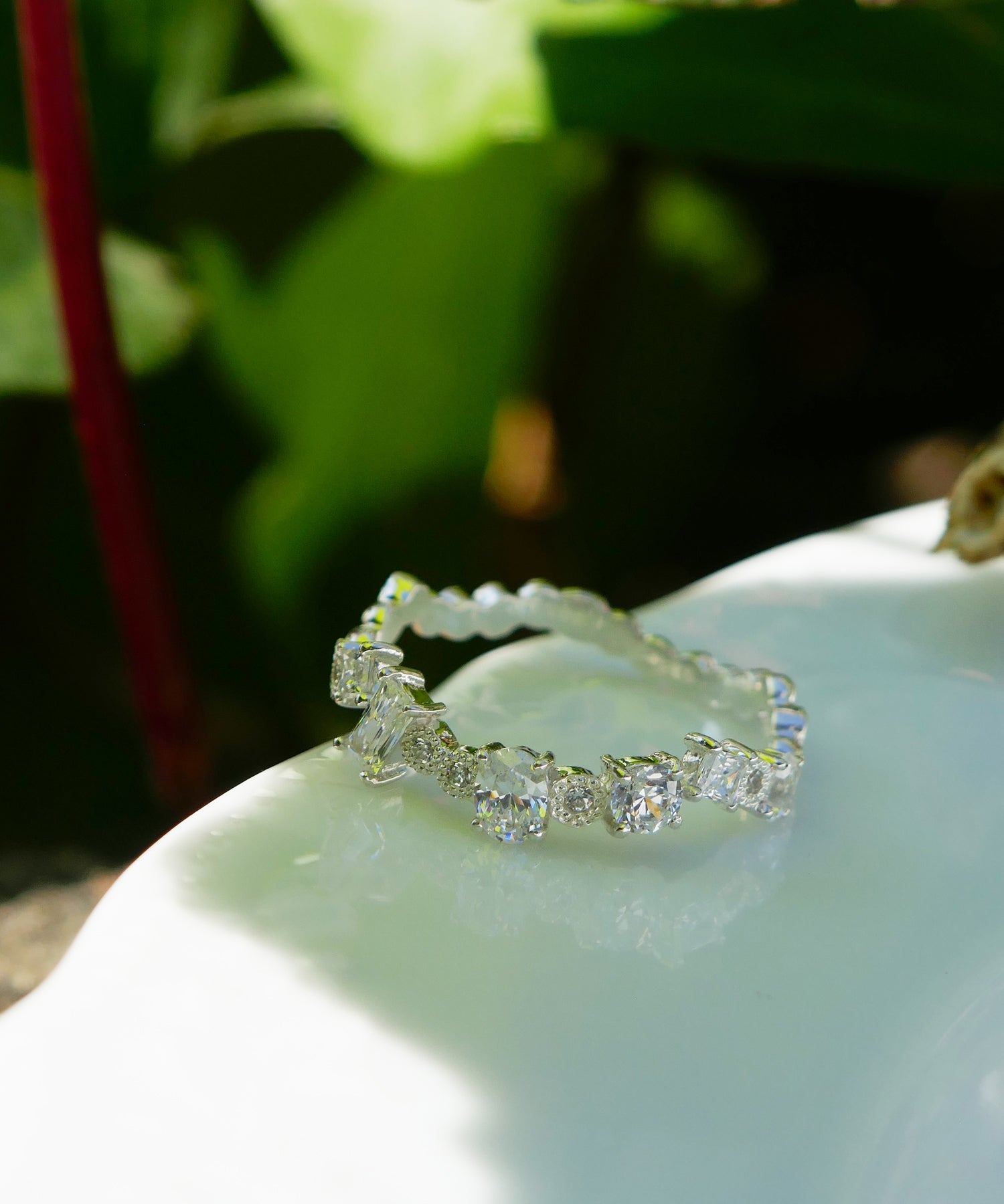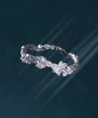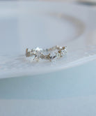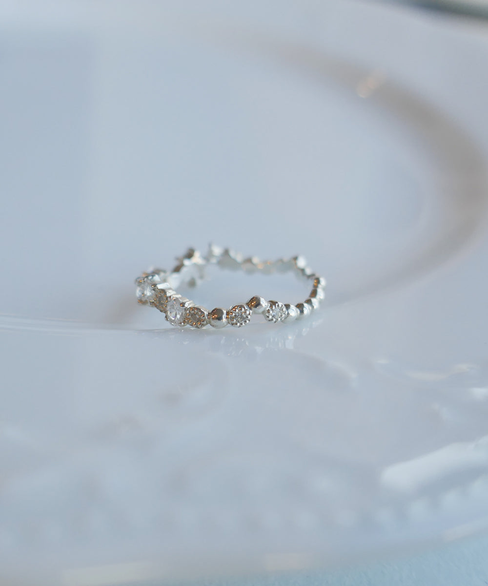 さまざまなカットのキュービックジルコニアがランダムにセッティングされたリング。