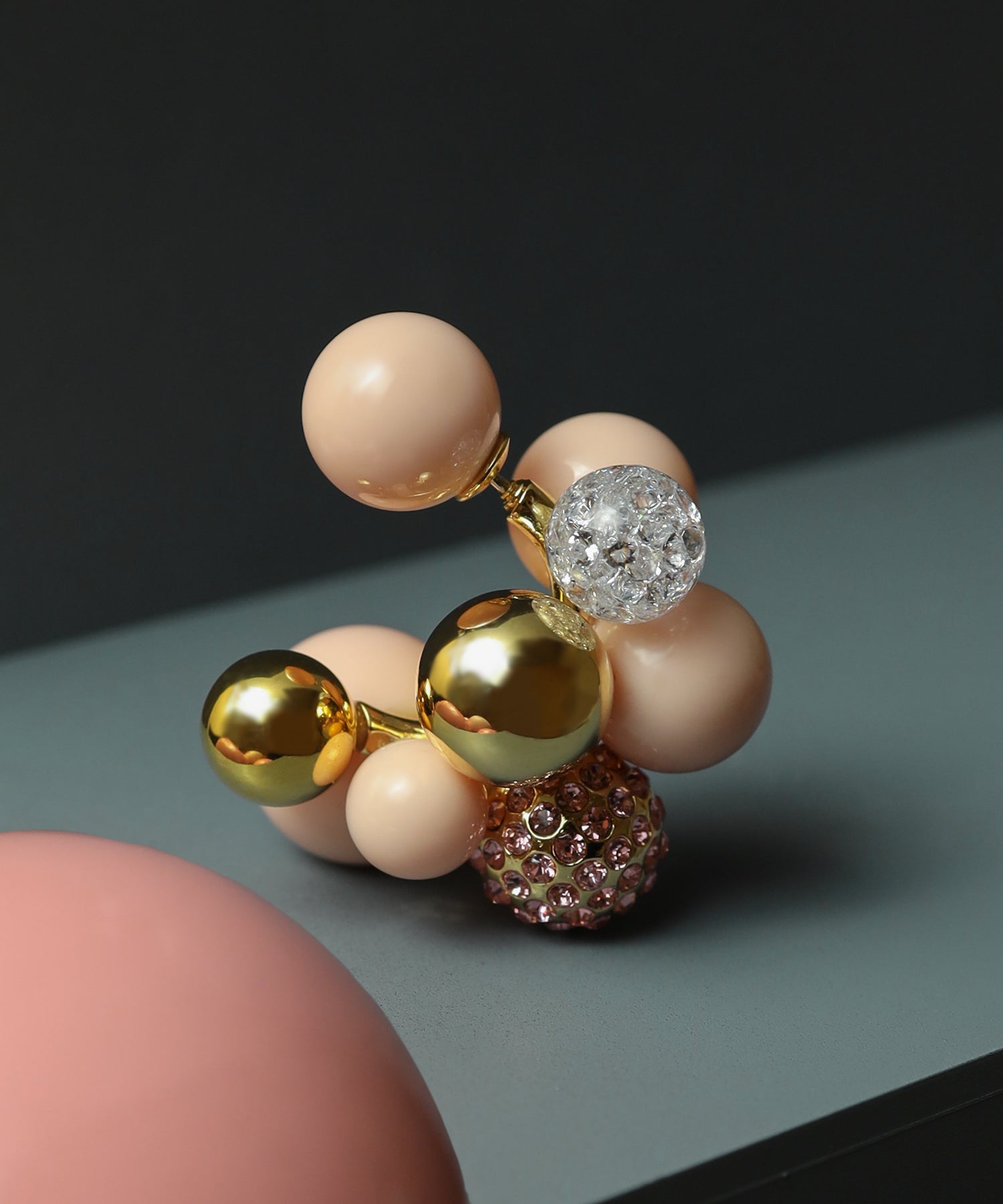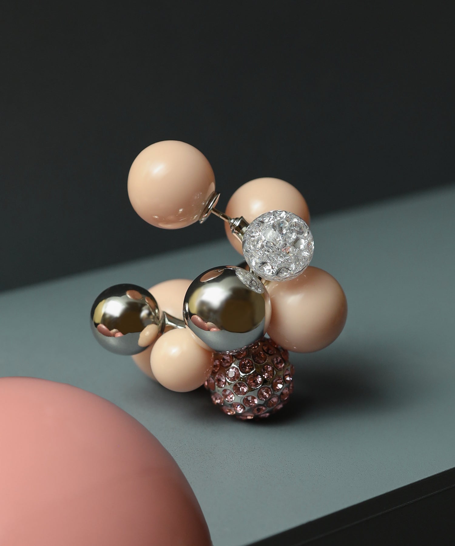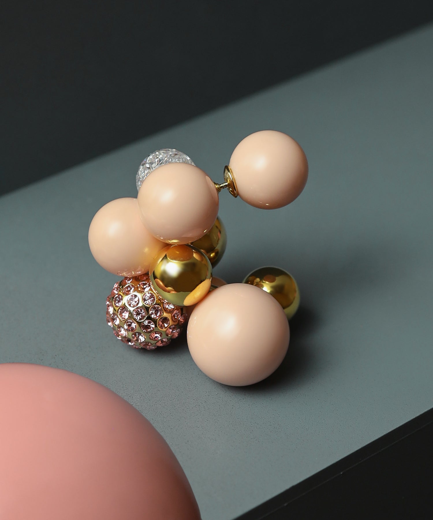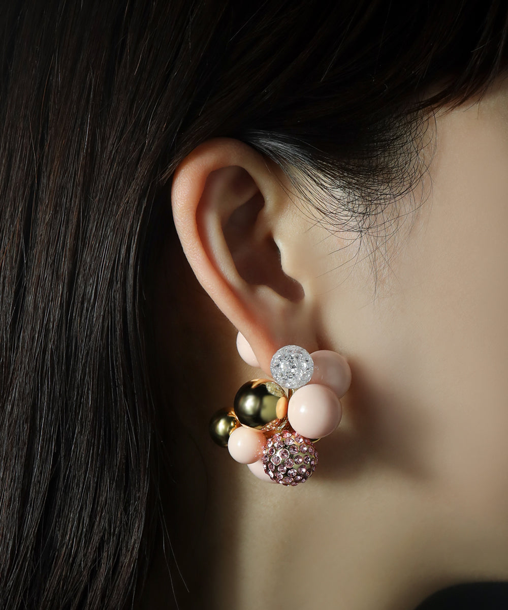 大きさや質感の異なる球体をランダムにセッティングしたピアス。