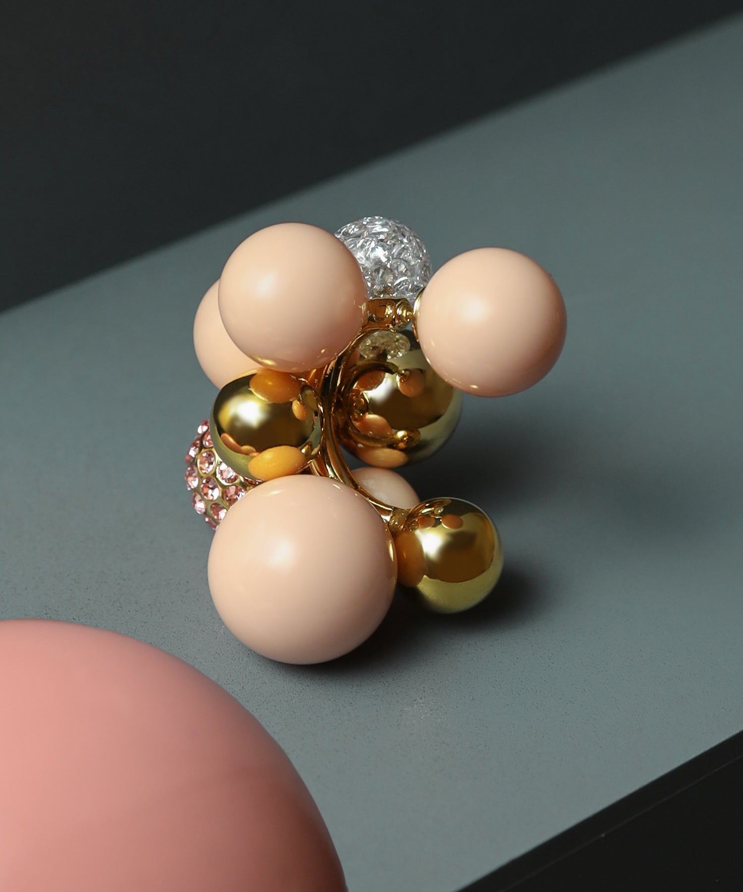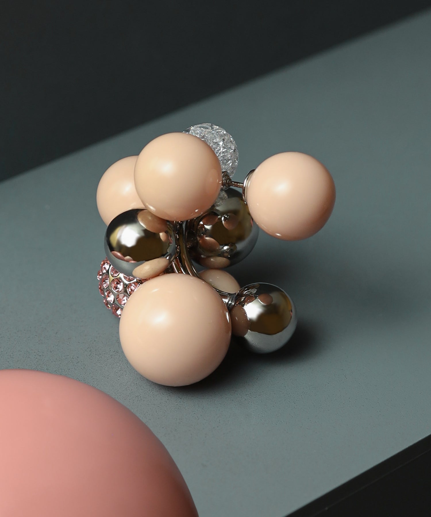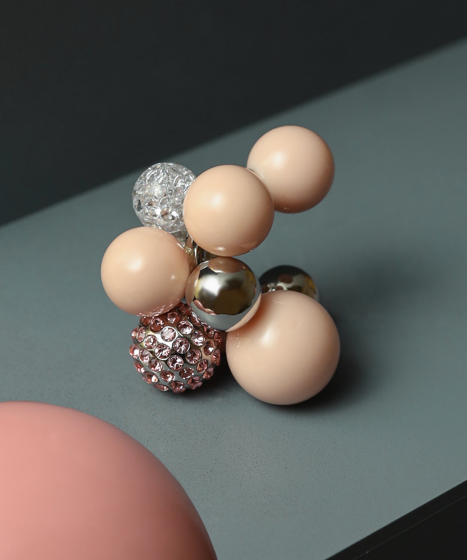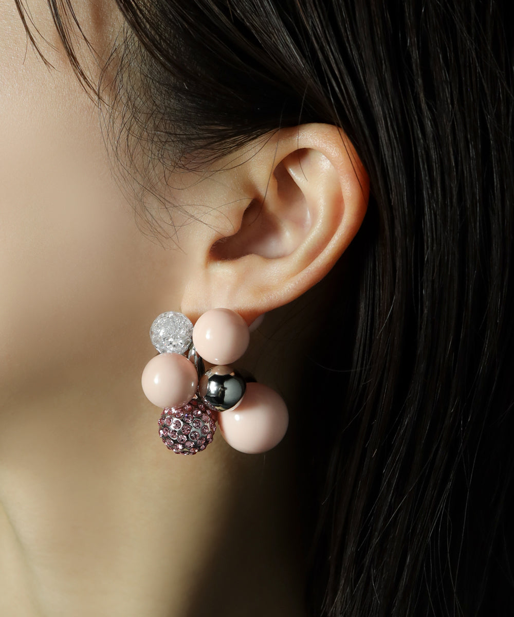 大きさや質感の異なる球体をランダムにセッティングしたピアス。