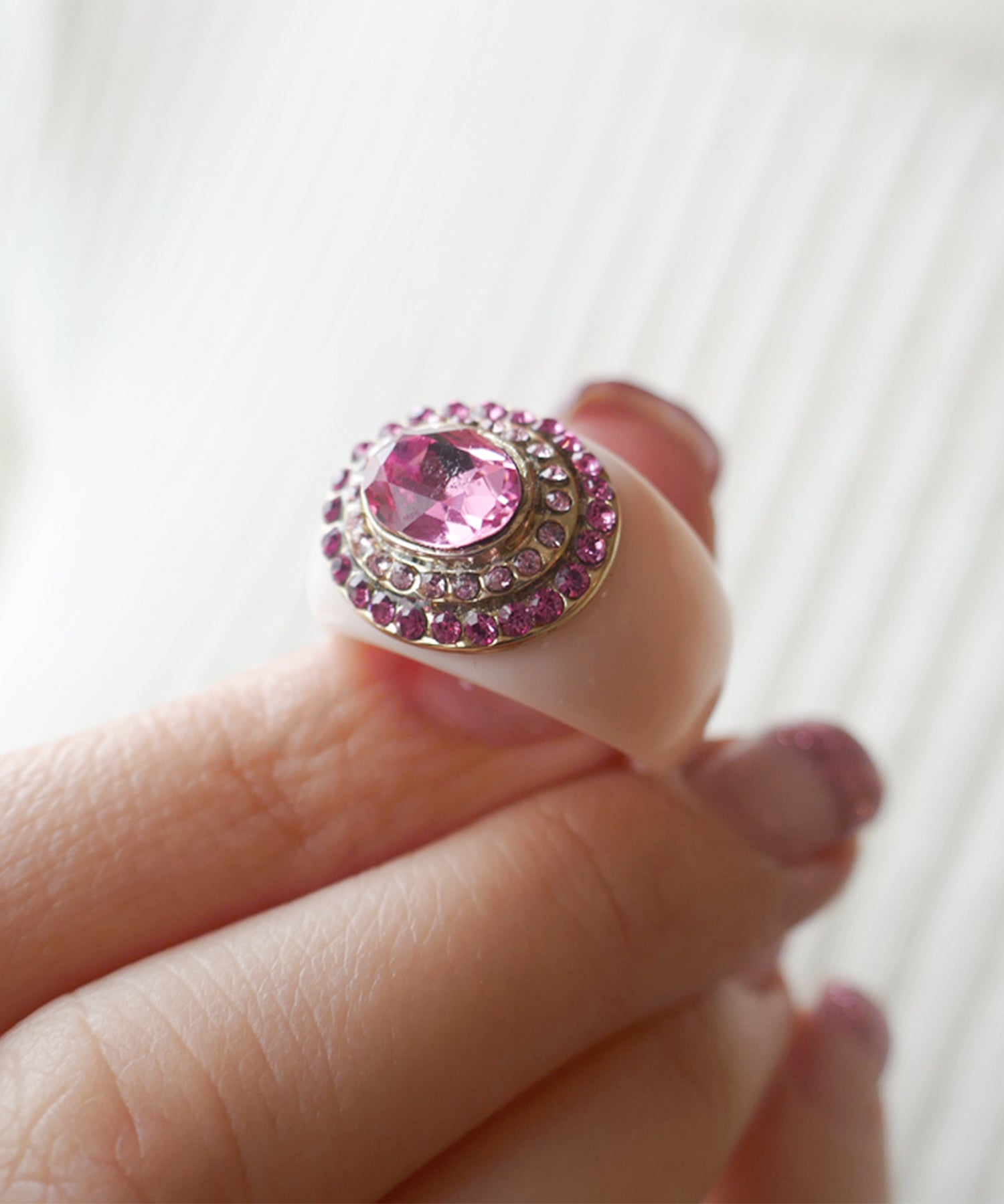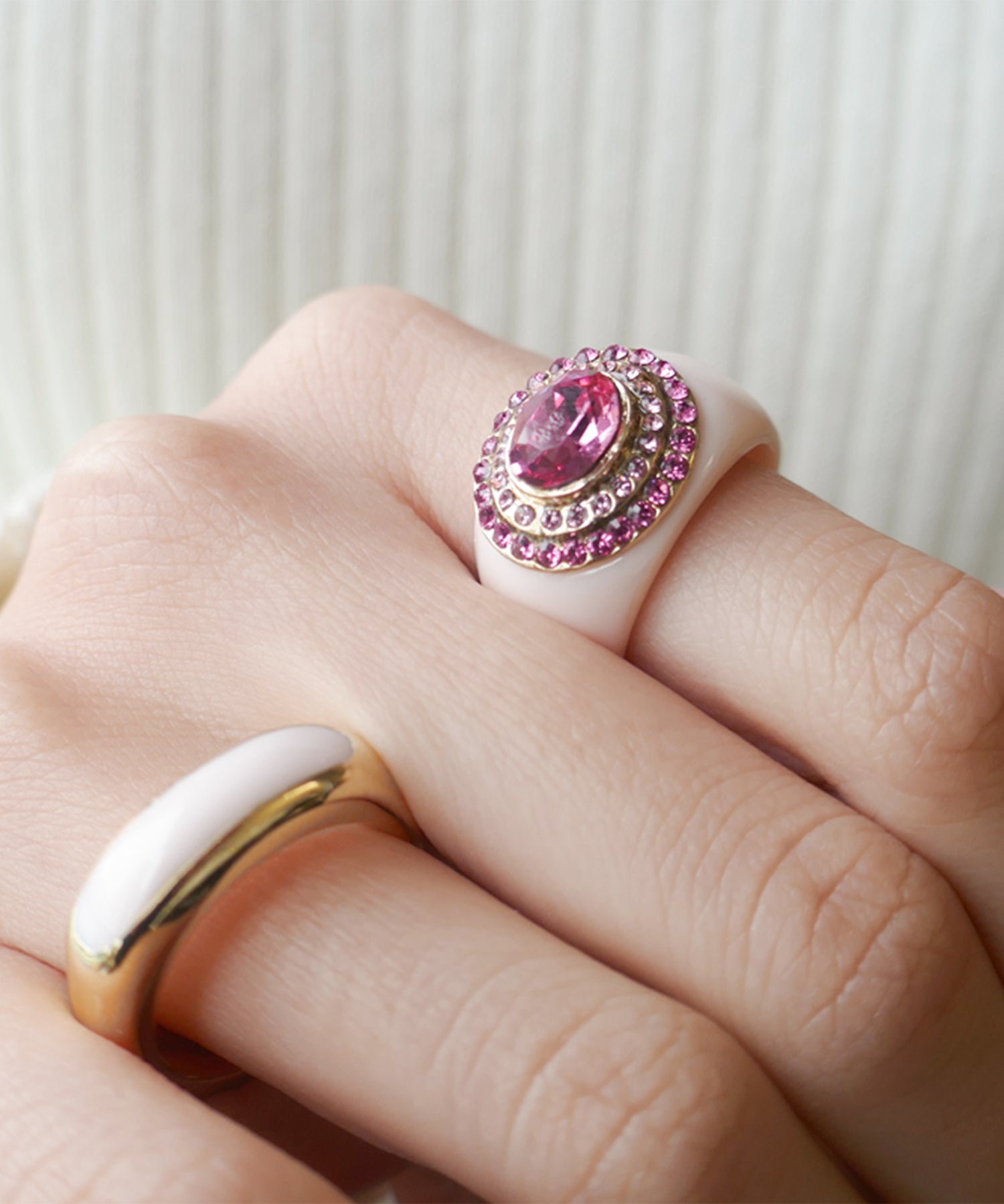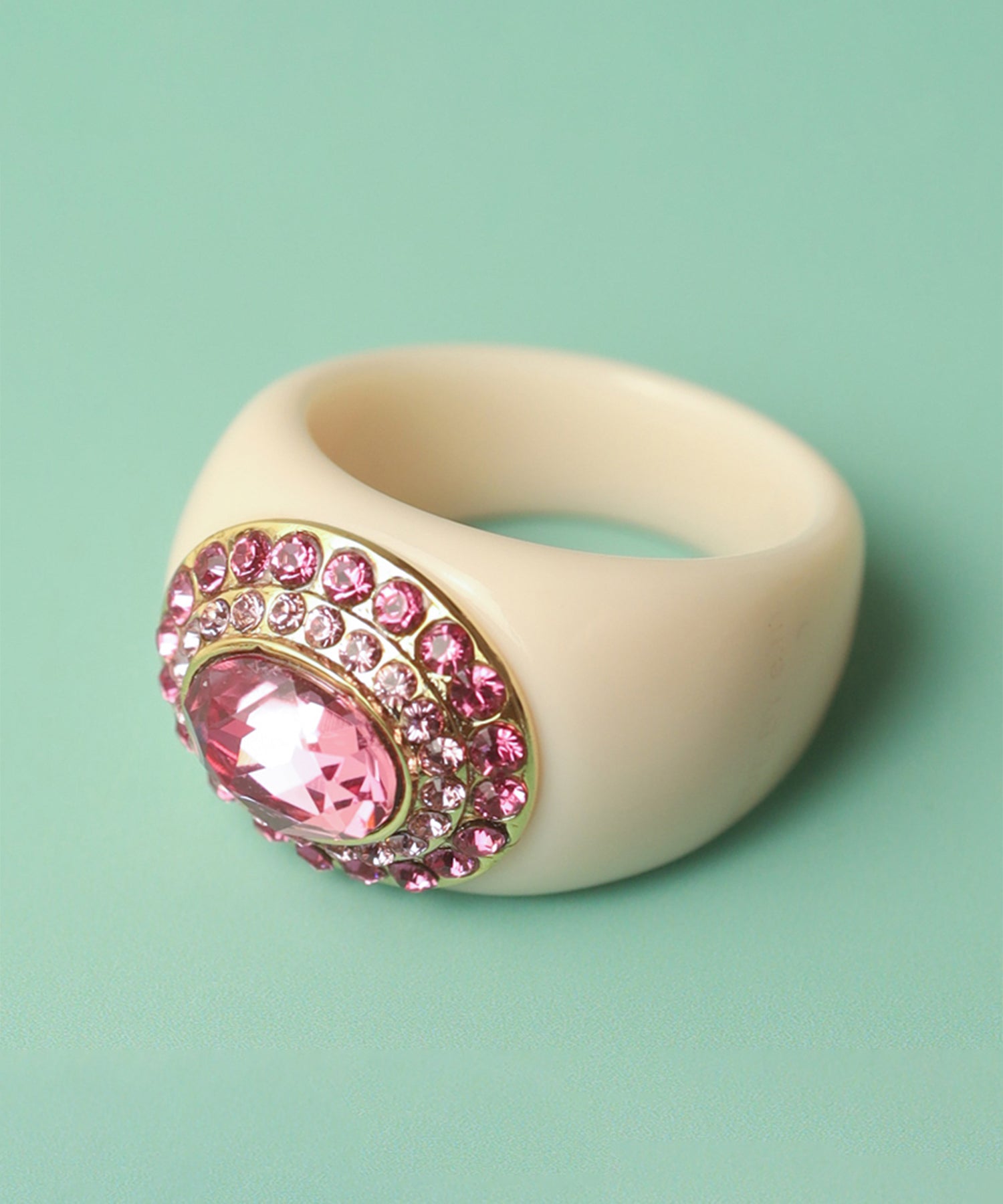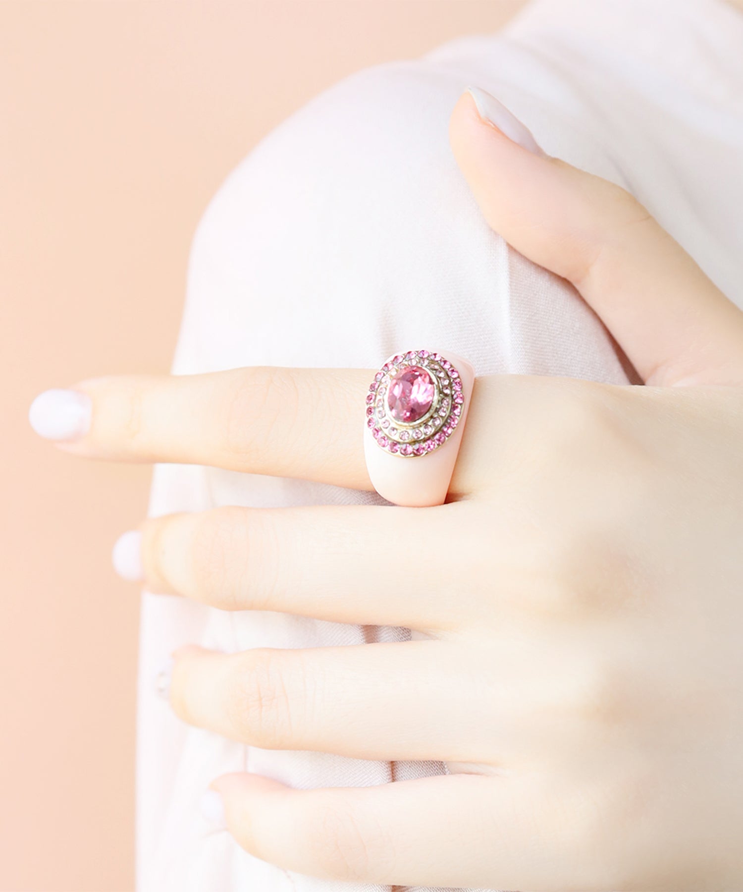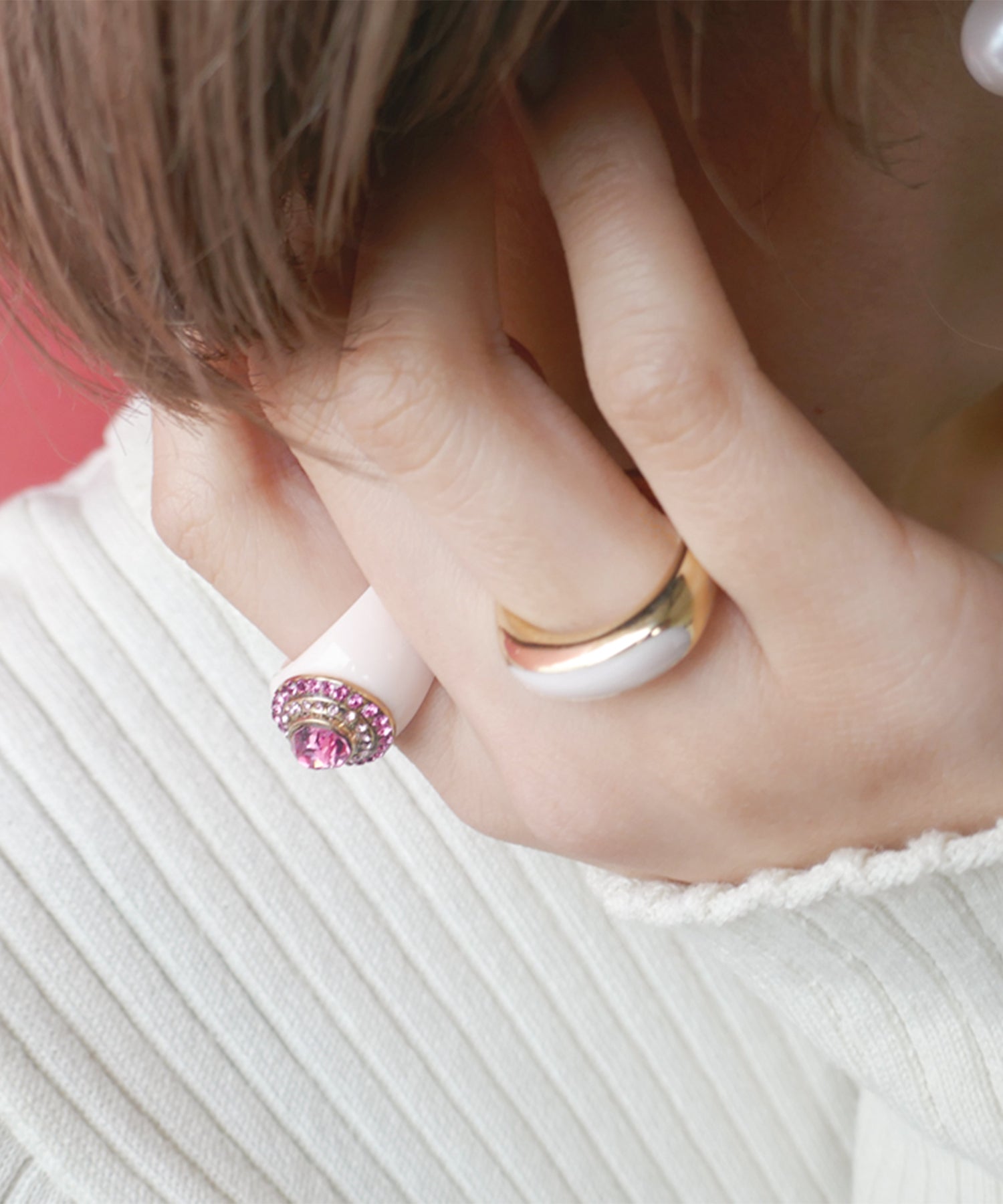 レディライクにさまざまなニュアンスピンクをぎゅっと集めたプレイフルなリング。