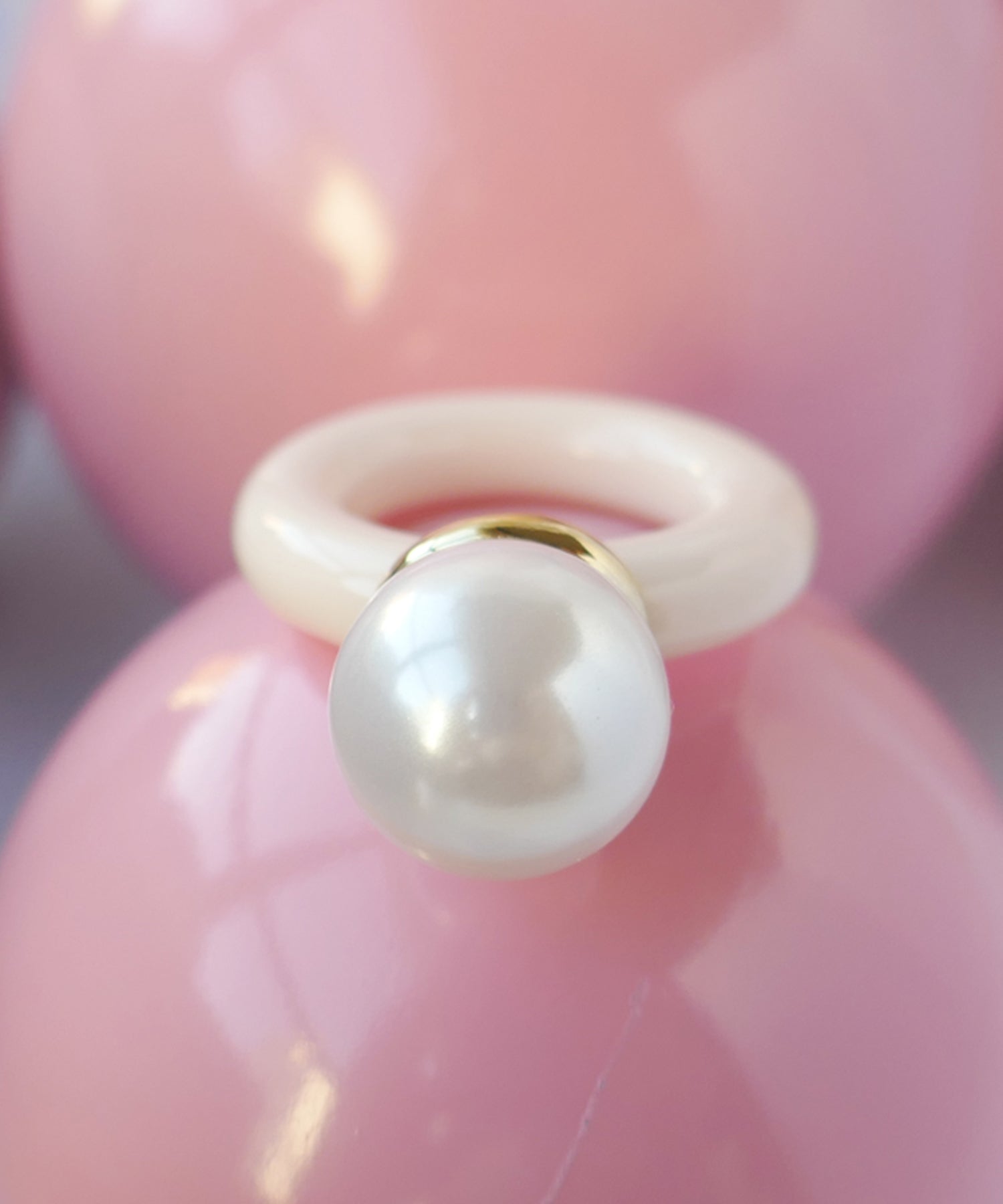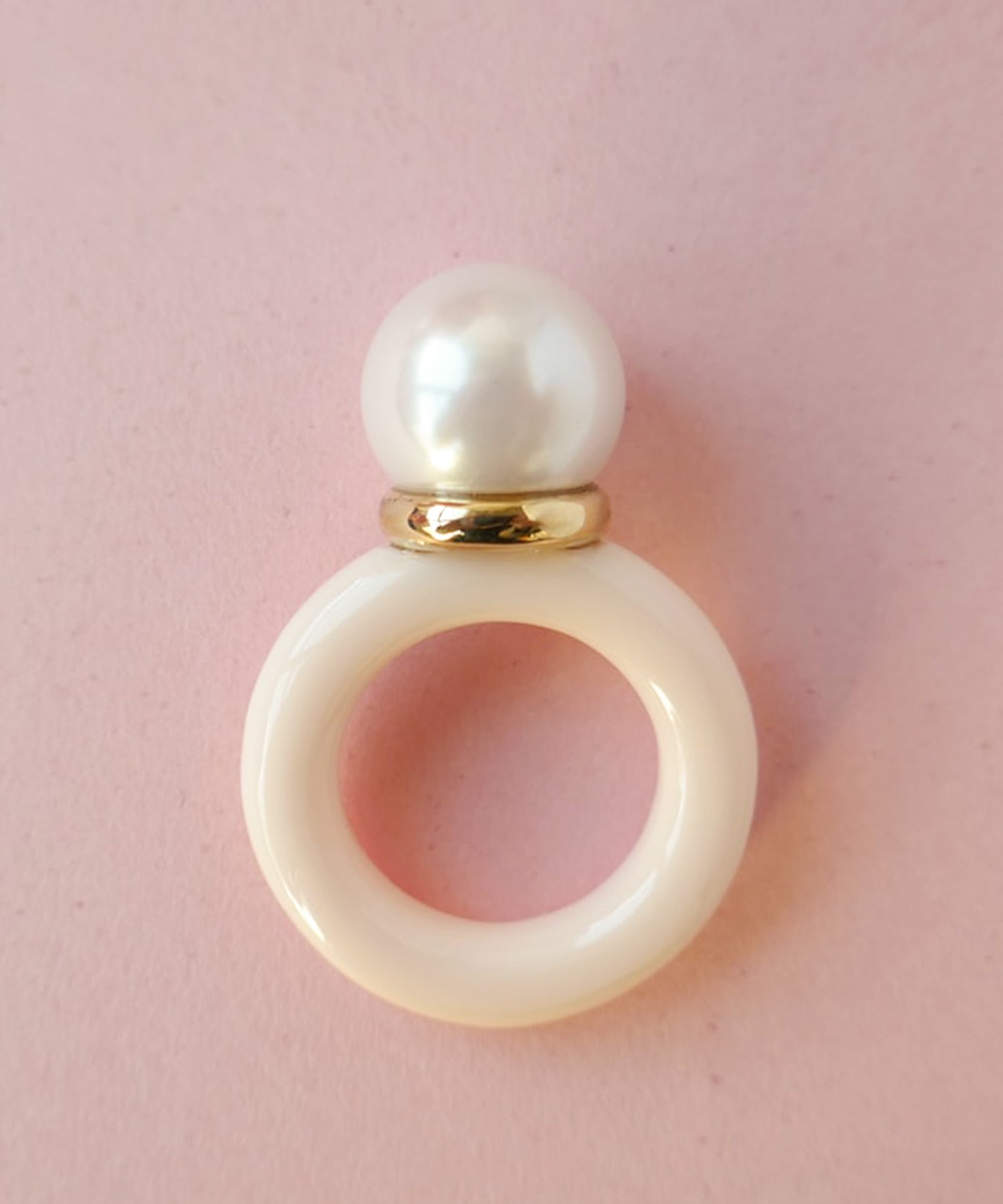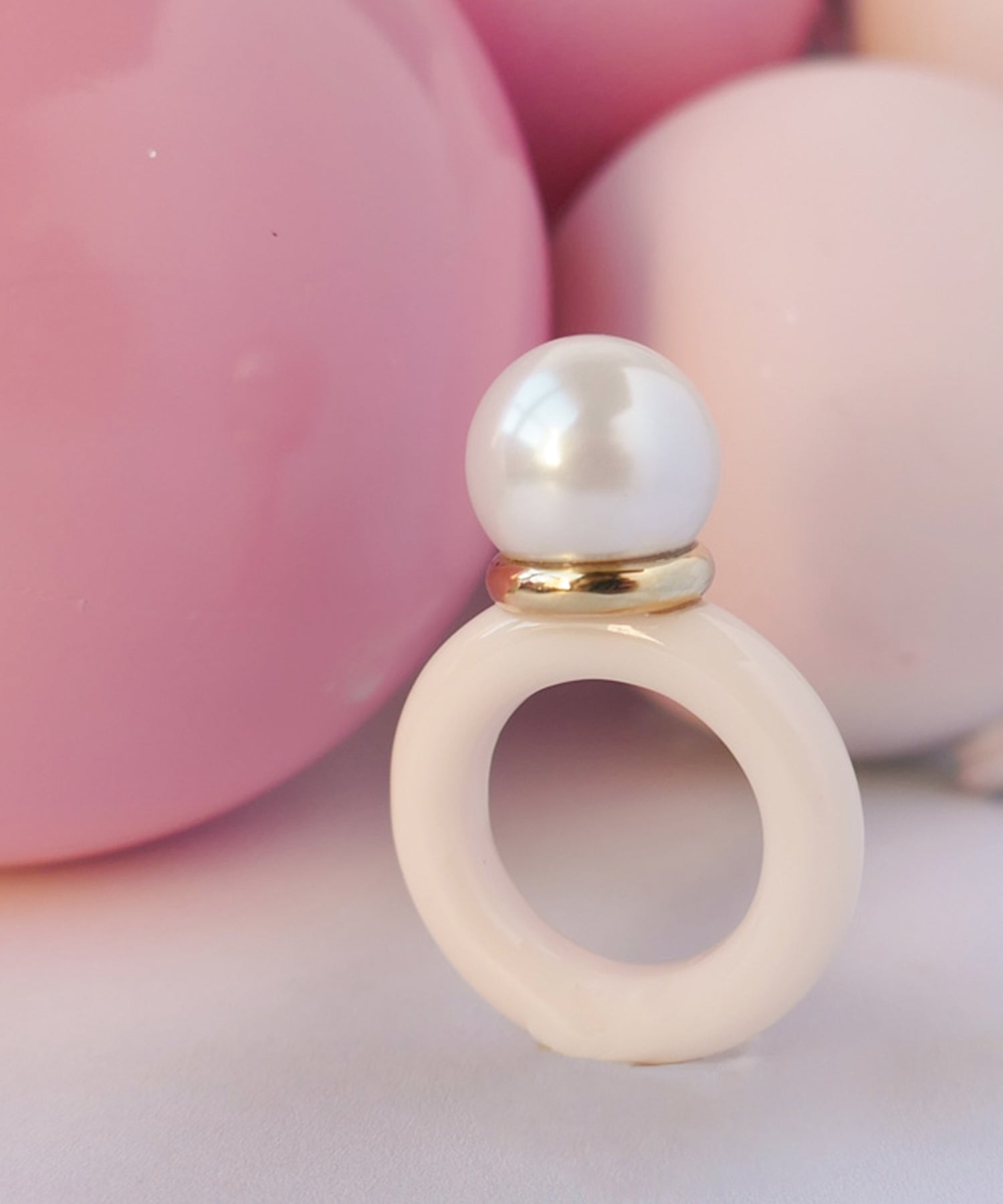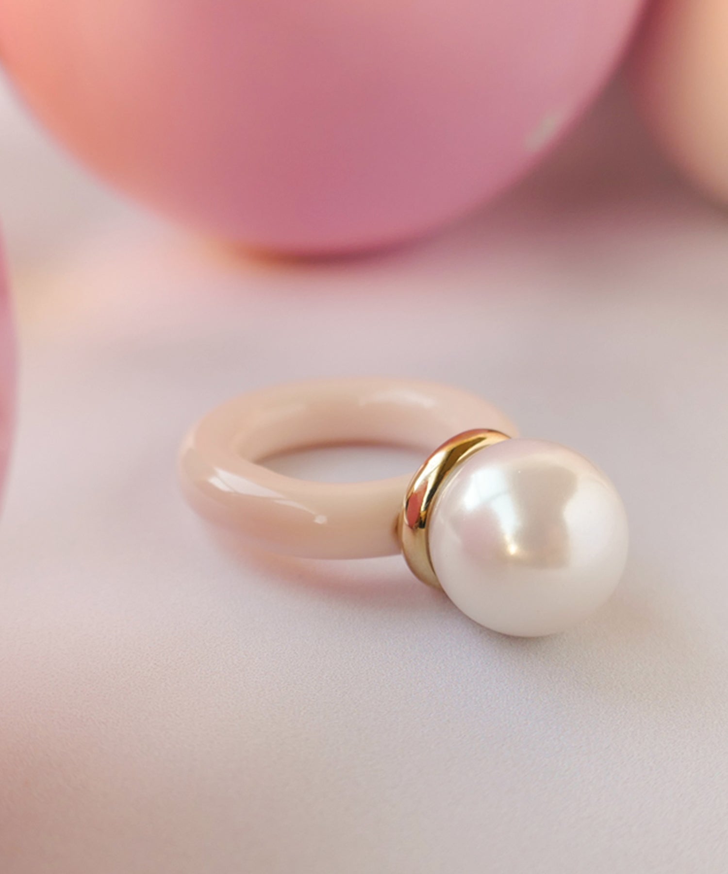 メインパールに自然と視線が集まる愛らしいデザインリング。パールとメタル部分のバランスが横から見ると
