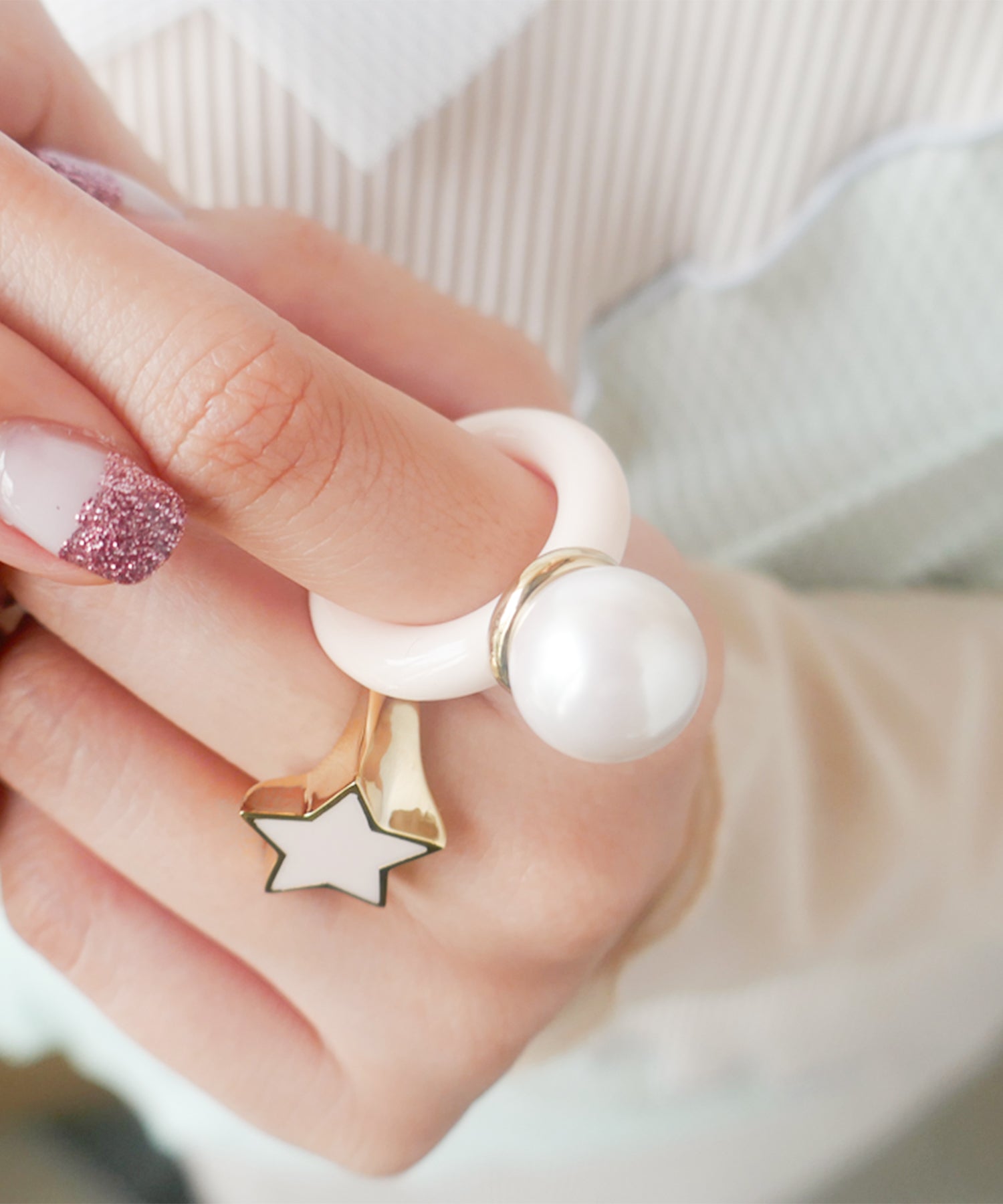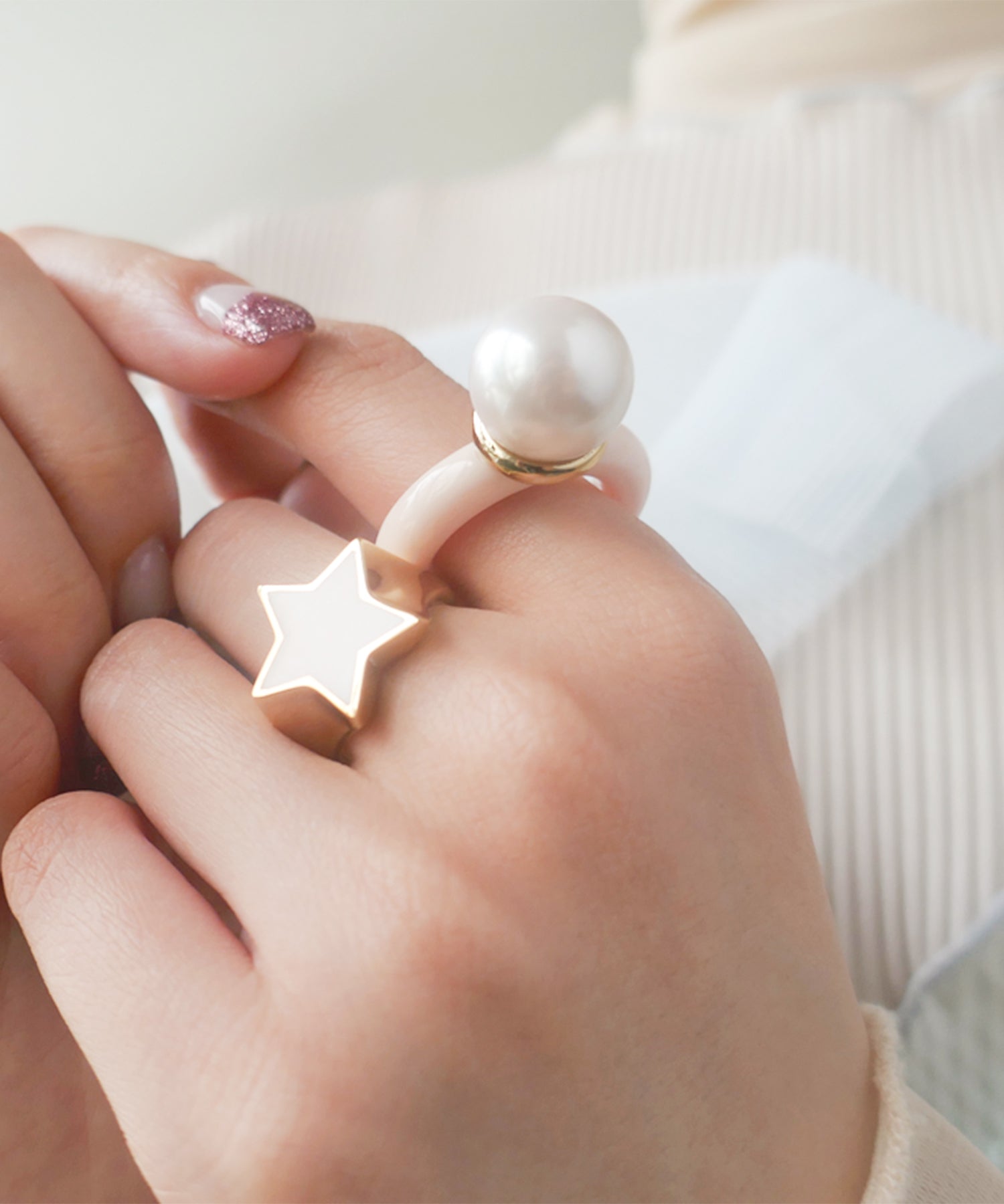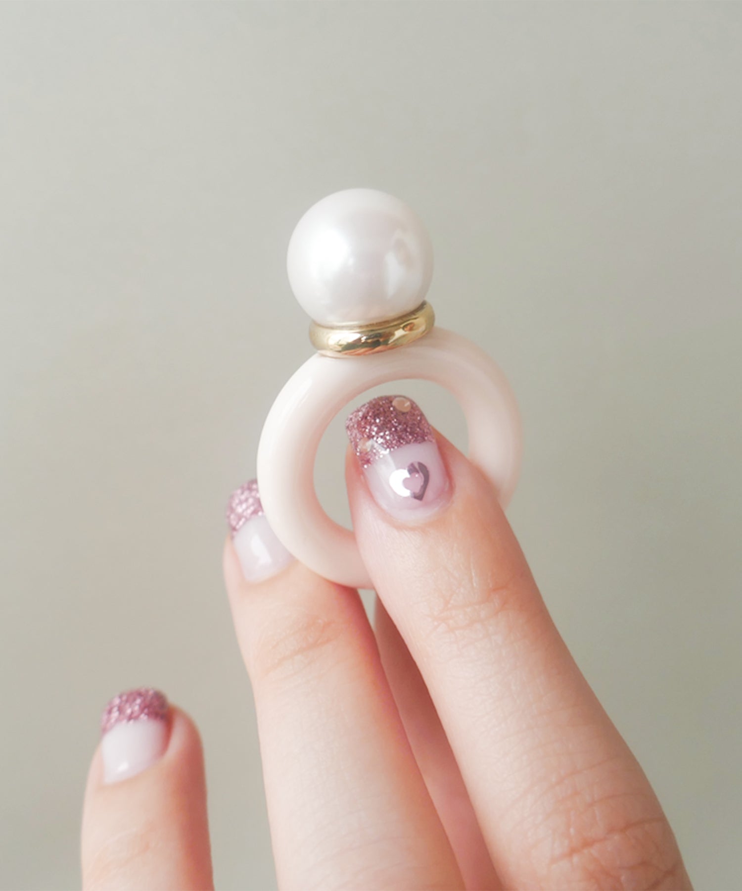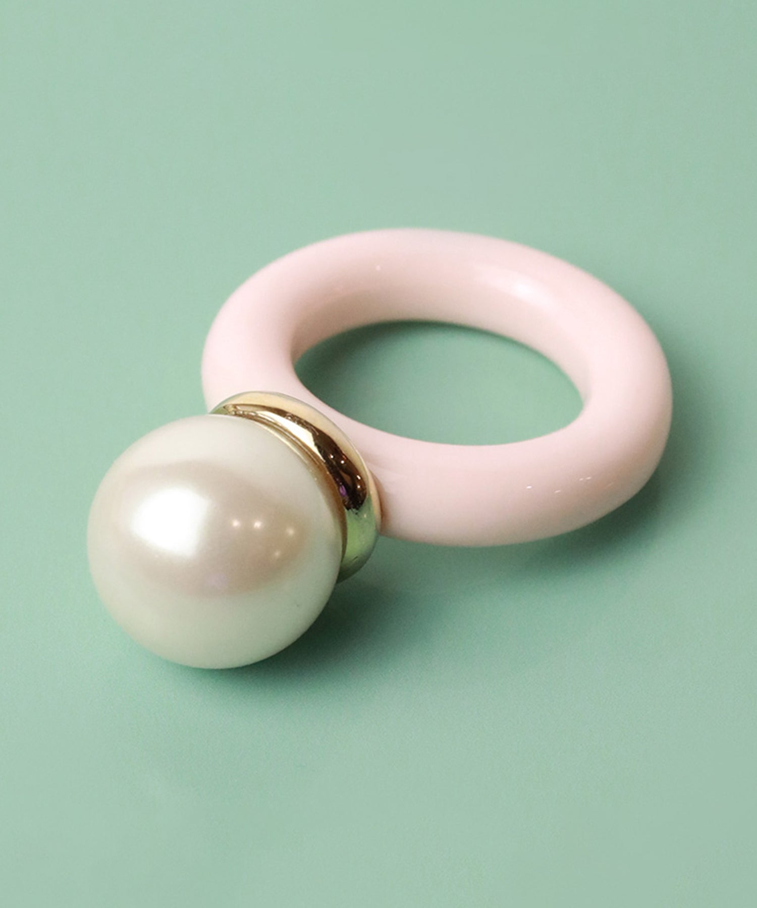 メインパールに自然と視線が集まる愛らしいデザインリング。パールとメタル部分のバランスが横から見ると