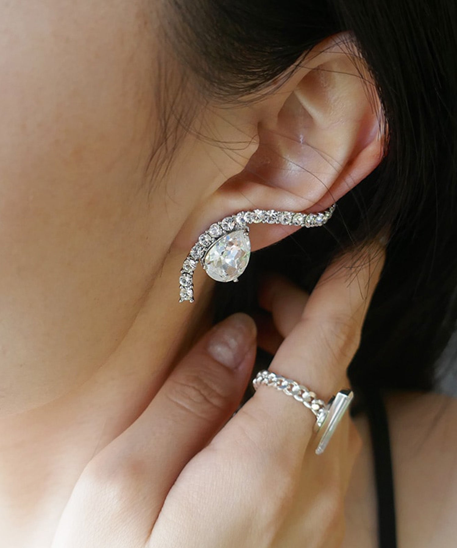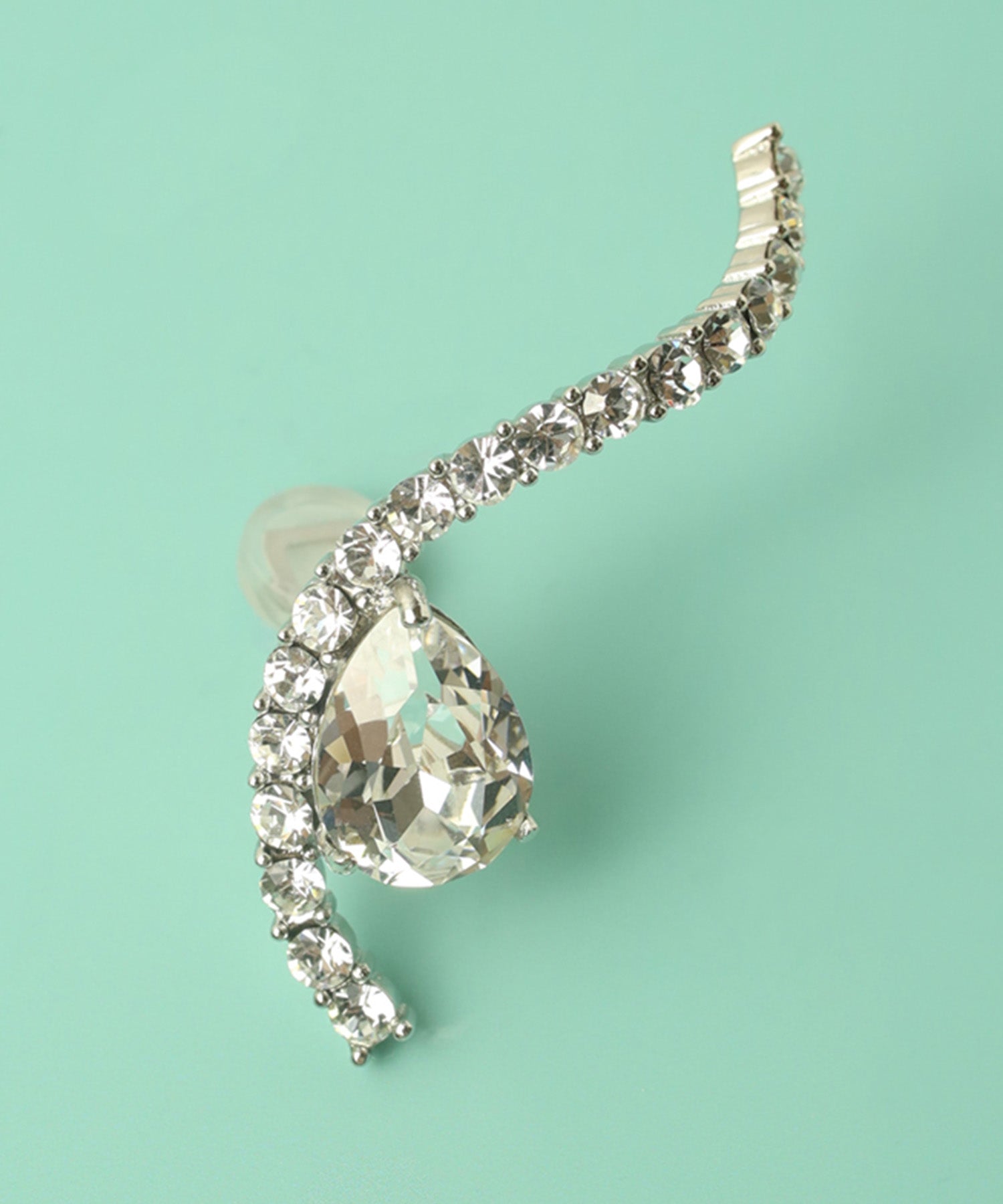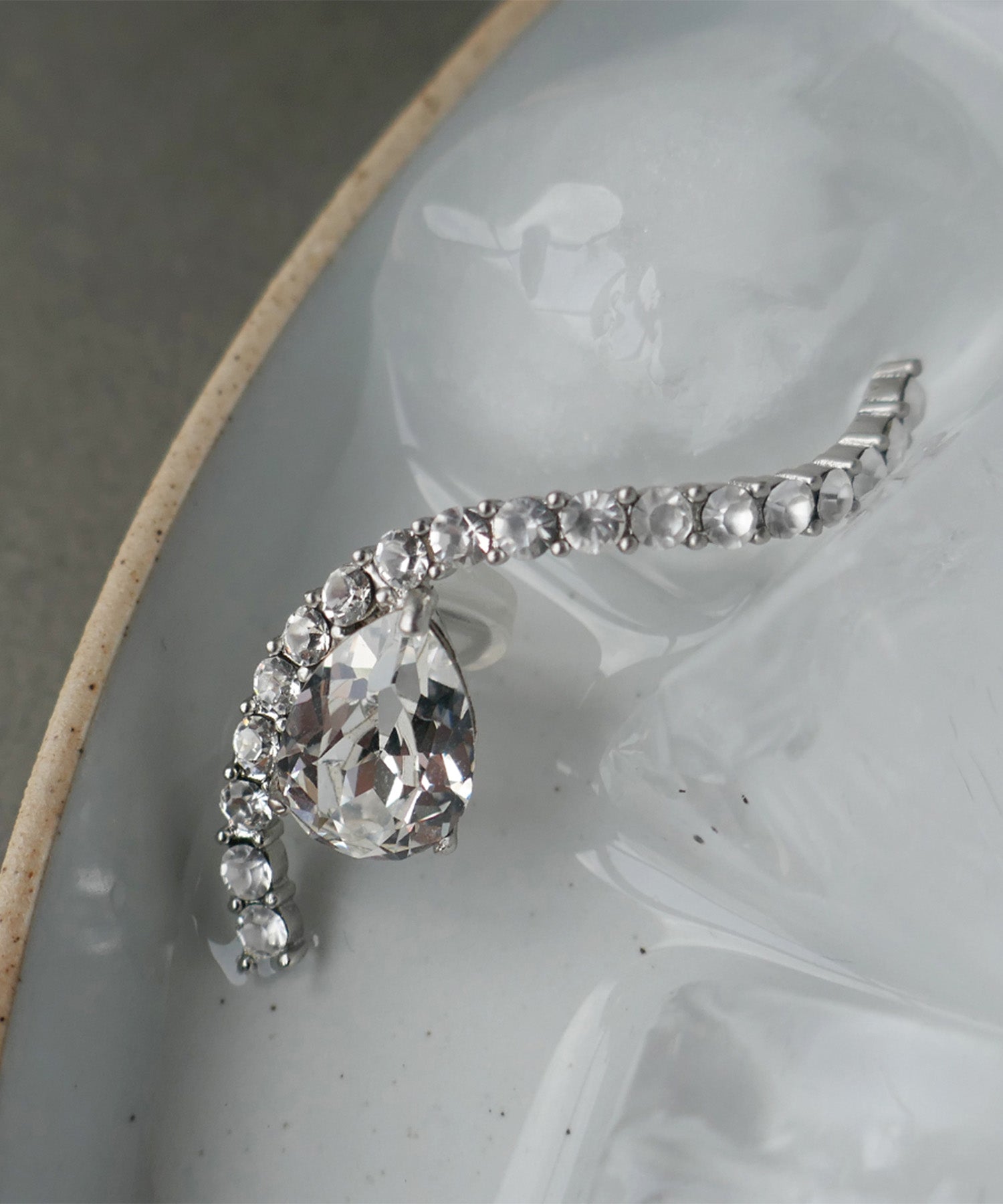 有機的なラインにクリスタルがセッティングされた左耳専用クリップイヤリング。
