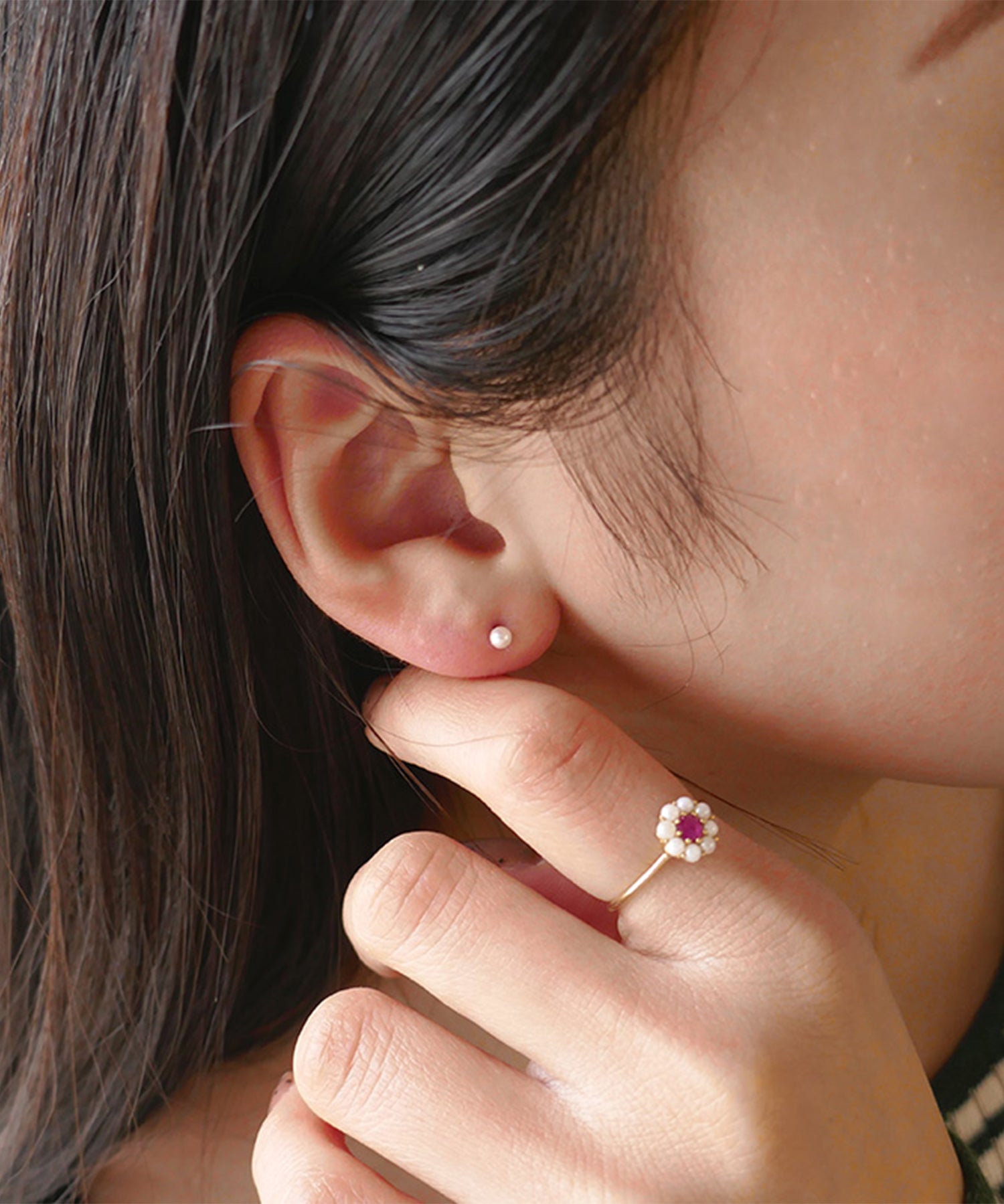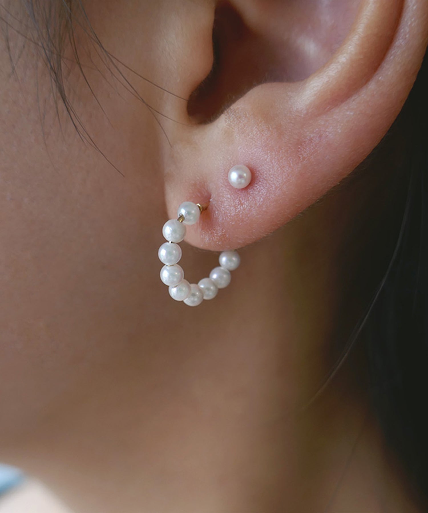 小さなアコヤパールのゴールドピアス。パールのテリが上品なアクセントを。スタイルやシーンを選ばず様々なコーディネートに◎一日中、身に着けることができる定番ピアスにとしておすすめです。