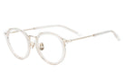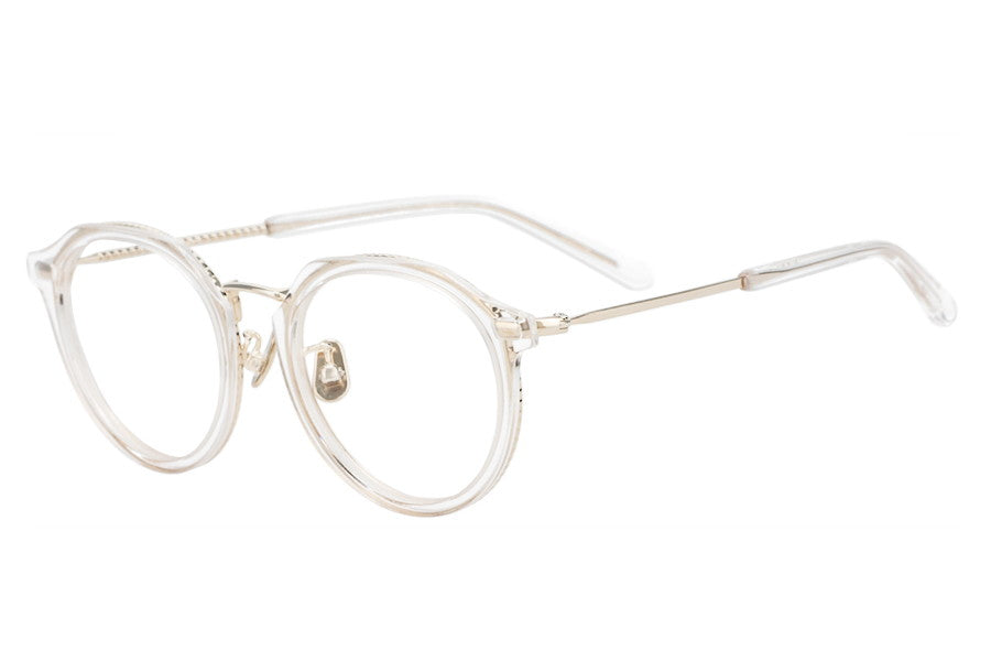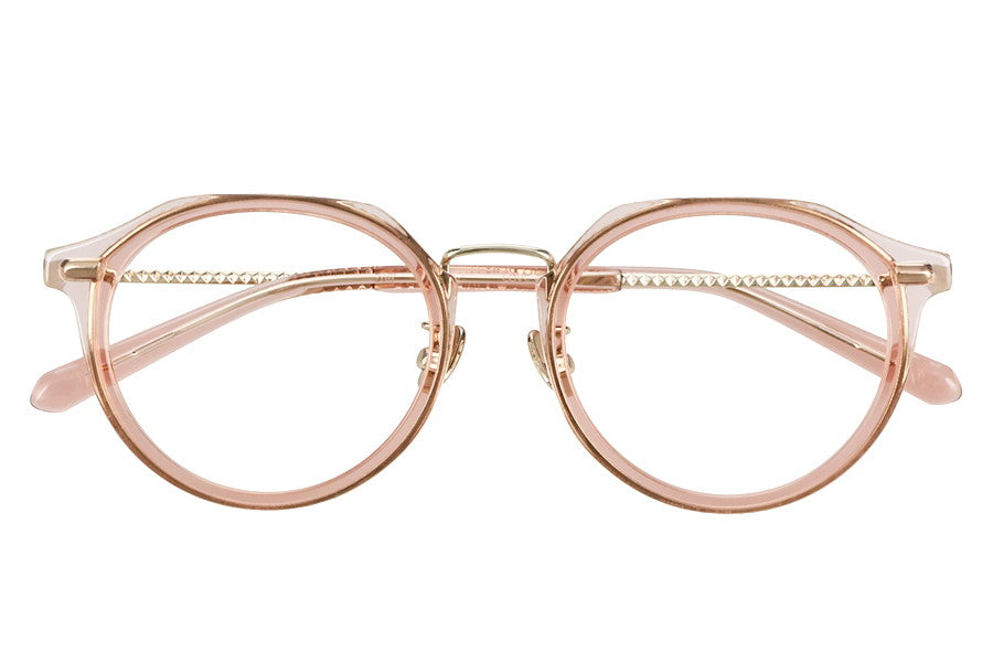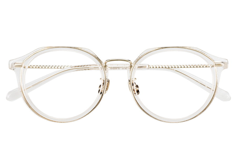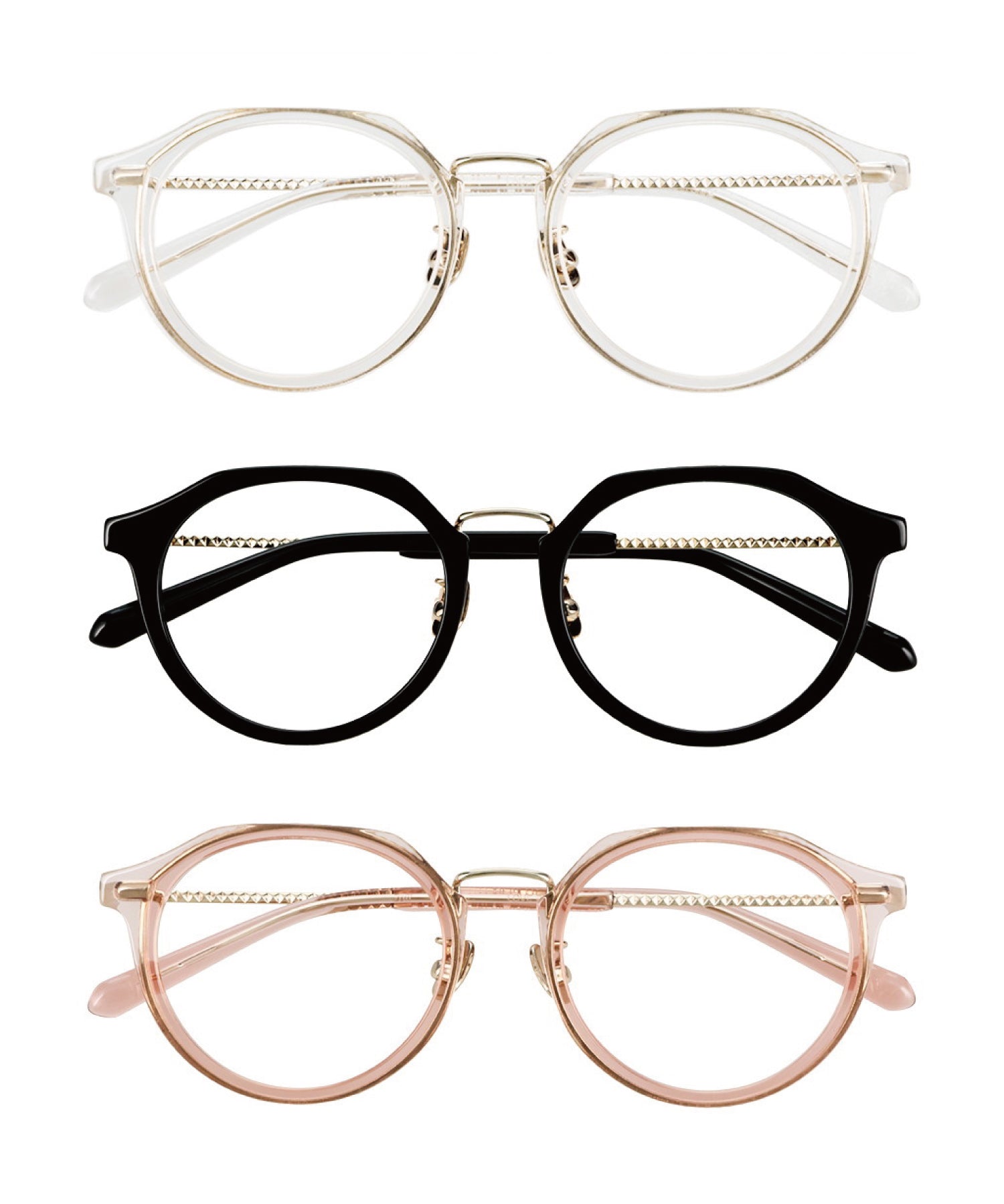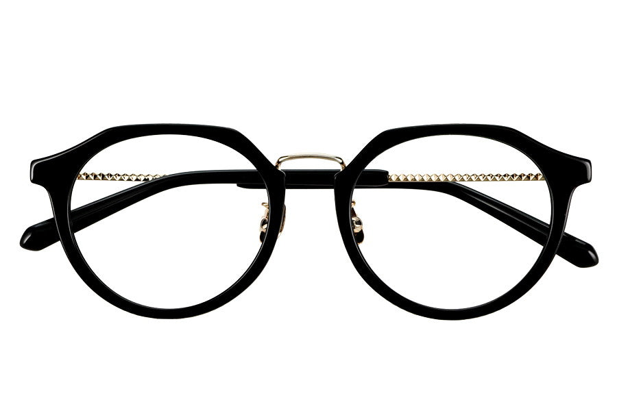 エッジの効いたピラミッドシェイプのモチーフをレンズの縁やテンプル部分に整列させた、ダイヤモンドのようや輝きを纏うモデルです。