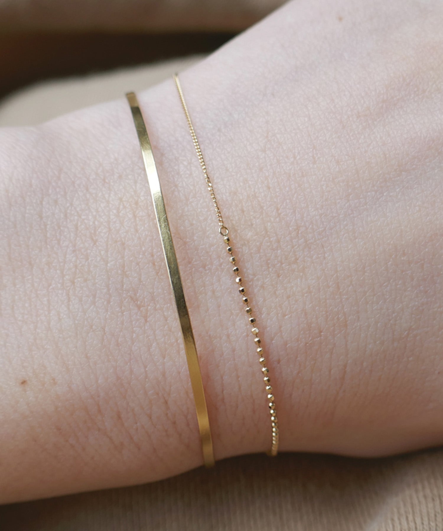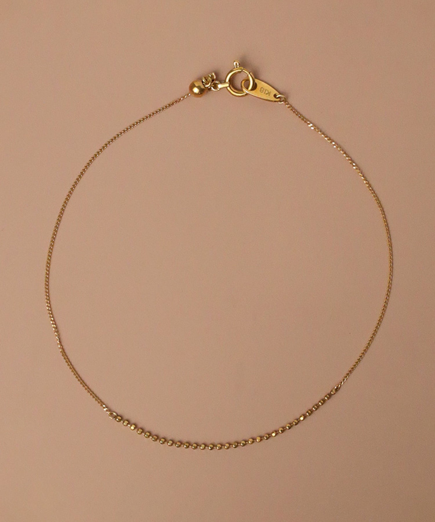 小さなゴールドの粒が連なったブレスレット。肌になじみ溶け込むような繊細なデザインのスキンジュエリーでシンプルな中にもさり気なく目を惹く重ね着けにもおすすめのアイテムになっています。