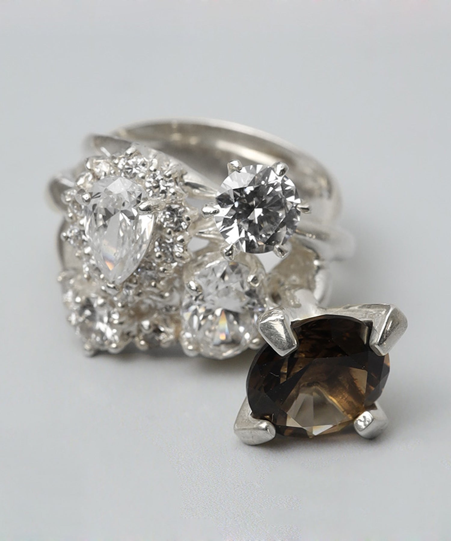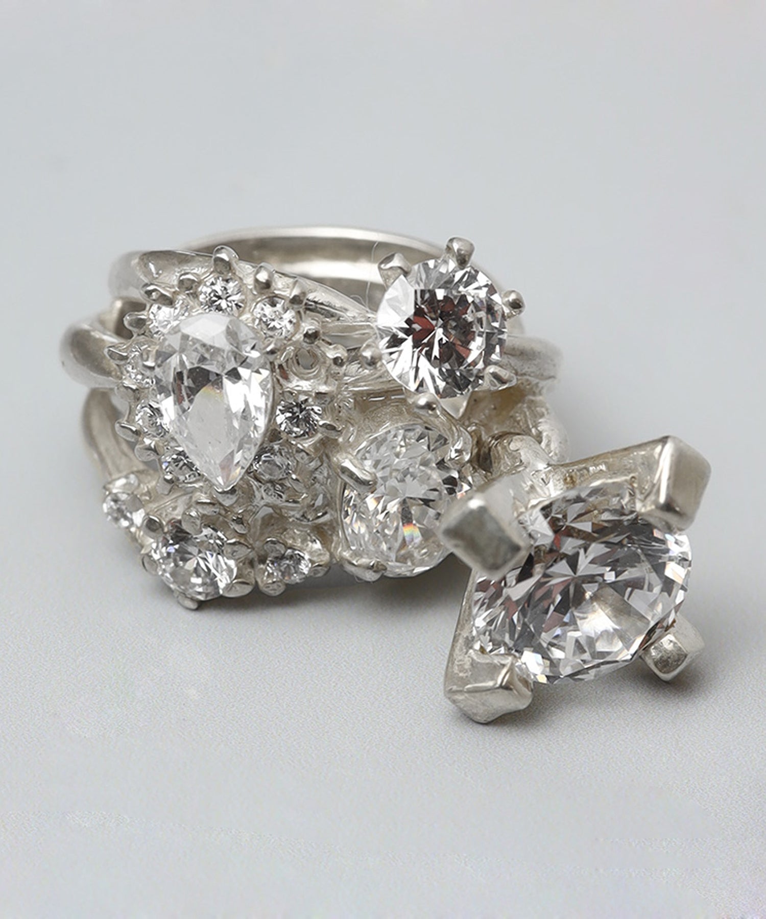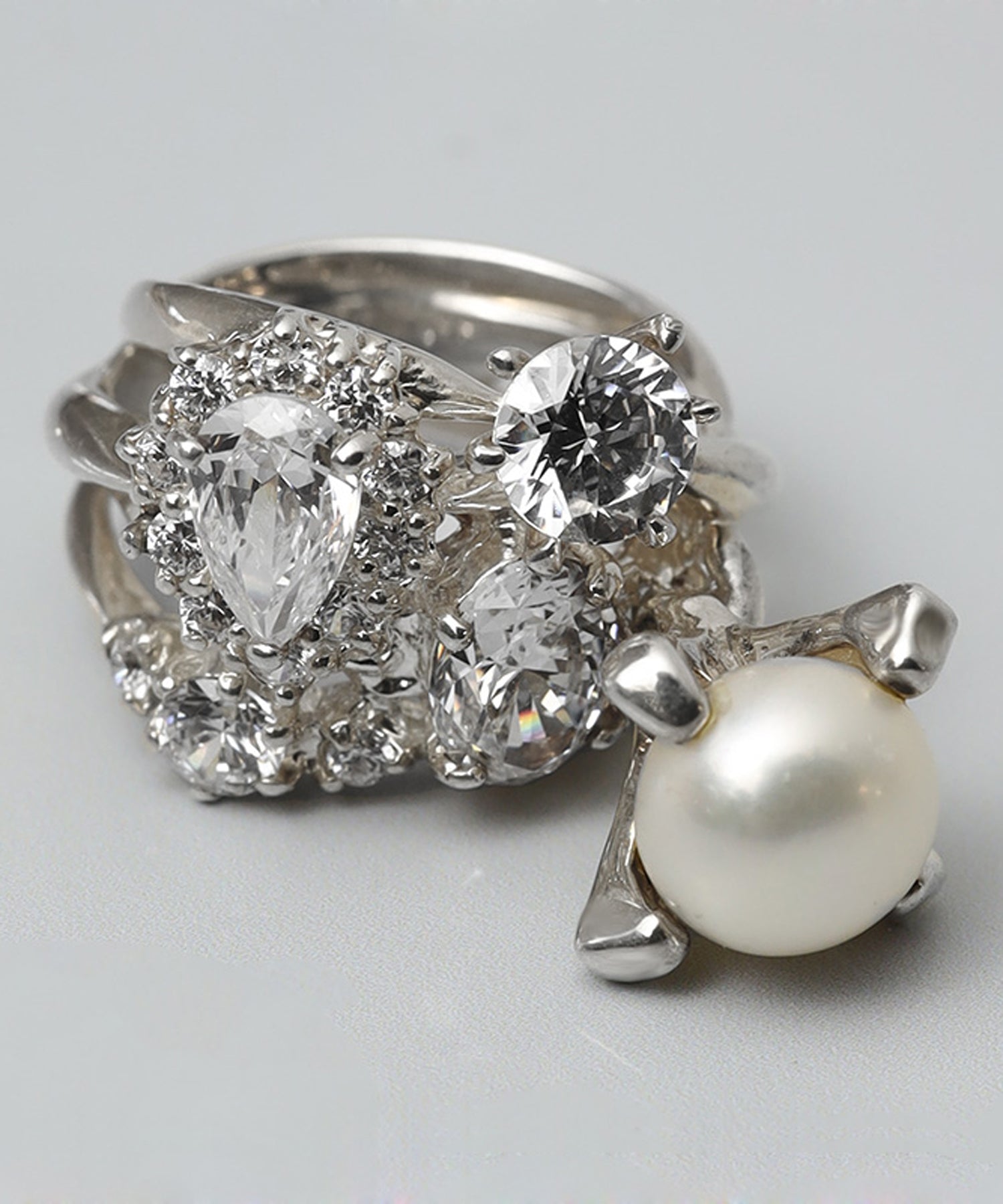 何本ものリングを重ねたような存在感。 手を動かすと揺れる1石と 異なるシェイプのジルコニアが作る