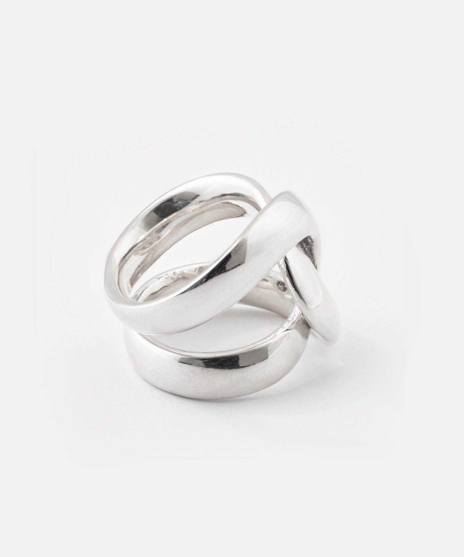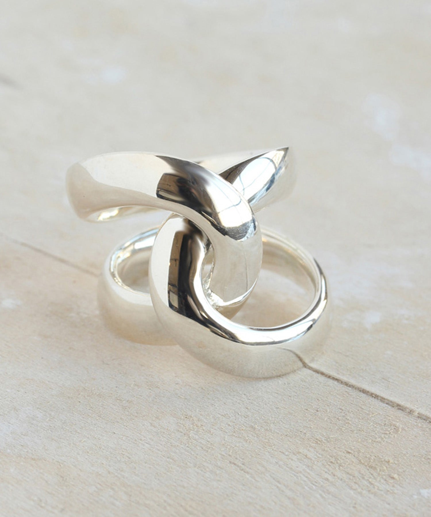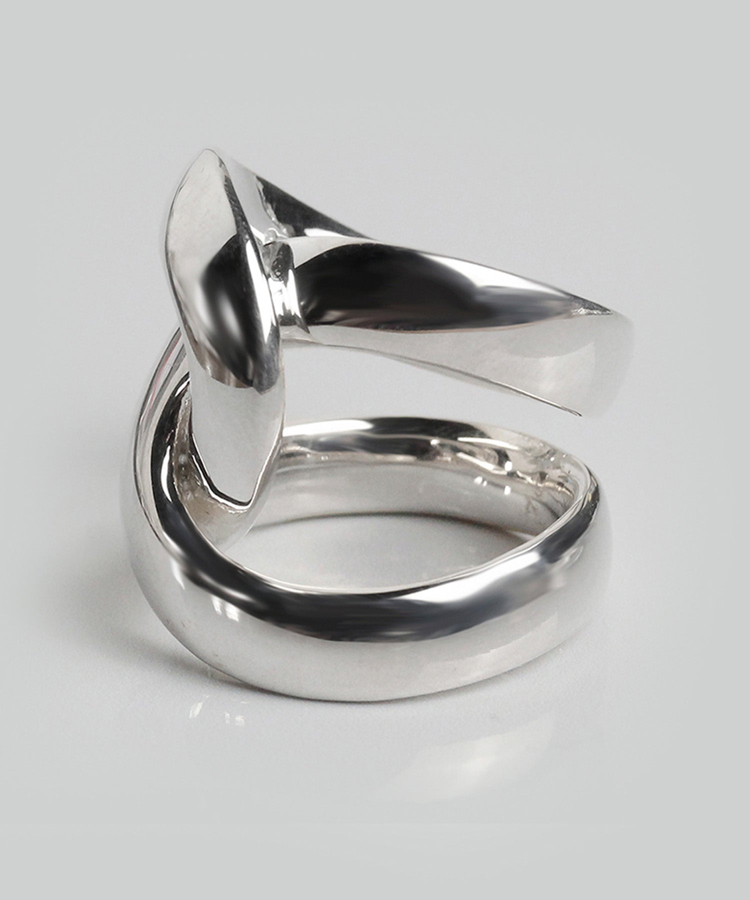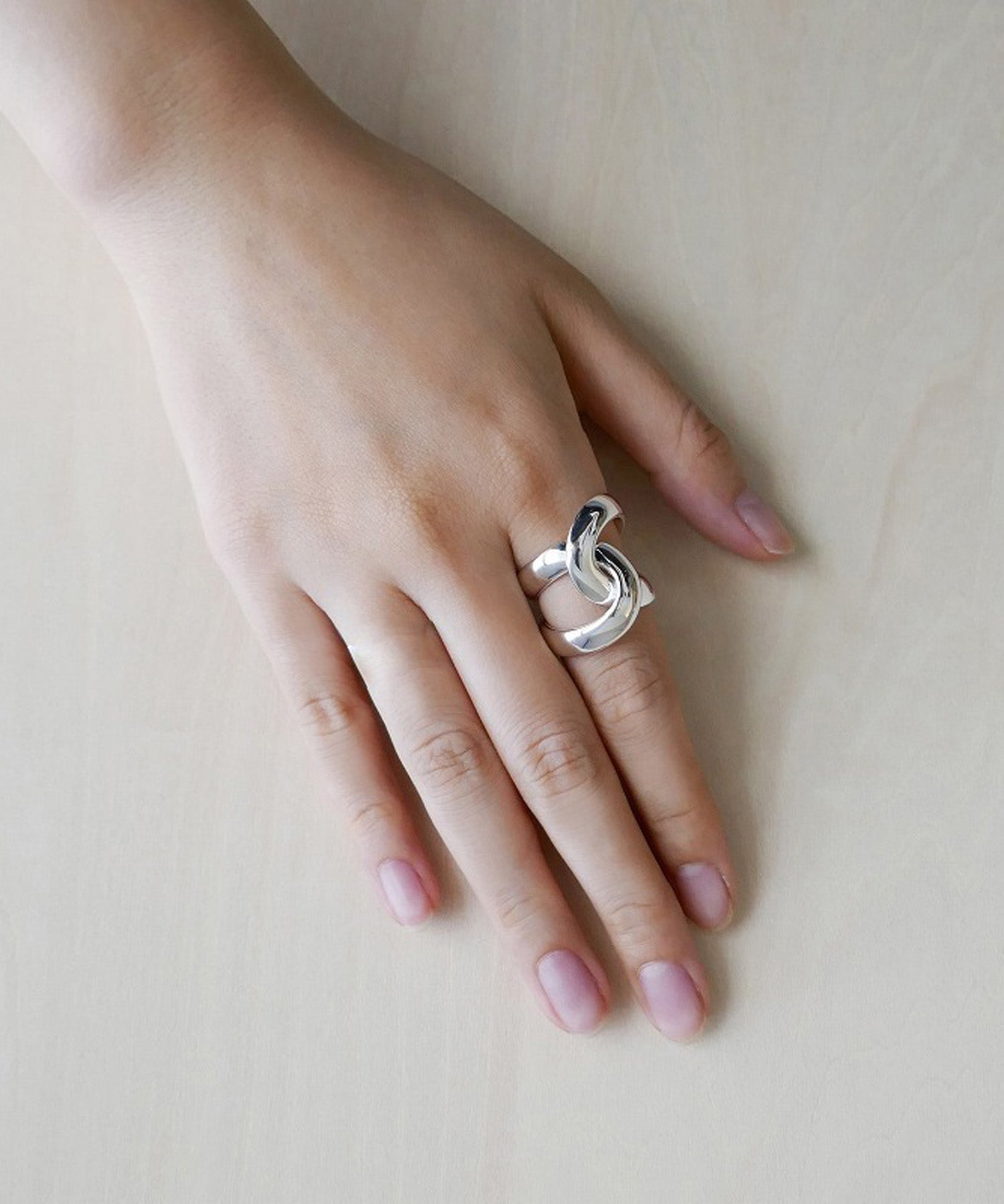 滑らかな曲線とクロスするアームが目を惹くシルバーリング。意外としっくり指に馴染み、つけやすい。
