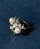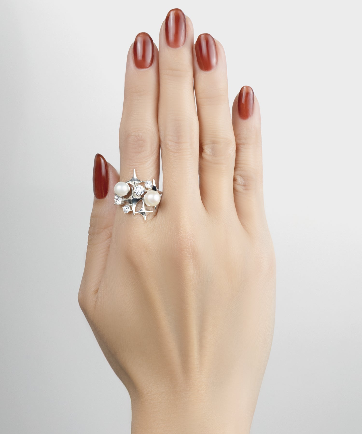 キュービックジルコニアとパール、それぞれ異なる煌めきを放つふたつを寄り添わせ、輝きのグラデーションを生み出しています。
