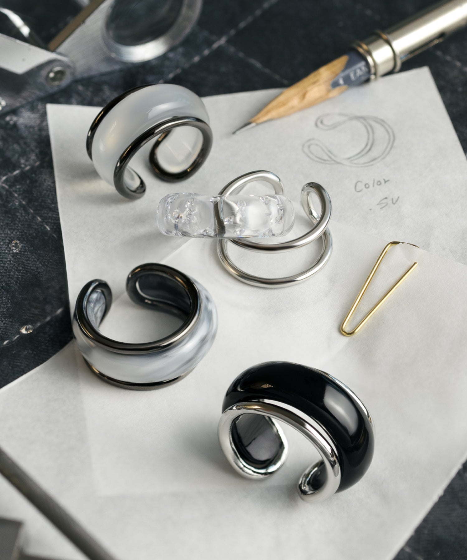 鉛筆デッサンで描き出したような、奥行きを感じるモノトーンカラーのジュエリー。