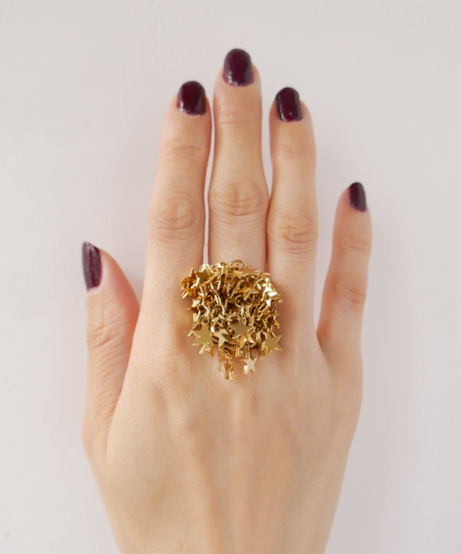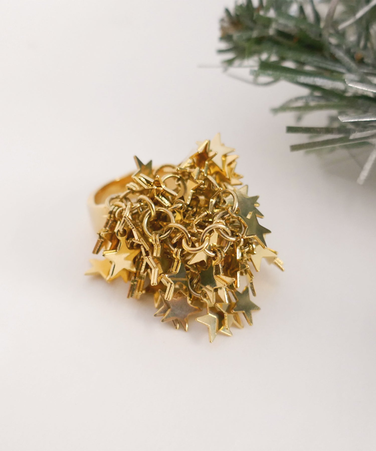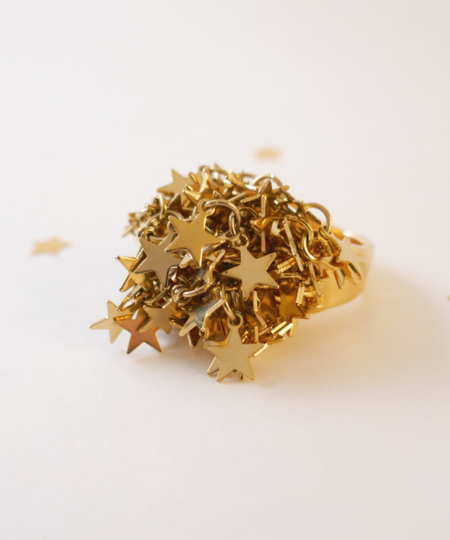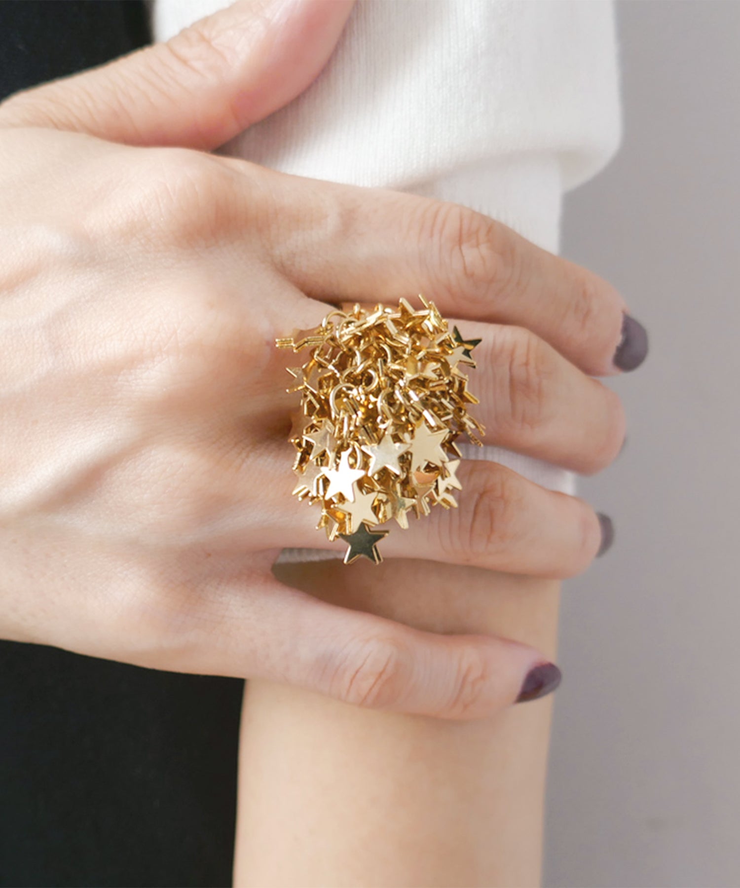 手元から星があふれ出す、主役級のリング。華やかさと肌なじみも良いゴールドカラーが
