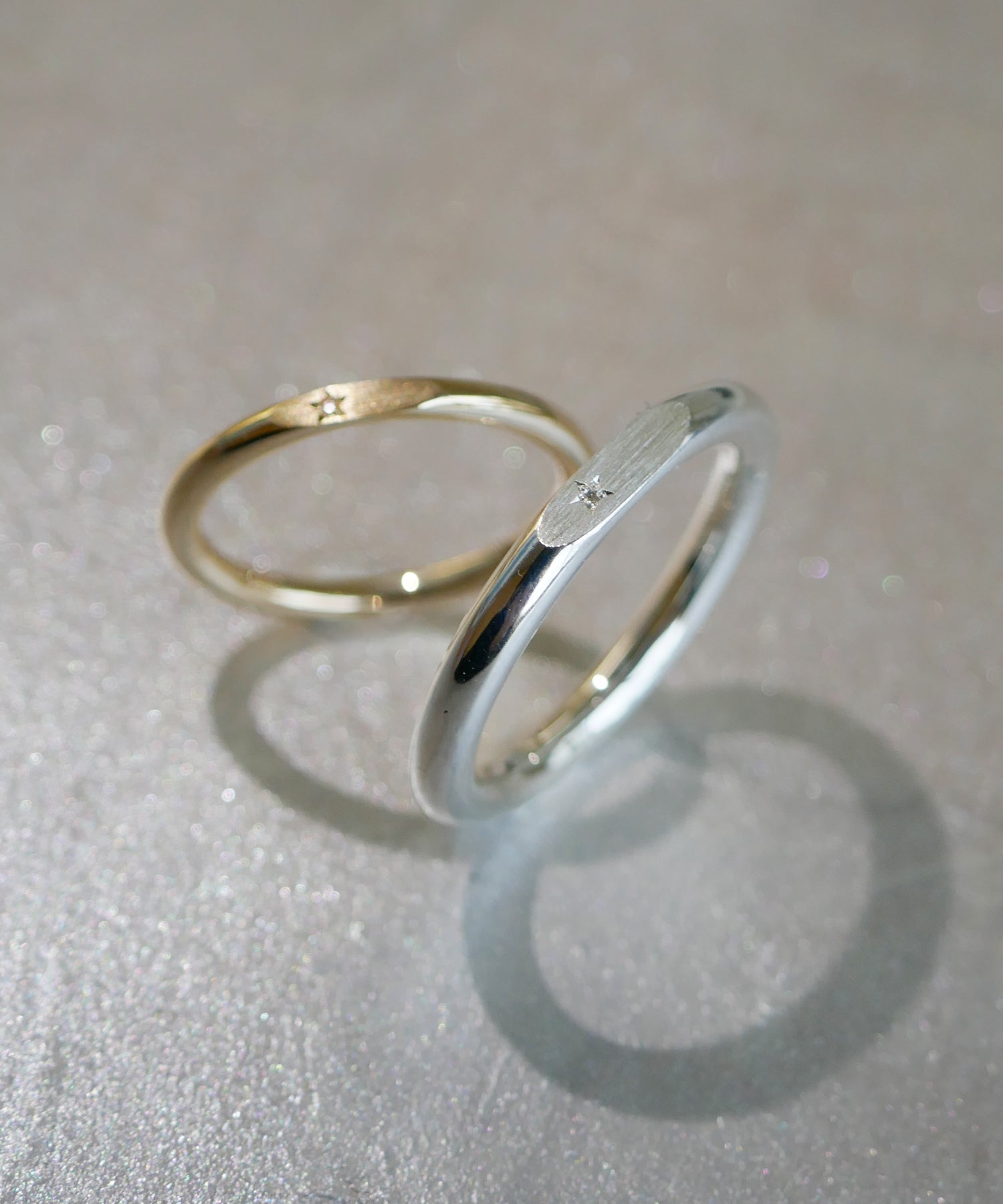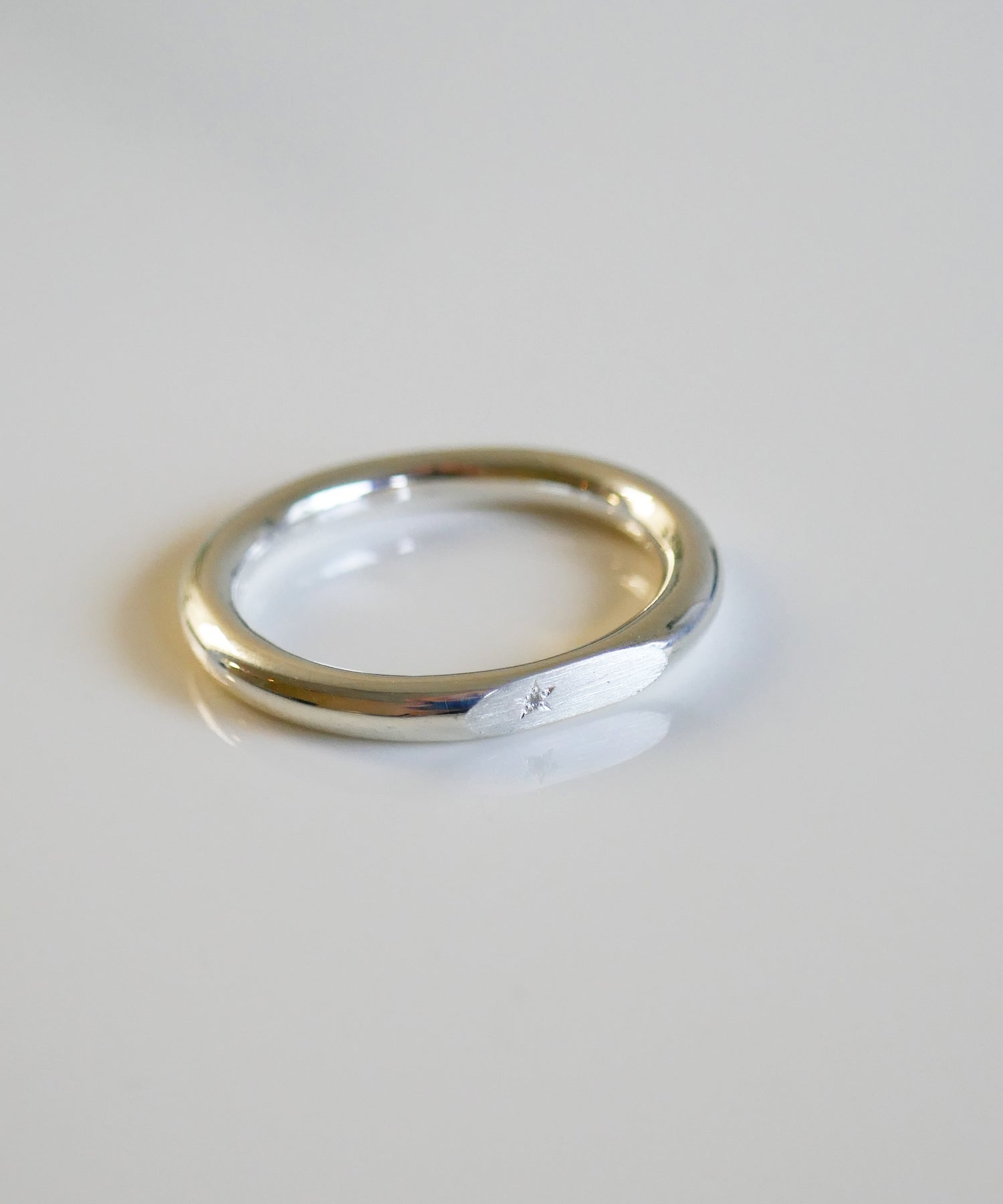 丸みのあるアームの一部をフラットにカットし、 ダイヤモンドを星彫りでセッティングしてアクセントをつけています。