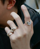 トップ部分のモチーフは幅が広く横の指に干渉するため、複数のリングでコーディネートを組む際は