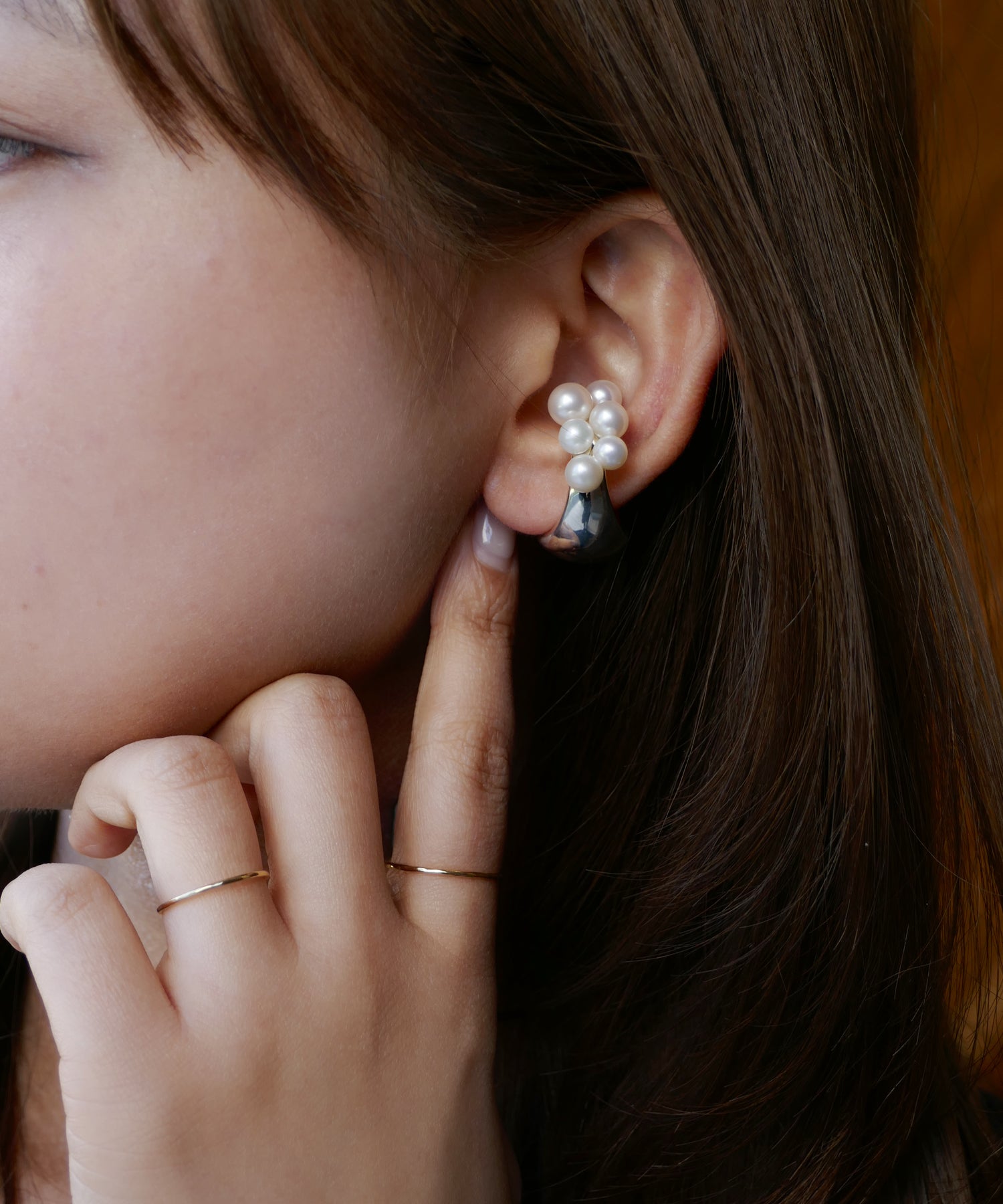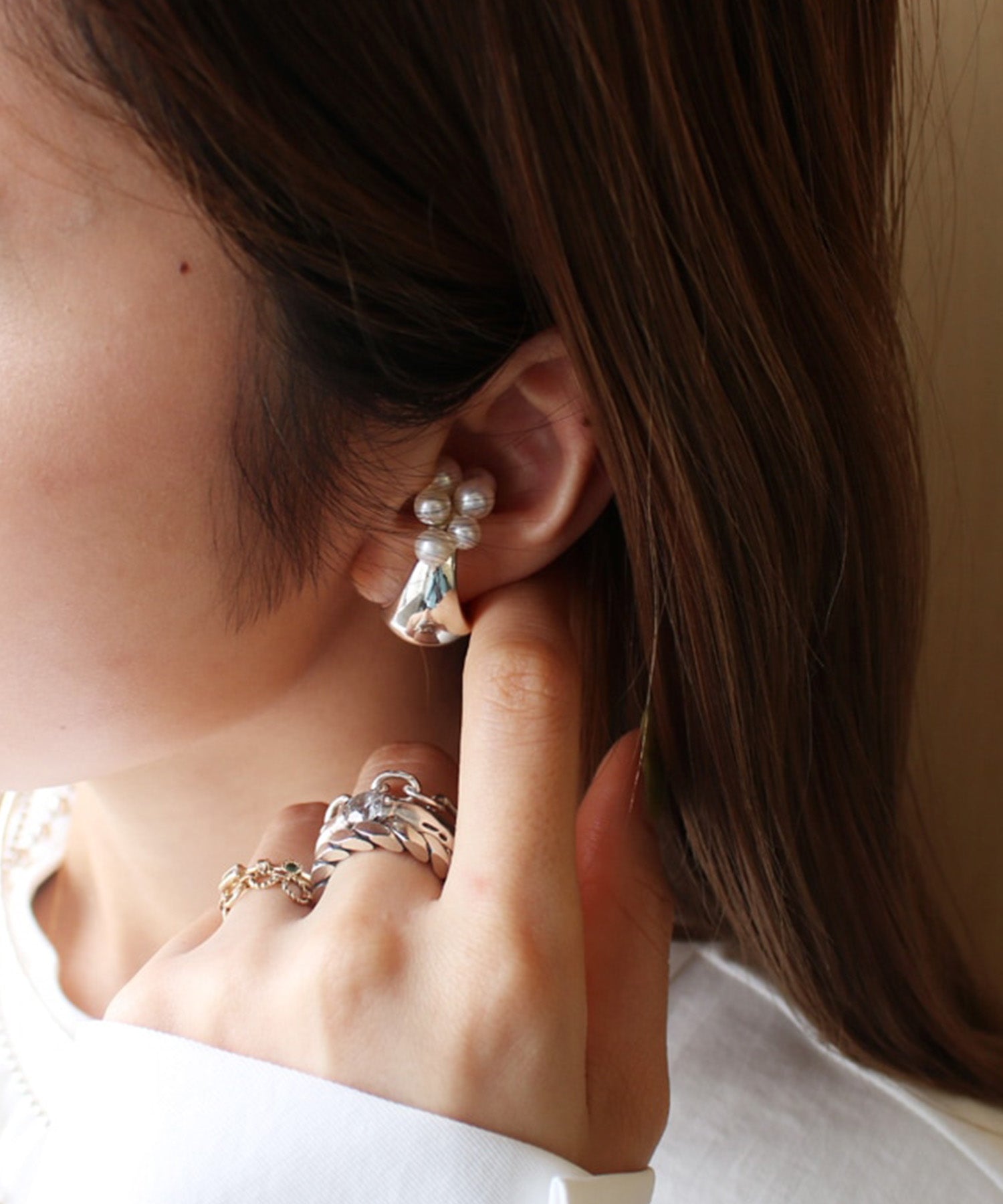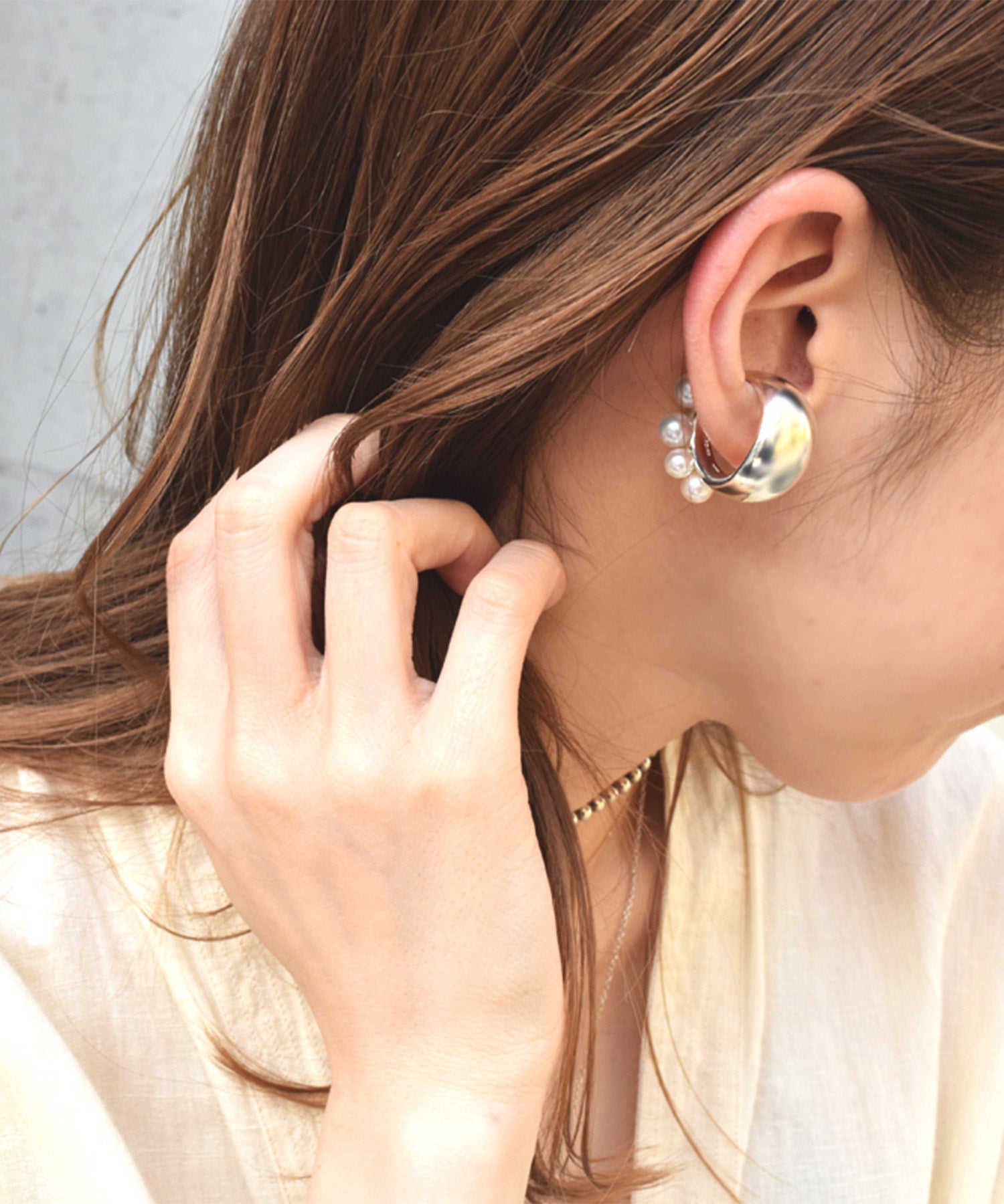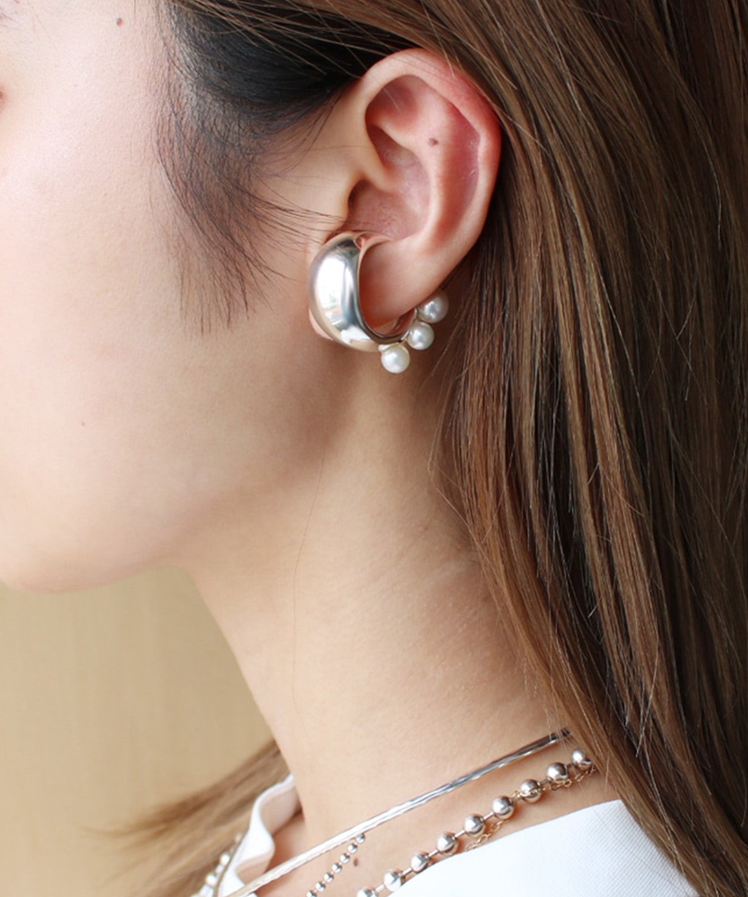 丸みのあるアームにパールをセッティングしたイヤーカフ。