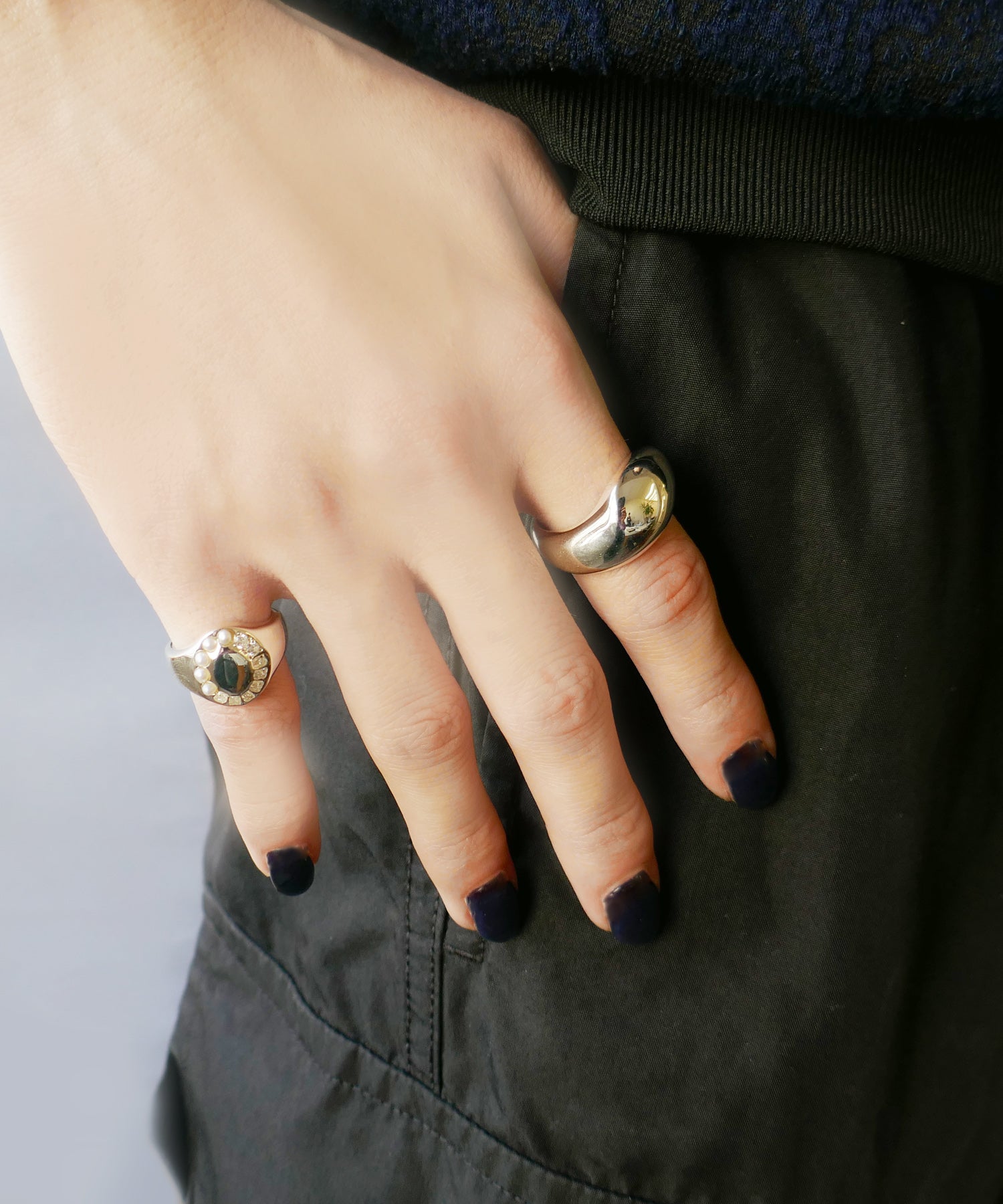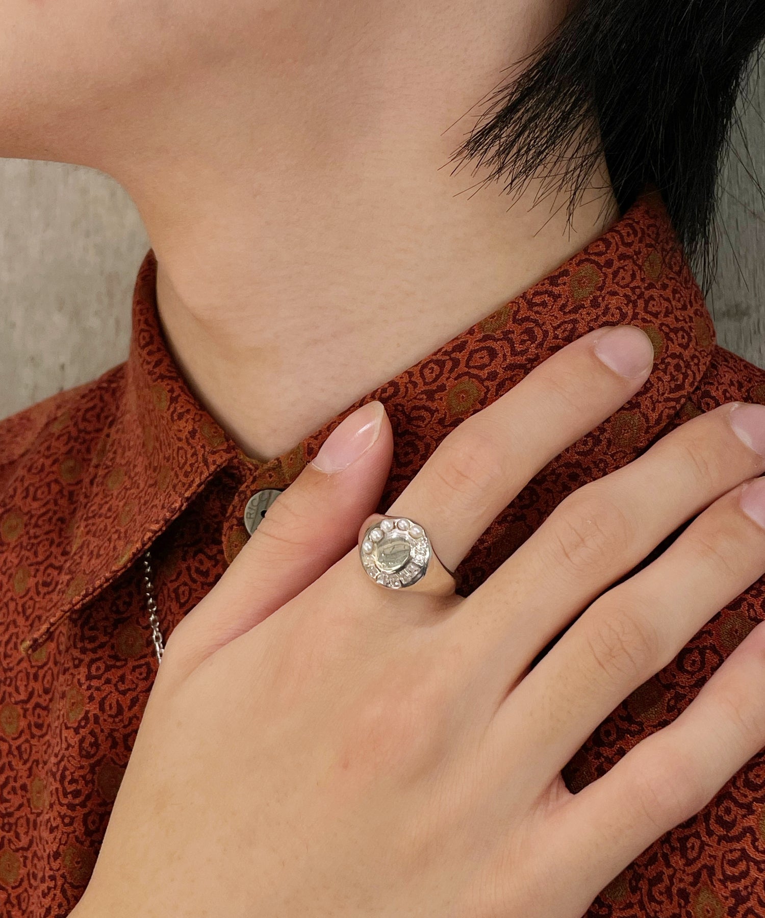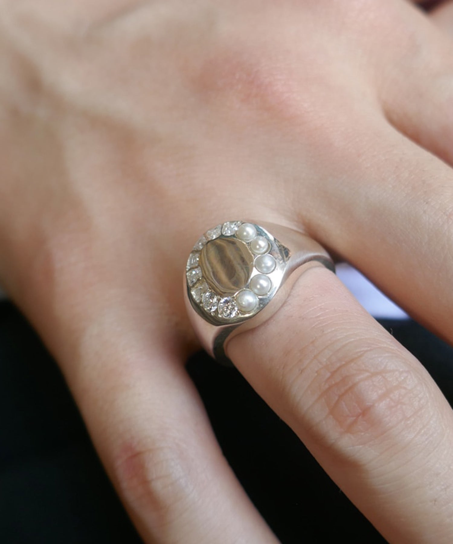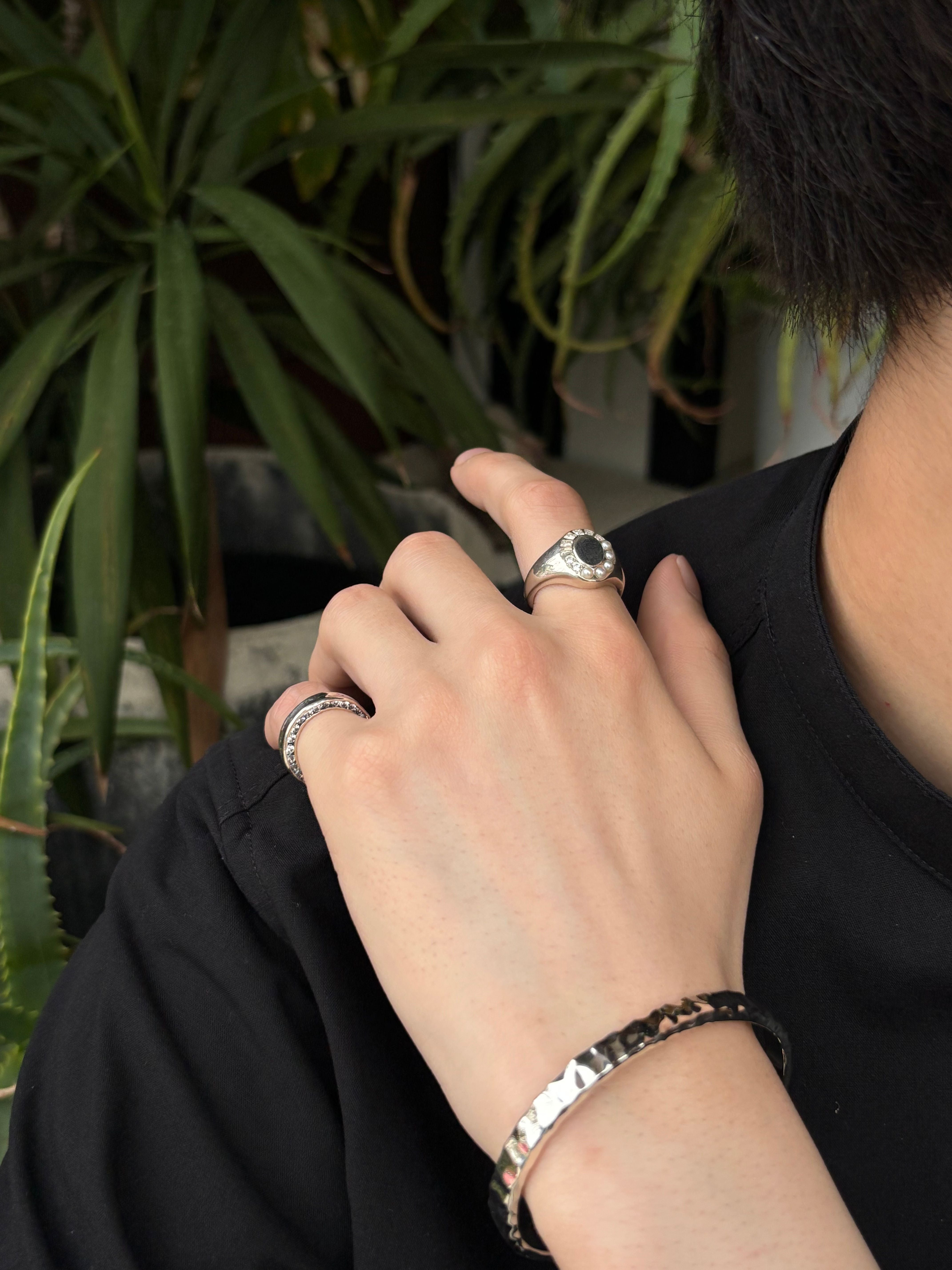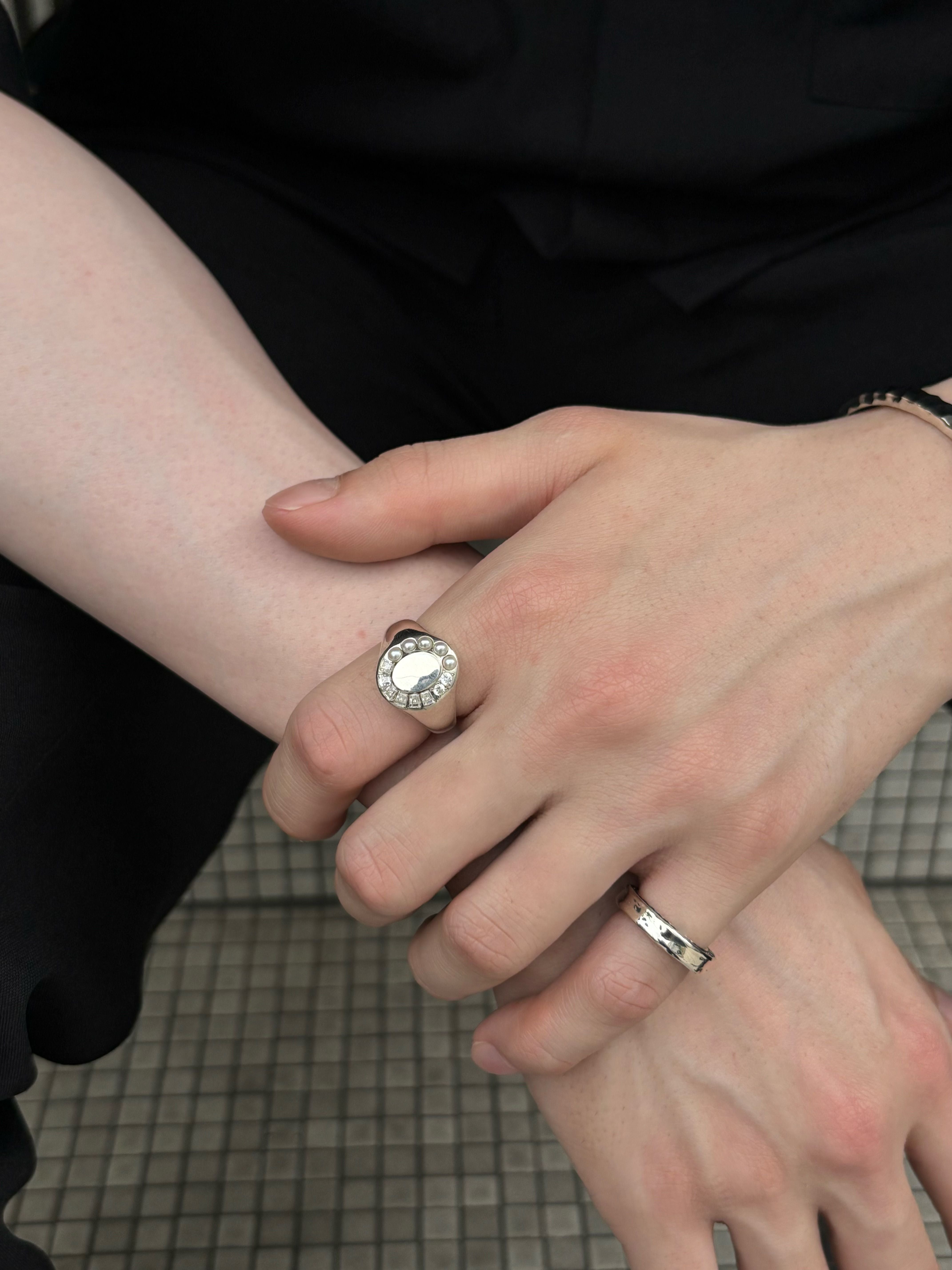 「光」デザイナーが見た景色やモノe.m.というファインダーを通しフラッシュで光らせシャッターを。ジュエリーへとカタチを変えそれぞれが美しく光を放つ。2種類のカットのジルコニアと淡水パールがぴったりとセッティングされた印台のシルバーリング。装飾がありながらも落ち着いた印象で女性はもちろん男性にも着けていただきたいアイテムです。