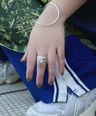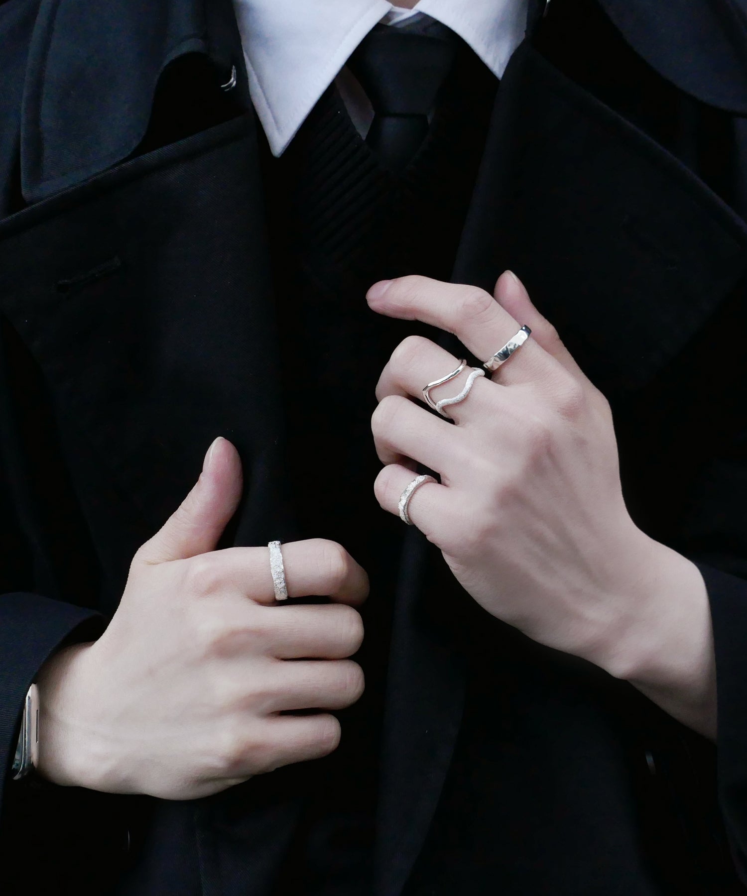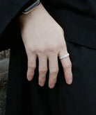 たたき加工でニュアンスを加えたシルバーのアームに、 スターダストのテクスチャーを施したシルバーリング。 内甲丸、またリングの内側は鏡面仕上げにすることで指触りもなめらかです。 シンプルだからこそテクスチャーの風合いが際立ち、コーディネートを華やげます。