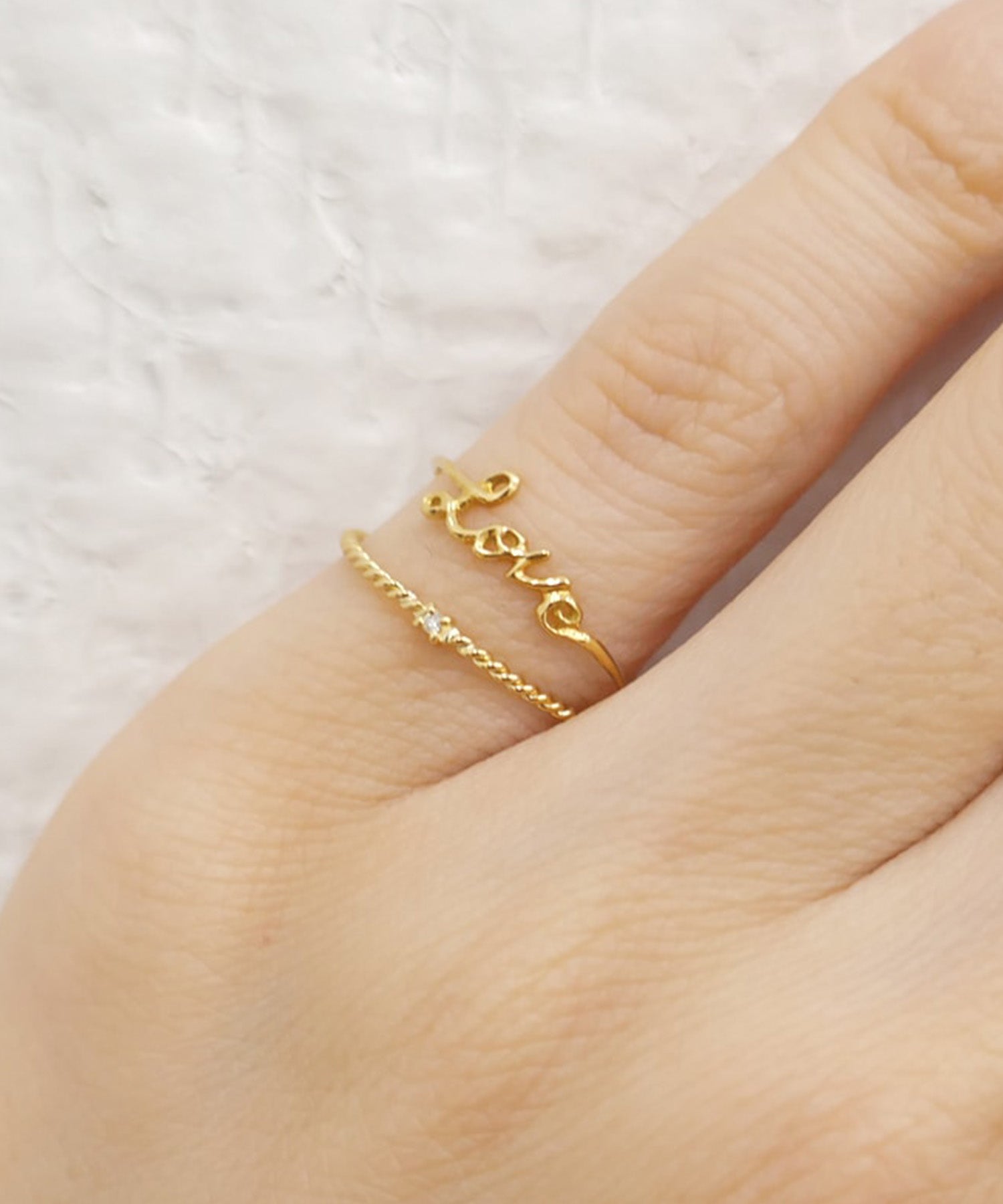 小さなダイヤモンドが1石ついたゴールドのかわいらしいピンキーリング。アーム部分のデザインにもこだわって華奢な中に存在感を感じるアイテムです。