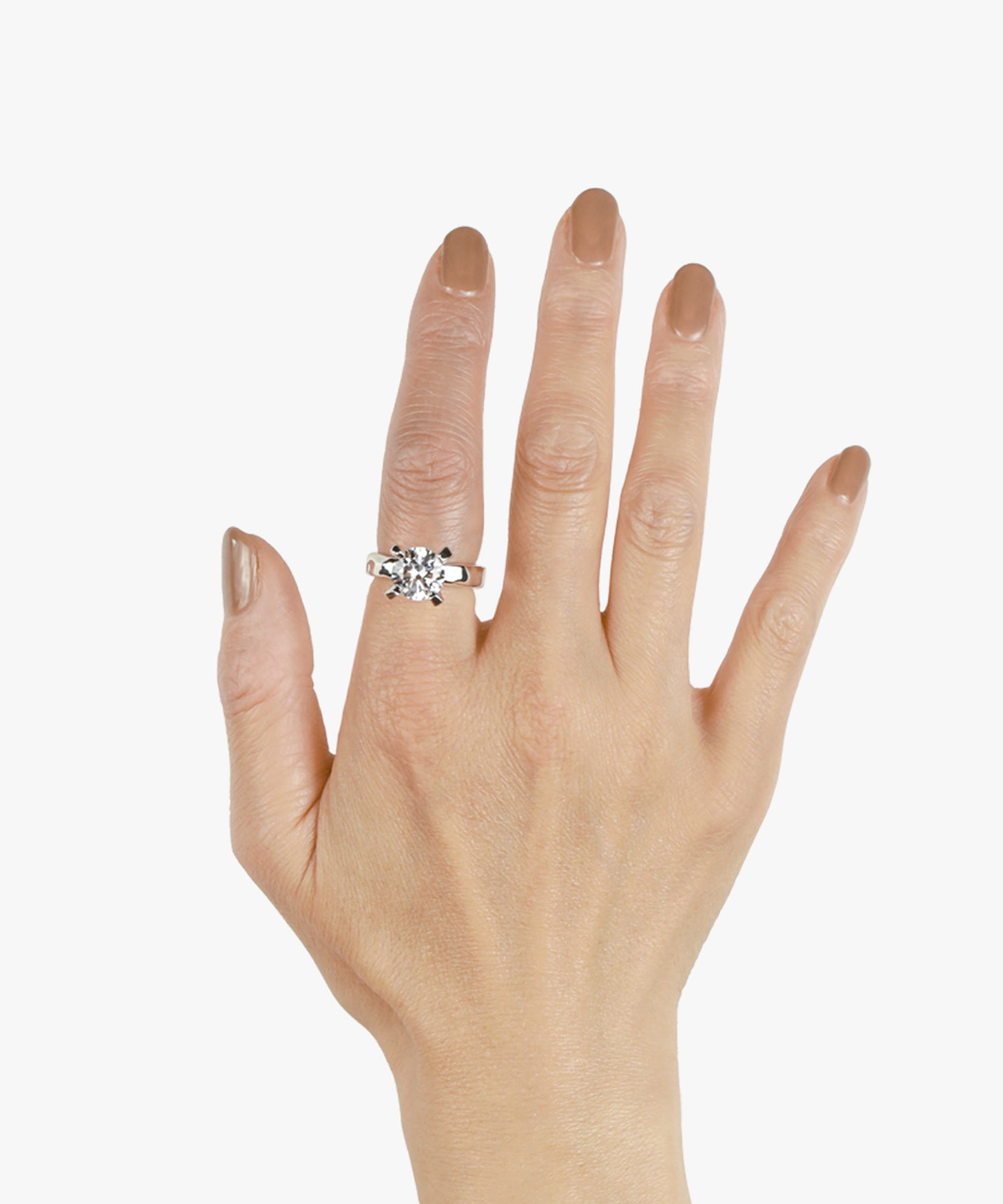 スタンダードなストーン1石のソリティアリングをe.m.の感性で仕立てたデザインは、ストーンを留める爪と石座が特徴的。
