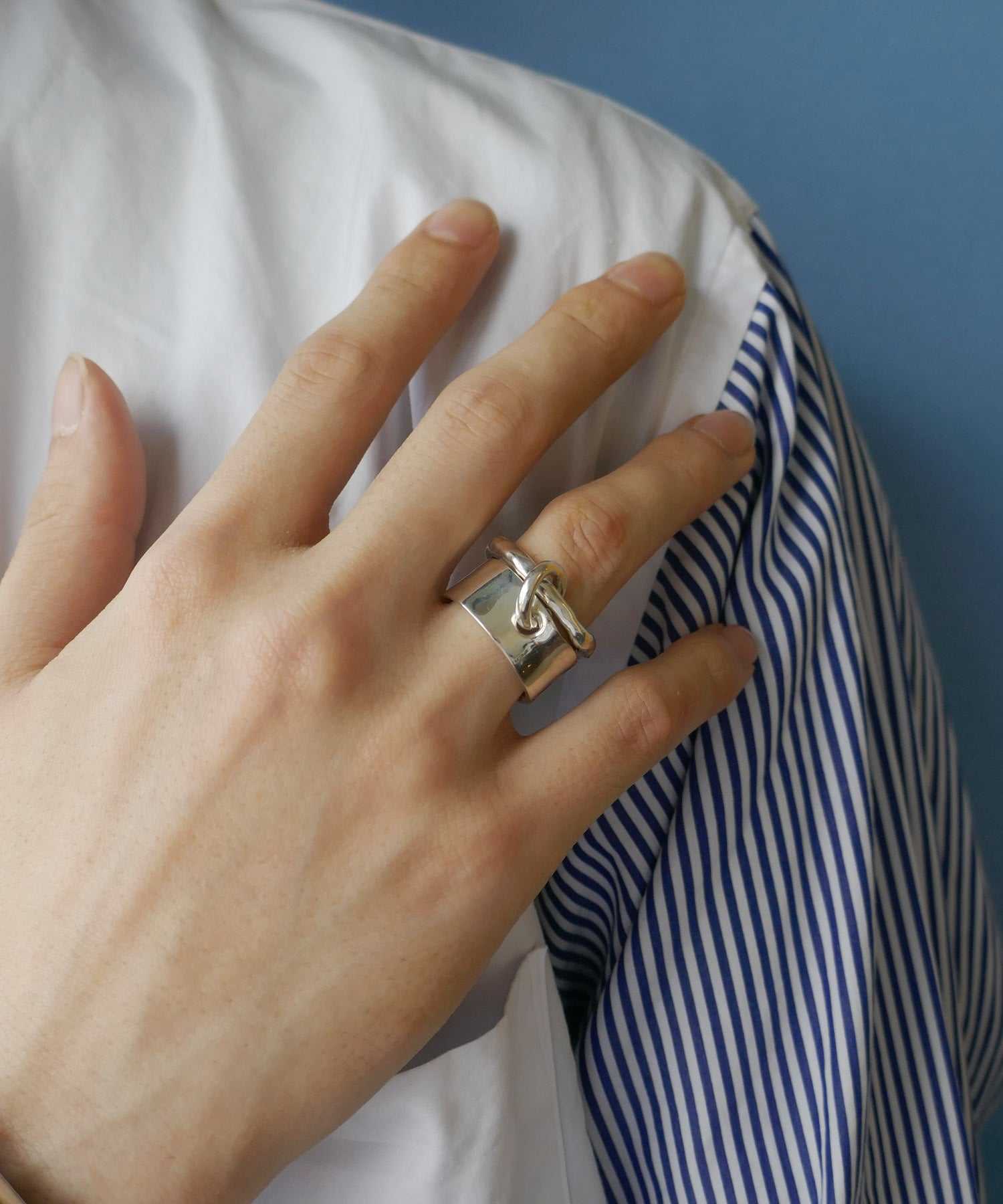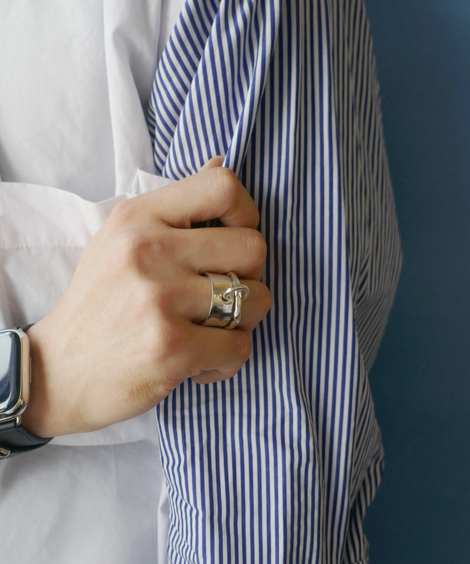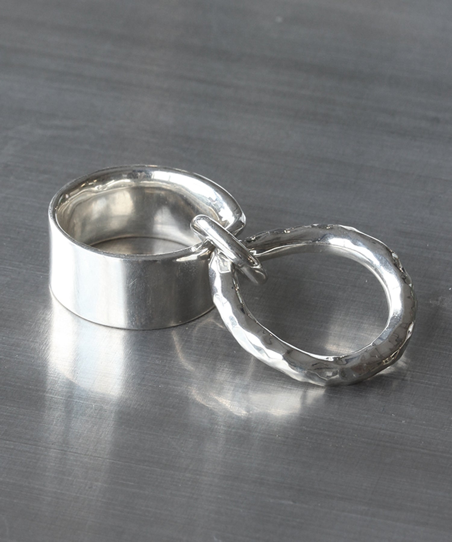 異なるデザインをあわせた2連リングは着け方を変えてお楽しみいただけます。