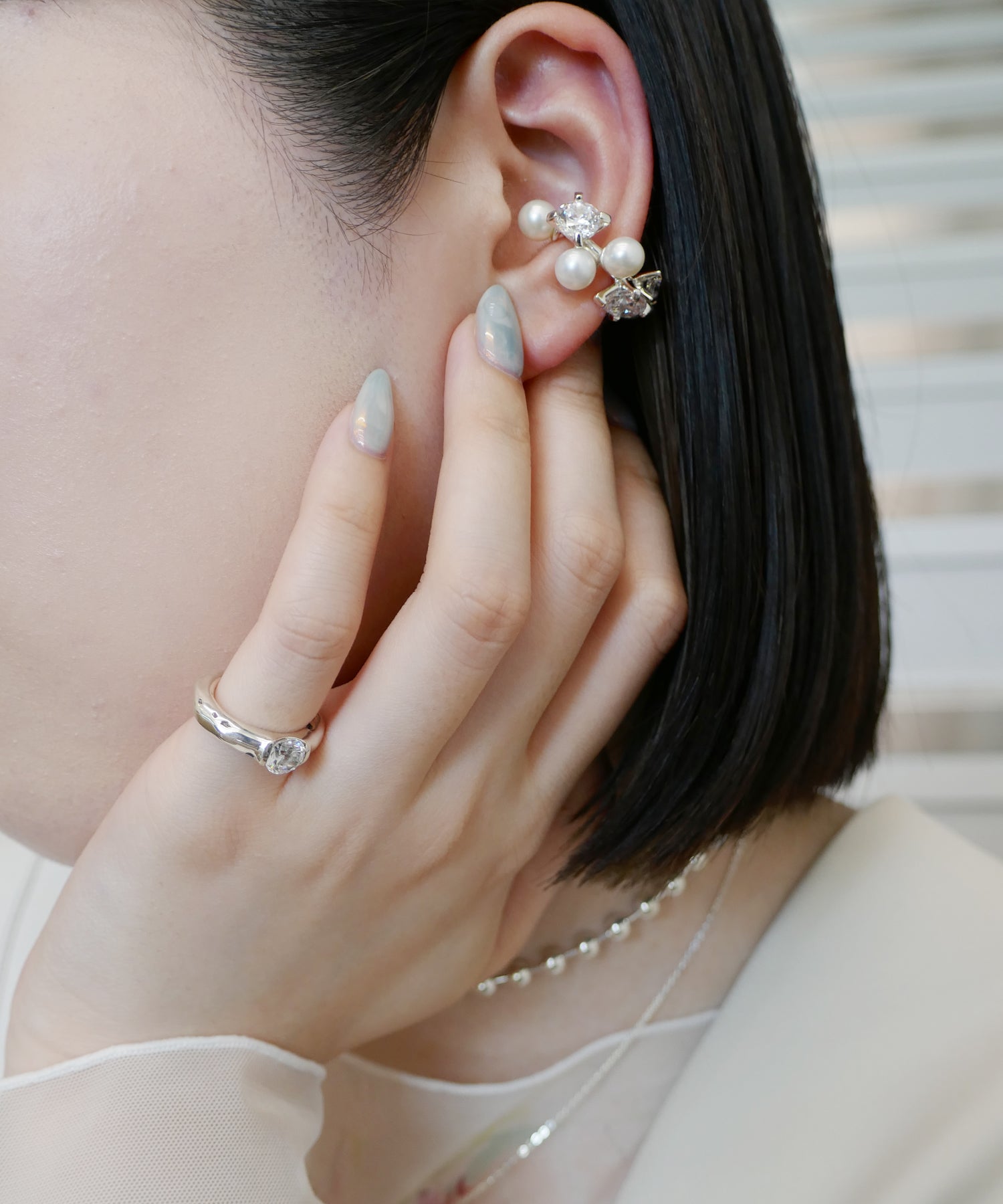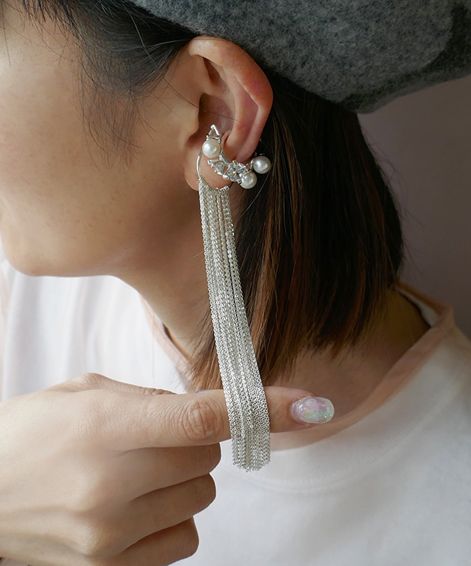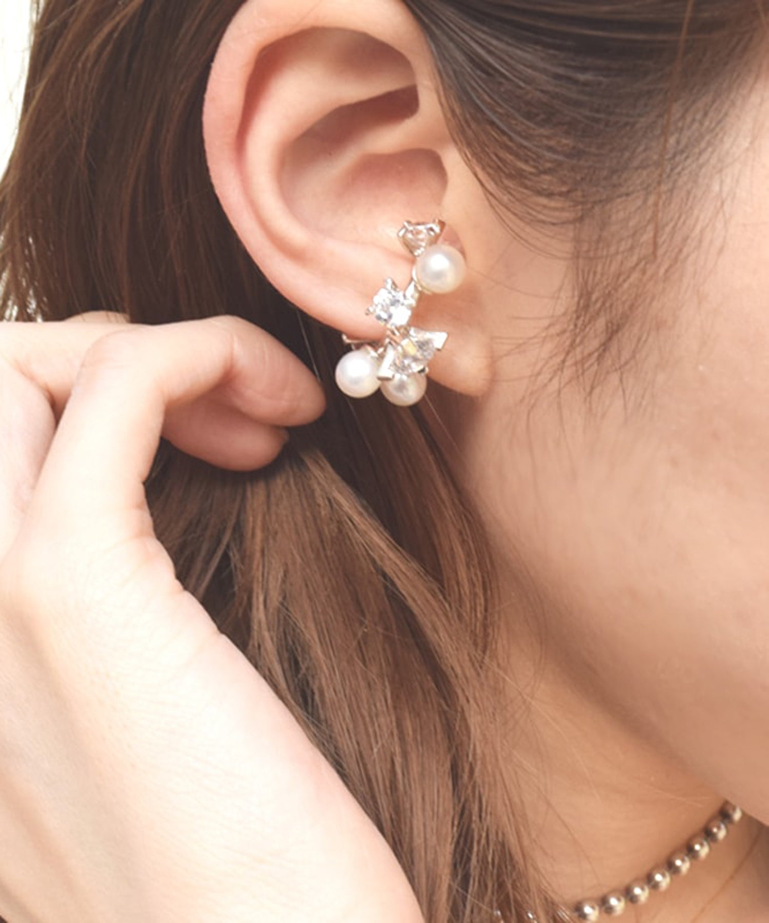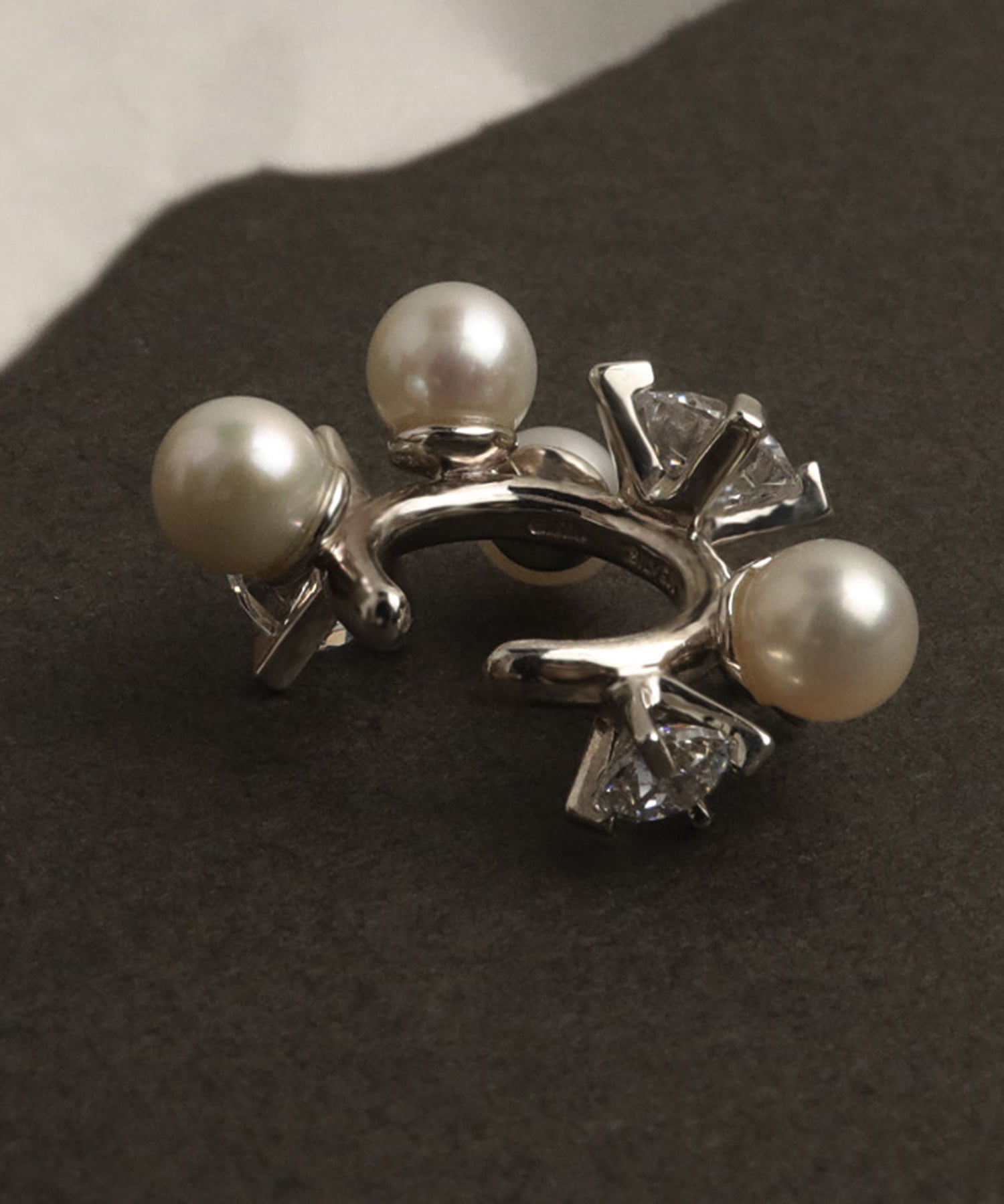 全体にキュービックジルコニアとパールをセッティングしたイヤーカフ。すべての角度からも美しく見えるようにランダムに、 またストーンのサイズも変えることで全体のバランスをとっています。