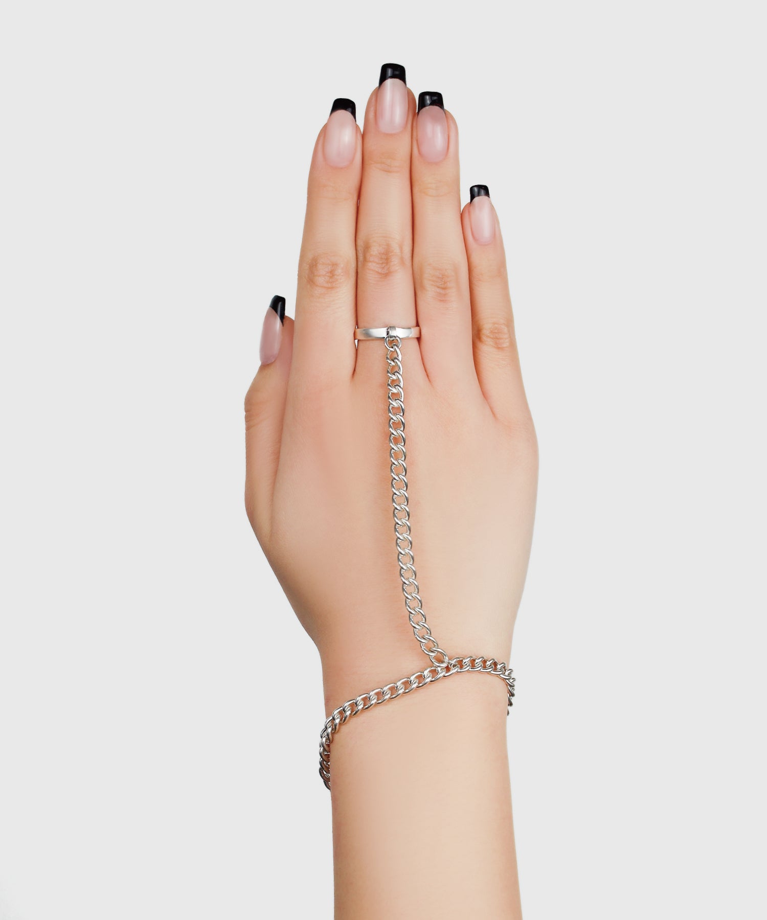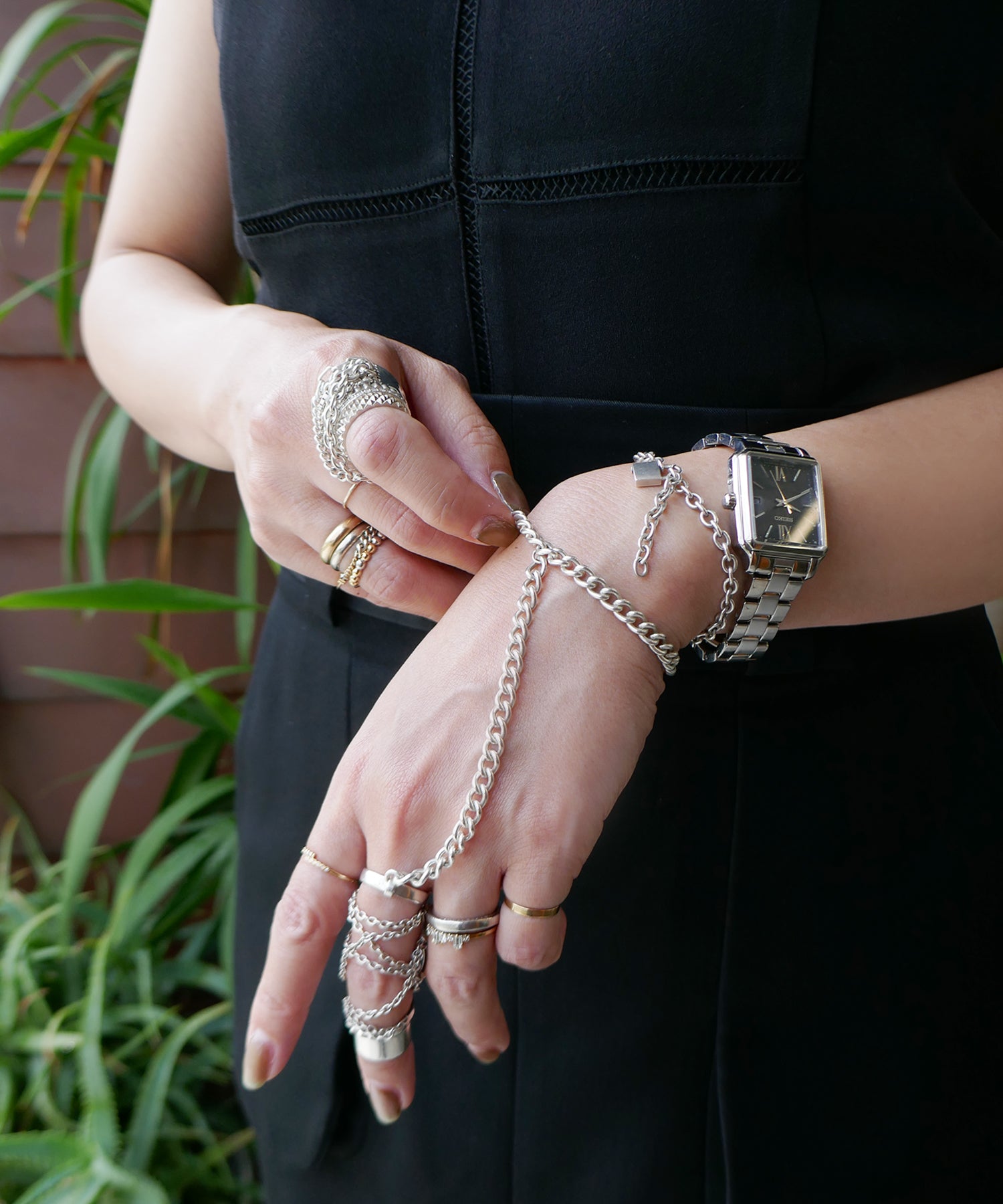 リングとブレスレットの異なるアイテムを組み合わせることで、手の甲がたゆんだチェーンで飾られます。