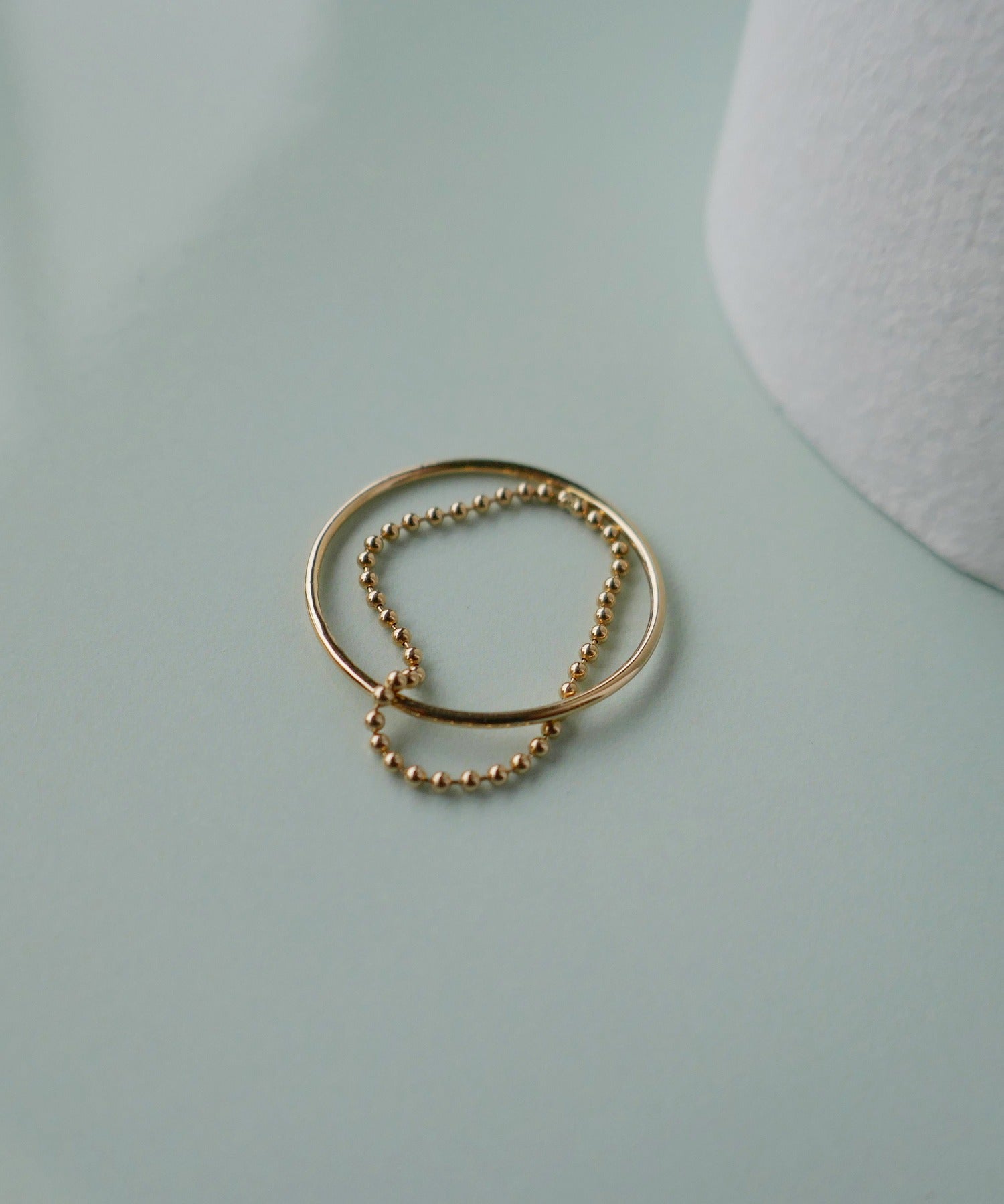 艶を出した仕上げのリングと柔らかい印象のボールチェーンを組み合わせたデザインは、華奢でありながら動きがあることで印象的なリングに。