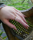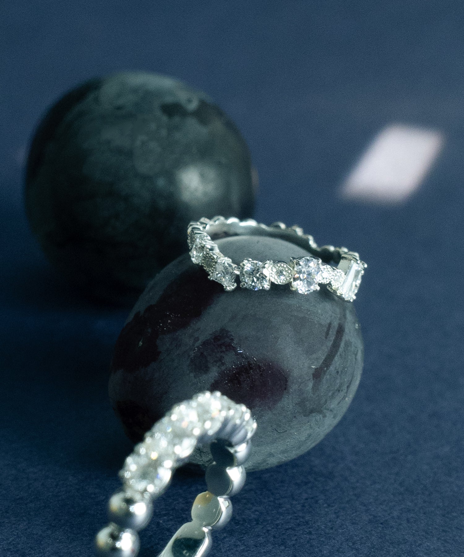 さまざまなカットのキュービックジルコニアがランダムにセッティングされたリング。